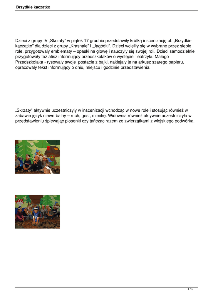 Brzydkie kaczątko Dzieci z grupy IV „Skrzaty” w piątek 17 grudnia przedstawiły krótką inscenizację pt. „Brzydkie kaczątko” dla dzieci z grupy „Krasnale” i „Jagódki”. Dzieci wcieliły się w wybrane przez siebie role, przygotowały emblematy – opaski na głowę i nauczyły się swojej roli. Dzieci samodzielnie przygotowały też afisz informujący przedszkolaków o występie Teatrzyku Małego Przedszkolaka - rysowały swoje postacie z bajki, naklejały je na arkusz szarego papieru, opracowały tekst informujący o dniu, miejscu i godzinie przedstawienia. „Skrzaty” aktywnie uczestniczyły w inscenizacji wchodząc w nowe role i stosując również w zabawie język niewerbalny – ruch, gest, mimikę. Widownia również aktywnie uczestniczyła w przedstawieniu śpiewając piosenki czy tańcząc razem ze zwierzątkami z wiejskiego podwórka. 1/2 Brzydkie kaczątko Opracowała: Lidia Szołdra 2/2