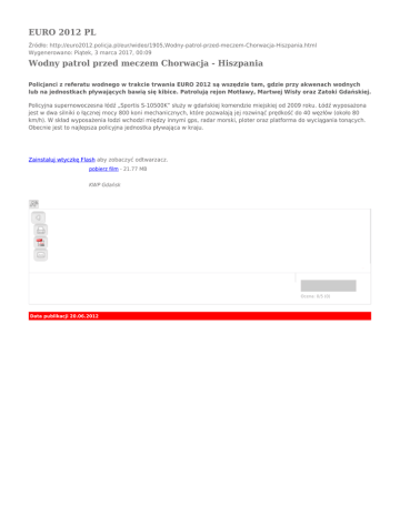EURO 2012 PL Źródło: http://euro2012.policja.pl/eur/wideo/1905,Wodny-patrol-przed-meczem-Chorwacja-Hiszpania.html Wygenerowano: Piątek, 3 marca 2017, 00:09 Wodny patrol przed meczem Chorwacja - Hiszpania Policjanci z referatu wodnego w trakcie trwania EURO 2012 są wszędzie tam, gdzie przy akwenach wodnych lub na jednostkach pływających bawią się kibice. Patrolują rejon Motławy, Martwej Wisły oraz Zatoki Gdańskiej. Policyjna supernowoczesna łódź „Sportis S-10500K” służy w gdańskiej komendzie miejskiej od 2009 roku. Łódź wyposażona jest w dwa silniki o łącznej mocy 800 koni mechanicznych, które pozwalają jej rozwinąć prędkość do 40 węzłów (około 80 km/h). W skład wyposażenia łodzi wchodzi między innymi gps, radar morski, ploter oraz platforma do wyciągania tonących. Obecnie jest to najlepsza policyjna jednostka pływająca w kraju. Zainstaluj wtyczkę Flash aby zobaczyć odtwarzacz. pobierz film - 21.77 MB KWP Gdańsk Ocena: 0/5 (0) Data publikacji 20.06.2012