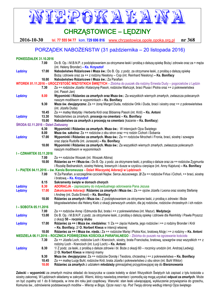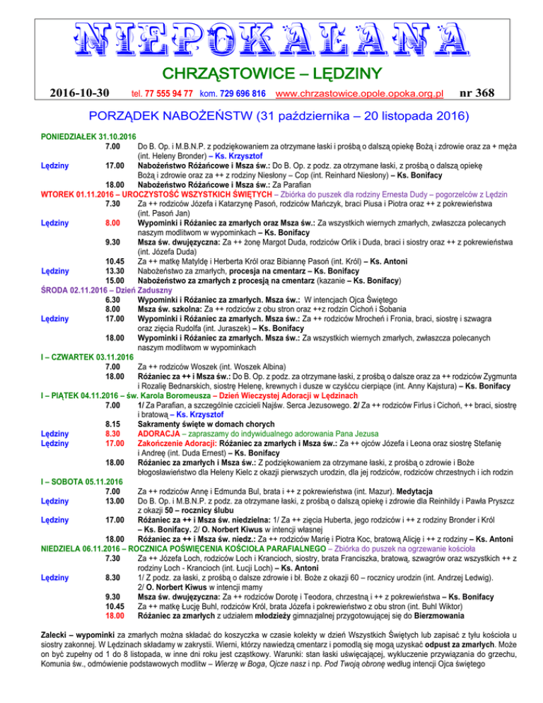 NIEPOKALANA CHRZĄSTOWICE – LĘDZINY 2016-10-30 tel. 77 555 94 77 kom. 729 696 816 www.chrzastowice.opole.opoka.org.pl nr 368 PORZĄDEK NABOŻEŃSTW (31 października – 20 listopada 2016) PONIEDZIAŁEK 31.10.2016 7.00 Do B. Op. i M.B.N.P. z podziękowaniem za otrzymane łaski i prośbą o dalszą opiekę Bożą i zdrowie oraz za + męża (int. Heleny Bronder) – Ks. Krzysztof Lędziny 17.00 Nabożeństwo Różańcowe i Msza św.: Do B. Op. z podz. za otrzymane łaski, z prośbą o dalszą opiekę Bożą i zdrowie oraz za ++ z rodziny Niesłony – Cop (int. Reinhard Niesłony) – Ks. Bonifacy 18.00 Nabożeństwo Różańcowe i Msza św.: Za Parafian WTOREK 01.11.2016 – UROCZYSTOŚĆ WSZYSTKICH ŚWIĘTYCH – Zbiórka do puszek dla rodziny Ernesta Dudy – pogorzelców z Lędzin 7.30 Za ++ rodziców Józefa i Katarzynę Pasoń, rodziców Mańczyk, braci Piusa i Piotra oraz ++ z pokrewieństwa (int. Pasoń Jan) Lędziny 8.00 Wypominki i Różaniec za zmarłych oraz Msza św.: Za wszystkich wiernych zmarłych, zwłaszcza polecanych naszym modlitwom w wypominkach – Ks. Bonifacy 9.30 Msza św. dwujęzyczna: Za ++ żonę Margot Duda, rodziców Orlik i Duda, braci i siostry oraz ++ z pokrewieństwa (int. Józefa Duda) 10.45 Za ++ matkę Matyldę i Herberta Król oraz Bibiannę Pasoń (int. Król) – Ks. Antoni Lędziny 13.30 Nabożeństwo za zmarłych, procesja na cmentarz – Ks. Bonifacy 15.00 Nabożeństwo za zmarłych z procesją na cmentarz (kazanie – Ks. Bonifacy) ŚRODA 02.11.2016 – Dzień Zaduszny 6.30 Wypominki i Różaniec za zmarłych. Msza św.: W intencjach Ojca Świętego 8.00 Msza św. szkolna: Za ++ rodziców z obu stron oraz ++z rodzin Cichoń i Sobania Lędziny 17.00 Wypominki i Różaniec za zmarłych. Msza św.: Za ++ rodziców Mrocheń i Fronia, braci, siostrę i szwagra oraz zięcia Rudolfa (int. Juraszek) – Ks. Bonifacy 18.00 Wypominki i Różaniec za zmarłych. Msza św.: Za wszystkich wiernych zmarłych, zwłaszcza polecanych naszym modlitwom w wypominkach I – CZWARTEK 03.11.2016 7.00 Za ++ rodziców Woszek (int. Woszek Albina) 18.00 Różaniec za ++ i Msza św.: Do B. Op. z podz. za otrzymane łaski, z prośbą o dalsze oraz za ++ rodziców Zygmunta i Rozalię Bednarskich, siostrę Helenę, krewnych i dusze w czyśćcu cierpiące (int. Anny Kajstura) – Ks. Bonifacy I – PIĄTEK 04.11.2016 – św. Karola Boromeusza – Dzień Wieczystej Adoracji w Lędzinach 7.00 1/ Za Parafian, a szczególnie czcicieli Najśw. Serca Jezusowego. 2/ Za ++ rodziców Firlus i Cichoń, ++ braci, siostrę i bratową – Ks. Krzysztof 8.15 Sakramenty święte w domach chorych Lędziny 8.30 ADORACJA – zapraszamy do indywidualnego adorowania Pana Jezusa Lędziny 17.00 Zakończenie Adoracji: Różaniec za zmarłych i Msza św.: Za ++ ojców Józefa i Leona oraz siostrę Stefanię i Andreę (int. Duda Ernest) – Ks. Bonifacy 18.00 Różaniec za zmarłych i Msza św.: Z podziękowaniem za otrzymane łaski, z prośbą o zdrowie i Boże błogosławieństwo dla Heleny Kielc z okazji pierwszych urodzin, dla jej rodziców, rodziców chrzestnych i ich rodzin I – SOBOTA 05.11.2016 7.00 Za ++ rodziców Annę i Edmunda Bul, brata i ++ z pokrewieństwa (int. Mazur). Medytacja Lędziny 13.00 Do B. Op. i M.B.N.P. z podz. za otrzymane łaski, z prośbą o dalszą opiekę i zdrowie dla Reinhildy i Pawła Pryszcz z okazji 50 – rocznicy ślubu Lędziny 17.00 Różaniec za ++ i Msza św. niedzielna: 1/ Za ++ zięcia Huberta, jego rodziców i ++ z rodziny Bronder i Król – Ks. Bonifacy. 2/ O. Norbert Kiwus w intencji własnej 18.00 Różaniec za ++ i Msza św. niedz.: Za ++ rodziców Marię i Piotra Koc, bratową Alicję i ++ z rodziny – Ks. Antoni NIEDZIELA 06.11.2016 – ROCZNICA POŚWIĘCENIA KOŚCIOŁA PARAFIALNEGO – Zbiórka do puszek na ogrzewanie kościoła 7.30 Za ++ Józefa Loch, rodziców Loch i Krancioch, siostry, brata Franciszka, bratową, szwagrów oraz wszystkich ++ z rodziny Loch - Krancioch (int. Łucji Loch) – Ks. Antoni Lędziny 8.30 1/ Z podz. za łaski, z prośbą o dalsze zdrowie i bł. Boże z okazji 60 – rocznicy urodzin (int. Andrzej Ledwig). 2/ O. Norbert Kiwus w intencji mamy 9.30 Msza św. dwujęzyczna: Za ++ rodziców Dorotę i Teodora, chrzestną i ++ z pokrewieństwa – Ks. Bonifacy 10.45 Za ++ matkę Łucję Buhl, rodziców Król, brata Józefa i pokrewieństwo z obu stron (int. Buhl Wiktor) 18.00 Różaniec za zmarłych z udziałem młodzieży gimnazjalnej przygotowującej się do Bierzmowania Zalecki – wypominki za zmarłych można składać do koszyczka w czasie kolekty w dzień Wszystkich Świętych lub zapisać z tyłu kościoła u siostry zakonnej. W Lędzinach składamy w zakrystii. Wierni, którzy nawiedzą cmentarz i pomodlą się mogą uzyskać odpust za zmarłych. Może on być zupełny od 1 do 8 listopada, w inne dni roku jest cząstkowy. Warunki: stan łaski uświęcającej, wykluczenie przywiązania do grzechu, Komunia św., odmówienie podstawowych modlitw – Wierzę w Boga, Ojcze nasz i np. Pod Twoją obronę według intencji Ojca świętego PONIEDZIAŁEK 07.11.2016 7.00 Za ++ rodziców Malek i Woszek, ich rodziców, siostrę, Brygidę i Franciszkę Malek oraz dusze w czyśćcu cierpiące Lędziny 17.00 Różaniec za zmarłych i Msza św.: Do B. Op. i M.B.N.P. z podziękowaniem za otrzymane łaski i prośbą o dalszą opiekę, zdrowie i bł. Boże oraz za + męża Wernera (int. Gonsior Jadwiga) – Ks. Bonifacy 18.00 Różaniec za zmarłych i Msza św.: Do M.B.N.P. z okazji urodzin (w pewnej intencji) WTOREK 08.11.2016 7.00 Do B. Op. i M.B.N.P. z podz. za otrzymane łaski, z prośbą o dalsze zdrowie i za + męża Jana (int. Panic) Lędziny 17.00 Różaniec za zmarłych i Msza św.: Do B.Op. z podz. za łaski, z prośbą o dalsze (int. Janik) – Ks. Bonifacy 18.00 Różaniec za zmarłych i Msza św.: Do B. Op. oraz za ++ męża Rocha, szwagra Jana i brata Józefa oraz rodziców Ciasto i Loch (int. Ciasto) ŚRODA 09.11.2016 