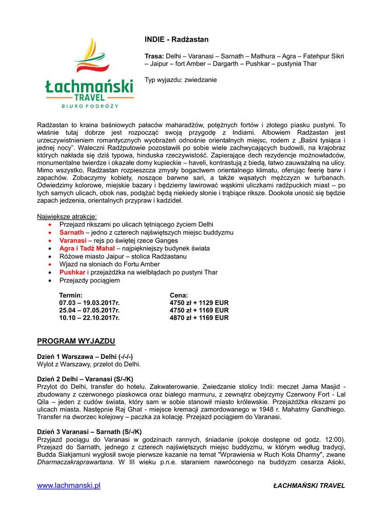 INDIE - Radżastan Trasa: Delhi – Varanasi – Sarnath – Mathura – Agra – Fatehpur Sikri – Jaipur – fort Amber – Dargarth – Pushkar – pustynia Thar Typ wyjazdu: zwiedzanie Radżastan to kraina baśniowych pałaców maharadżów, potężnych fortów i złotego piasku pustyni. To właśnie tutaj dobrze jest rozpocząć swoją przygodę z Indiami. Albowiem Radżastan jest urzeczywistnieniem romantycznych wyobrażeń odnośnie orientalnych miejsc, rodem z „Baśni tysiąca i jednej nocy”. Waleczni Radźputowie pozostawili po sobie wiele zachwycających budowili, na krajobraz których nakłada się dziś typowa, hinduska rzeczywistość. Zapierające dech rezydencje możnowładców, monumentalne twierdze i okazałe domy kupieckie – haveli, kontrastują z biedą, łatwo zauważalną na ulicy. Mimo wszystko, Radżastan rozpieszcza zmysły bogactwem orientalnego klimatu, oferując feerię barw i zapachów. Zobaczymy kobiety, noszące barwne sari, a także wąsatych mężczyzn w turbanach. Odwiedzimy kolorowe, miejskie bazary i będziemy lawirować wąskimi uliczkami radźpuckich miast – po tych samych ulicach, obok nas, podążać będą niekiedy słonie i trąbiące riksze. Dookoła unosić się będzie zapach jedzenia, orientalnych przypraw i kadzideł. Największe atrakcje: Przejazd rikszami po ulicach tętniącego życiem Delhi Sarnath – jedno z czterech najświętszych miejsc buddyzmu Varanasi – rejs po świętej rzece Ganges Agra i Tadź Mahal – najpiękniejszy budynek świata Różowe miasto Jaipur – stolica Radżastanu Wjazd na słoniach do Fortu Amber Pushkar i przejażdżka na wielbłądach po pustyni Thar Przejazdy pociągiem Termin: 07.03 – 19.03.2017r. 25.04 – 07.05.2017r. 10.10 – 22.10.2017r. Cena: 4750 zł + 1129 EUR 4750 zł + 1169 EUR 4870 zł + 1169 EUR PROGRAM WYJAZDU Dzień 1 Warszawa – Delhi (-/-/-) Wylot z Warszawy, przelot do Delhi. Dzień 2 Delhi – Varanasi (S/-/K) Przylot do Delhi, transfer do hotelu. Zakwaterowanie. Zwiedzanie stolicy Indii: meczet Jama Masjid zbudowany z czerwonego piaskowca oraz białego marmuru, z zewnątrz obejrzymy Czerwony Fort - Lal Qila – jeden z cudów świata, który sam w sobie stanowił miasto królewskie. Przejażdżka rikszami po ulicach miasta. Następnie Raj Ghat - miejsce kremacji zamordowanego w 1948 r. Mahatmy Gandhiego. Transfer na dworzec kolejowy – paczka za kolację. Przejazd pociągiem do Varanasi. Dzień 3 Varanasi – Sarnath (S/-/K) Przyjazd pociągu do Varanasi w godzinach rannych, śniadanie (pokoje dostępne od godz. 12:00). Przejazd do Sarnath, jednego z czterech najświętszych miejsc buddyzmu, w którym według tradycji, Budda Siakjamuni wygłosił swoje pierwsze kazanie na temat "Wprawienia w Ruch Koła Dharmy", zwane Dharmaczakraprawartana. W III wieku p.n.e. staraniem nawróconego na buddyzm cesarza Aśoki, www.lachmanski.pl ŁACHMAŃSKI TRAVEL wzniesiono w Sarnath m.in. kompleks klasztorny, figurującą we współczesnym godle kolumnę oraz wysoką na 34 metry stupę Dhamekh. Zwiedzanie Varanasi, które rozciąga się wzdłuż zachodniego brzegu Gangesu, w Północnych Indiach, w stanie Uttar Pradesh. Znane jest także pod nazwą Benares. Rejs łodziami po rzece Ganges o zachodzie słońca. Kolacja w lokalnej restauracji. Nocleg w Varanasi. Dzień 4 Varanasi – Mathura (S/-/K) O wschodzie słońca rejs łodziami po świętej rzece Ganges oraz spacer po ghatach, gdzie Bramini oferują błogosławieństwo, żebracy proszą o jałmużnę, dając innym możliwość poprawienia swojej karmy; wreszcie na ghaty przybywają kondukty pogrzebowe, by dokonać kremacji zmarłych, którzy z tego najlepszego w Indiach miejsca udają się w swoją ostatnią podróż. Kontynuujemy spacer po starym mieście i podziwiamy Złotą Świątynię. Powrót do hotelu na śniadanie. Po śniadaniu dalsze zwiedzanie Varanasi. Według legendy Varanasi zostało założone przez Śiwę. Miasto jest co roku odwiedzane przez miliony wiernych, gromadzących się na brzegu rzeki w celu rytualnych ablucji, mających na celu oczyszczenie się z grzechów. Następnie wizyta w jednej z fabryk jedwabiu, z których słynie Varanasi. Wieczorem transfer na dworzec kolejowy – paczka za kolację. Przejazd nocnym pociągiem do Mathura. Dzień 5 Mathura – Agra (S/-/K) Przyjazd pociągu do Mathura w godzinach rannych, śniadanie. Zwiedzanie Mathura, jednego z najstarszych miast Indii, które powstało w IV w. p.n.e., a wzmiankowane było w Mahabharacie. Zobaczymy położony nad rzeką Jamuną ghat Wisram, obok którego znajduje się Wieża Sati, upamiętniająca samospalenie się wdowy Behari Mai, wybudowana przez jej syna. Przejazd do Agry. Kolacja i nocleg w Agrze. Dzień 6 Agra (S/-/K) Zwiedzanie Agry - to właśnie tutaj znajduje się uznawany za najpiękniejszy na świecie budynek - Tadż Mahal - został wzniesiony przez Szahdżahana nad brzegiem rzeki Jamuny, dla upamiętnienia ukochanej żony Mumtal Mahal. Wejście prowadzi przez ogromną Bramę Saraceńską, wykonaną z czerwonego piaskowca. Następnie zwiedzimy Itimad-ud-Daulah – grobowiec Ghiyas Beg, który był ministrem Jehangirsa, a jego piękna córka poślubiła cesarza i zdobyła popularność jako Noor Jahan. Zwiedzimy również Czerwony Fort, w którym przez 9 lat, do swojej śmierci, przebywał budowniczy Tadż Mahal Szahdżahan, więziony przez swojego syna, który to sam ogłosił się cesarzem imperium. Kolacja w lokalnej restauracji. Nocleg w Agrze. Dzień 7 Fatehpur Sikri – Jaipur (S/-/K) Wyjazd w kierunku Jaipur (252 km). Po drodze zwiedzanie Fatehpur Sikri - miasta zbudowanego za panowania Cesarza Akbara w latach 1570 – 1585, które było dawną stolicą imperium. Przejazd do Jaipuru – stolicy Radżastanu, który od 1883 roku nazwany jest „różowym miastem”. To na cześć wizyty księcia Alberta, gdy kazano pomalować całe miasto na powitalny kolor różowy. Na murach starówki kolor ten przetrwał do dziś. Kolacja i nocle