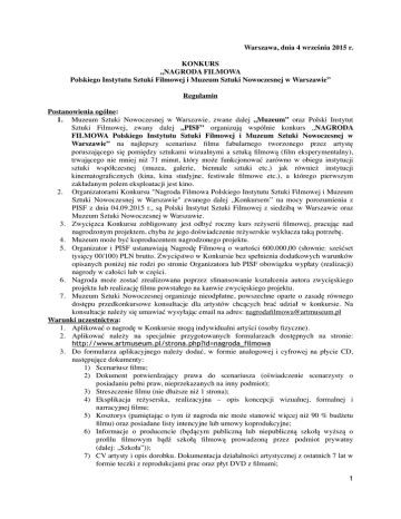 Warszawa, dnia 4 września 2015 r. KONKURS „NAGRODA FILMOWA Polskiego Instytutu Sztuki Filmowej i Muzeum Sztuki Nowoczesnej w Warszawie” Regulamin Postanowienia ogólne: 1. Muzeum Sztuki Nowoczesnej w Warszawie, zwane dalej „Muzeum” oraz Polski Instytut Sztuki Filmowej, zwany dalej „PISF” organizują wspólnie konkurs „NAGRODA FILMOWA Polskiego Instytutu Sztuki Filmowej i Muzeum Sztuki Nowoczesnej w Warszawie” na najlepszy scenariusz filmu fabularnego tworzonego przez artystę poruszającego się pomiędzy sztukami wizualnymi a sztuką filmową (film eksperymentalny), trwającego nie mniej niż 71 minut, który może funkcjonować zarówno w obiegu instytucji sztuki współczesnej (muzea, galerie, biennale sztuki etc.) jak również instytucji kinematograficznych (kina, kina studyjne, festiwale filmowe etc.), a którego pierwszym zakładanym polem eksploatacji jest kino. 2. Organizatorami Konkursu "Nagroda Filmowa Polskiego Instytutu Sztuki Filmowej i Muzeum Sztuki Nowoczesnej w Warszawie" zwanego dalej ,,Konkursem’’ na mocy porozumienia z PISF z dnia 04.09.2015 r., są Polski Instytut Sztuki Filmowej z siedzibą w Warszawie oraz Muzeum Sztuki Nowoczesnej w Warszawie. 3. Zwycięzca Konkursu zobligowany jest odbyć roczny kurs reżyserii filmowej, pracując nad nagrodzonym projektem, chyba że jego doświadczenie reżyserskie wyklucza taką potrzebę. 4. Muzeum może być koproducentem nagrodzonego projektu. 5. Organizator i PISF ustanawiają Nagrodę Filmową o wartości 600.000,00 (słownie: sześćset tysięcy 00/100) PLN brutto. Zwycięstwo w Konkursie bez spełnienia dodatkowych warunków opisanych poniżej nie rodzi po stronie Organizatora lub PISF obowiązku wypłaty (realizacji) nagrody w całości lub w części. 6. Nagroda może zostać zrealizowana poprzez sfinansowanie kształcenia autora zwycięskiego projektu lub realizację filmu powstałego na kanwie zwycięskiego projektu. 7. Muzeum Sztuki Nowoczesnej organizuje nieodpłatne, powszechne oparte o zasadę równego dostępu przedkonkursowe konsultacje dla artystów chcących brać udział w konkursie. Na konsultacje należy się umawiać wysyłając email na adres: [email protected] Warunki uczestnictwa: 1. Aplikować o nagrodę w Konkursie mogą indywidualni artyści (osoby fizyczne). 2. Aplikować należy na specjalnie przygotowanych formularzach dostępnych na stronie: http://www.artmuseum.pl/strona.php?id=nagroda_filmowa 3. Do formularza aplikacyjnego należy dodać, w formie analogowej i cyfrowej na płycie CD, następujące dokumenty: 1) Scenariusz filmu; 2) Dokument potwierdzający prawa do scenariusza (oświadczenie scenarzysty o posiadaniu pełni praw, nieprzekazanych na inny podmiot); 3) Streszczenie filmu (nie dłuższe niż 1 strona); 4) Eksplikacja reżyserska, realizacyjna – opis koncepcji wizualnej, formalnej i narracyjnej filmu; 5) Kosztorys (pamiętając o tym iż nagroda nie może stanowić więcej niż 90 % budżetu filmu) oraz posiadane listy intencyjne lub umowy koprodukcyjne; 6) Informacje o producencie (będącym publiczną lub niepubliczną szkołą wyższą o profilu filmowym bądź szkołą filmową prowadzoną przez podmiot prywatny (dalej: ,,Szkoła”)); 7) CV artysty i opis dorobku. Dokumentacja działalności artystycznej z ostatnich 7 lat w formie teczki z reprodukcjami prac oraz płyt DVD z filmami; 1 8) Deklaracja o możliwości podjęcia kursu reżyserskiego w Studiu Prób w Mistrzowskiej Szkole Reżyserii Filmowej Andrzeja Wajdy; 9) zgodę na przetwarzanie danych osobowych dla celów konkursu; 10) zgodę na podanie do wiadomości publicznej informacji o uczestnictwie w konkursie oraz o uzyskanej ocenie zgłoszonego projektu; 11) oświadczenia o akceptacji Regulaminu. 4. Złożenie formularza aplikacyjnego oznacza zapoznanie się z regulaminem Konkursu oraz akceptację jego warunków bez zastrzeżeń Terminy i procedura zgłaszania: 1. Termin nadsyłania propozycji konkursowych mija 31 października 2015 r. Ogłoszenie wyników nastąpi do 30 listopada 2015 r. 2. Zgłoszenia powinny być dostarczone na adres Muzeum Sztuki Nowoczesnej w Warszawie, ul. Pańska 3, 00-124 Warszawa, z dopiskiem Nagroda Filmowa w nieprzekraczalnym terminie do 31 października 2015 roku. UWAGA: za datę zgłoszenia uznaje się datę wpływu zgłoszenia do Muzeum. O zachowaniu terminu nie decyduje data stempla pocztowego. 3. Na wszelkie pytania dotyczące konkursu odpowiada Muzeum. Wszelkie zapytania prosimy kierować na email: [email protected] 4. Projekty nadesłane do Konkursu będą znajdowały się w siedzibie Muzeum, ale nie będą upubliczniane, w zakresie szerszym, niż konieczny dla prawidłowego przebiegu Konkursu, chyba że obowiązek taki będzie wynikał z przepisów prawa powszechnie obowiązującego. Rozstrzygnięcie konkursu: 1. Ocena nadesłanych zgłoszeń dokonana będzie przez Komisję Ekspercką powołaną przez Muzeum oraz PISF. Skład Komisji Eksperckiej zostanie ujawniony na stronie internetowej Muzeum i PISF wraz z ogłoszeniem wyników Konkursu. 2. Wyboru laureata dokonuje Komisja Ekspercka składająca się z 4 osób i złożona w połowie z ekspertów PISF, a w połowie zaproponowanych przez Muzeum. 3. Konkurs jest dwuetapowy. Pierwszy etap polega na selekcji kilku najciekawszych projektów, których autorzy zostaną zaproszeni do drugiego etapu konkursu mającego kształt rozmowy pomiędzy artystą a członkami jury. 4. Organizatorzy zastrzegają sobie prawo do niewyłonienia laureata, jeżeli Komisja Ekspercka uzna, iż zgłoszenia nie odpowiadają warunkom formalnym lub merytorycznym. 5. Rozstrzygnięcie Konkursu zostanie opublikowane na stronie internetowej Muzeum www.artmuseum.pl do dnia 30 listopada 2015 r. oraz na stronie PISF www.pisf.pl. Rozstrzygnięcie konkursu zostanie opublikowane w formie tekstu zawierającego rozszerzoną i dogłębną formułę uzasadnienia wyboru. Informację o przyznaniu lub nie przyznaniu nagrody jako pierwsi otrzymają (drogą e-