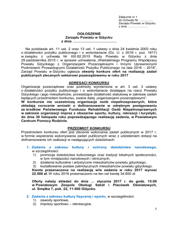 Załącznik nr 1 do Uchwały Nr …............. Zarządu Powiatu w GiŜycku z dnia ………………… OGŁOSZENIE Zarządu Powiatu w GiŜycku z dnia ………………………………. Na podstawie art. 11 ust. 2 oraz 13 ust. 1 ustawy z dnia 24 kwietnia 2003 roku o działalności poŜytku publicznego i o wolontariacie (Dz. U. z 2016 r. poz. 1817) w związku z uchwałą Nr XIII.82.2015 Rady Powiatu w GiŜycku z dnia 29 października 2015 r. w sprawie uchwalenia „Wieloletniego Programu Współpracy Powiatu GiŜyckiego z Organizacjami Pozarządowymi i Innymi Uprawnionymi Podmiotami Prowadzącymi Działalność PoŜytku Publicznego na lata 2016 – 2018”, Zarząd Powiatu w GiŜycku ogłasza otwarty konkurs ofert na realizację zadań publicznych zlecanych sektorowi pozarządowemu w roku 2017 ADRESACI KONKURSU Organizacje pozarządowe oraz podmioty wymienione w art. 3 ust. 3 ustawy o działalności poŜytku publicznego i o wolontariacie działające na rzecz Powiatu GiŜyckiego i jego mieszkańców, prowadzące działalność statutową w zakresie zadań będących przedmiotem konkursu, zwane dalej „organizacjami pozarządowymi”. W konkursie nie uczestniczą organizacje osób niepełnosprawnych, które składają corocznie wnioski o dofinansowanie w odrębnym postępowaniu ze środków Państwowego Funduszu Rehabilitacji Osób Niepełnosprawnych w zakresie organizacji imprez z obszarów sportu, kultury, rekreacji i turystyki, do dnia 30 listopada roku poprzedzającego realizację zadania, w Powiatowym Centrum Pomocy Rodzinie. PRZEDMIOT KONKURSU Przedmiotem konkursu ofert jest zlecenie wykonania zadań publicznych w 2017 r. w formie wspierania wykonywania zadań publicznych wraz z udzieleniem dotacji na dofinansowanie ich realizacji w następujących dziedzinach: 1. Zadania z zakresu kultury i ochrony dziedzictwa narodowego, w szczególności: 1) promocja dziedzictwa kulturowego oraz tradycji lokalnych społeczności, w tym mniejszości narodowych i etnicznych, 2) działania kulturalne i artystyczne mieszkańców powiatu giŜyckiego, 3) kształtowanie postaw patriotycznych mieszkańców powiatu giŜyckiego. Kwota przeznaczona na realizację w/w zadania w roku 2017 wynosi 22.500 zł. W roku 2016 przeznaczono na ten cel kwotę 34.600 zł. Oferty naleŜy składać do dnia … stycznia 2017 r. do godz. 15:00 w Powiatowym Zespole Obsługi Szkół i Placówek Oświatowych, ul. Smętka 7, pok. 22, 11-500 GiŜycko. 2. Zadania z zakresu kultury fizycznej i sportu, w szczególności: 1) zawody sportowe, 2) imprezy sportowo – rekreacyjne. 1 Kwota przeznaczona na realizację w/w zadania w roku 2017 wynosi 14.000 zł. W roku 2016 przeznaczono na ten cel kwotę 30.000 zł. Oferty naleŜy składać do dnia … stycznia 2017 r. do godz. 15:00 w Powiatowym Zespole Obsługi Szkół i Placówek Oświatowych, ul. Smętka 7, pok. 22, 11-500 GiŜycko. 3. Zadania z zakresu profilaktyki i promocji zdrowia, w szczególności: 1) Depresja – temat przewodni Światowego Dnia Zdrowia (7 kwietnia) – organizacja konferencji lub cyklu szkoleń lub pogadanek, spotkań z udziałem mieszkańców powiatu, 2) pierwsza pomoc przedmedyczna – cykl szkoleń dla uczniów szkół ponadgimnazjalnych, dla których organem prowadzącym jest Powiat GiŜycki, 3) Marszobieg dla autyzmu – Światowy Dzień Świadomości Autyzmu (2 kwietnia). Kwota przeznaczona na realizację w/w zadania w roku 2017 wynosi 6.000 zł. W roku 2016 przekazano na ten cel kwotę 11.240 zł. Oferty naleŜy składać do dnia … stycznia 2017 r. do godz. 15:00 w sekretariacie Starostwa Powiatowego w GiŜycku, pok. 13, Al. 1 Maja 14, 11-500 GiŜycko. 4. Wsparcie organizacji pozarządowych na terenie powiatu giŜyckiego poprzez prowadzenie usług doradczych na rzecz NGO Kwota przeznaczona na realizację w/w zadania w roku 2017 wynosi 2.500 zł. W roku 2016 przekazano na ten cel kwotę 5.000 zł. Oferty naleŜy składać do dnia … stycznia 2017 r. do godz. 15:00 w sekretariacie Starostwa Powiatowego w GiŜycku, pok. 13, Al. 1 Maja 14, 11-500 GiŜycko. Warunki minimalne realizacji zadania: 1) posiadanie ogólnodostępnego stałego punktu informacyjnego dla organizacji pozarządowych na terenie miasta GiŜycka; 2) kwalifikacje doradcy: wykształcenie wyŜsze, doświadczenie min. 2-letnie w pracy w organizacji pozarządowej, w tym przy pracy projektowej i pozyskiwaniu funduszy europejskich, 3) realizacja przez organizację min. 2 projektów z funduszy zewnętrznych; 4) doradca udzielać będzie wsparcia merytorycznego organizacjom pozarządowym z obszaru: a) zasad tworzenia i działania organizacji pozarządowych, b) planowania i realizacji projektów z udziałem środków samorządowych i europejskich, c) opracowania strategii rozwoju organizacji pozarządowych, d) udzielania informacji o moŜliwościach pozyskiwania funduszy, e) wsparcia przy opracowywaniu wniosków o dotacje, f) form współpracy organizacji pozarządowych z samorządami. 2 Metody pracy doradcy obejmować będą w szczególności udokumentowaną organizację szkoleń i konferencji, indywidualne konsultacje bezpośrednie i telefoniczne (np. listy obecności, programy spotkań, zdjęcia). Nie będą finansowane wszelkie usługi (poza usługami doradczymi), działania marketingowe oraz jakiekolwiek rodzaje działalności gospodarczej, realizowane bezpośrednio przez organizację, np. własny skład komputerowy dla celów wydawniczych, własny druk, własny kolportaŜ itp. Mogą one stanowić jedynie własny wkład organizacji do projektu. 5. Dofinansowanie wkładu własnego organizacji pozarządowych Dotyczy organizacji pozarządowych starających się o dofinansowanie projektów w 2017 r. lub tych, które juŜ otrzymały dofinansowanie ze źródeł zewnętrznych w 2017 r., gdzie wymagany jest finansowy wkład własny, w tym z zakresu zadań realizowanych przez Powiat. Maksymalna wysokość dofinansowania jednego wkładu własnego do projektu wynosi do 60% wysokości wkładu i nie 