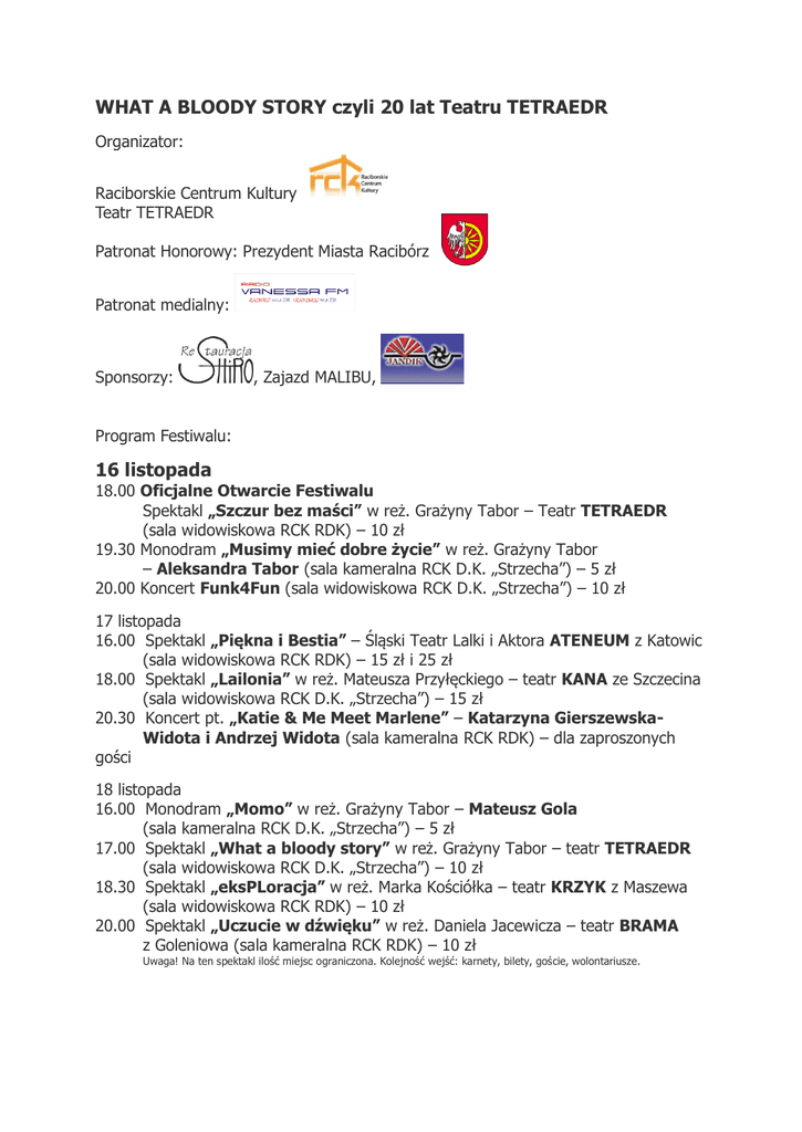 WHAT A BLOODY STORY czyli 20 lat Teatru TETRAEDR Organizator: Raciborskie Centrum Kultury Teatr TETRAEDR Patronat Honorowy: Prezydent Miasta Racibórz Patronat medialny: Sponsorzy: , Zajazd MALIBU, Program Festiwalu: 16 listopada 18.00 Oficjalne Otwarcie Festiwalu Spektakl „Szczur bez maści” w reż. Grażyny Tabor – Teatr TETRAEDR (sala widowiskowa RCK RDK) – 10 zł 19.30 Monodram „Musimy mieć dobre życie” w reż. Grażyny Tabor – Aleksandra Tabor (sala kameralna RCK D.K. „Strzecha”) – 5 zł 20.00 Koncert Funk4Fun (sala widowiskowa RCK D.K. „Strzecha”) – 10 zł 17 listopada 16.00 Spektakl „Piękna i Bestia” – Śląski Teatr Lalki i Aktora ATENEUM z Katowic (sala widowiskowa RCK RDK) – 15 zł i 25 zł 18.00 Spektakl „Lailonia” w reż. Mateusza Przyłęckiego – teatr KANA ze Szczecina (sala widowiskowa RCK D.K. „Strzecha”) – 15 zł 20.30 Koncert pt. „Katie & Me Meet Marlene” – Katarzyna GierszewskaWidota i Andrzej Widota (sala kameralna RCK RDK) – dla zaproszonych gości 18 listopada 16.00 Monodram „Momo” w reż. Grażyny Tabor – Mateusz Gola (sala kameralna RCK D.K. „Strzecha”) – 5 zł 17.00 Spektakl „What a bloody story” w reż. Grażyny Tabor – teatr TETRAEDR (sala widowiskowa RCK D.K. „Strzecha”) – 10 zł 18.30 Spektakl „eksPLoracja” w reż. Marka Kościółka – teatr KRZYK z Maszewa (sala widowiskowa RCK RDK) – 10 zł 20.00 Spektakl „Uczucie w dźwięku” w reż. Daniela Jacewicza – teatr BRAMA z Goleniowa (sala kameralna RCK RDK) – 10 zł Uwaga! Na ten spektakl ilość miejsc ograniczona. Kolejność wejść: karnety, bilety, goście, wolontariusze. Karnet na cały festiwal - 50 zł. Bilety i karnety do zakupu w kasie: - RCK RDK przy ul. Chopina 21 (wtorek – czwartek w godz. 14.30 – 18.30, piątek w godz. 10.00 – 14.00 i 16.00 – 20.00) tel. 32 412 32 45. - RCK D.K. „STRZECHA" przy ul. Londzina 38 (poniedziałek, czwartek, piątek w godz. 15.00 – 19.00, środa w godz. 9.30 – 13.00 i 15.00 – 19.00, sobota – niedziela w godz. 18.00 – 20.00) tel. 32 315 32 14. Szczegóły: 16 listopada godz. 18.00 (sala widowiskowa RCK RDK przy ul. Chopina 21 w Raciborzu). Bilety w cenie: 10 zł. Spektakl pt. „Szczur bez maści” – teatr TETRAEDR na podstawie "Pamiętnika Stefana Czarnieckiego" Witolda Gombrowicza premiera: 11 czerwca 2011 Wybór tekstu Gombrowicza stał się pretekstem do opowiedzenia o wielu ważnych sprawach dotyczących kondycji człowieka w obliczu przemian historycznych, zagubienia w wielości zdarzeń, próby odnalezienia i wyrażenia siebie w tej zawierusze. Szukamy odpowiedzi na pytania —jakie siły zewnętrzne muszą zadziałać i jakie sfery ludzkie muszą być złamane, żeby stać się cynikiem i katem. Szukamy tego, co „kraśne i tajemnicze” dla Polaka, co można głośno i otwarcie, a co lepiej przemilczeć. Budujemy scenę wieczornych modłów, która jest procesją nieokreślonego rytuału; scenę szkoły, w której „szczur” niewiadomego pochodzenia nie ma szans na bycie lubianym; scenę wojny, w której mężczyźni „bawią się” w wojnę, jak chłopcy na podwórku, a obok płynie narracja bohatera opowiadającego dramatyczne wydarzenie zmieniające jego spojrzenie na świat. Tekstem gombrowiczowskim mówią młodzi aktorzy, którzy wkraczają w etap osobistych poszukiwań odpowiedzi na wszystkie te pytania. „Przepuszczają” przez siebie opowiadanie Gombrowicza nadając mu swoją energetyczność. Reżyseria: Grażyna Tabor Muzyka: Anna Jegerska – Michalska Obsada: Agnieszka Gierszewska, Aleksandra Gierszewska, Maria Man, Mateusz Gola, Jakub Gajski, Łukasz Kowalski, Mateusz Kurkowski, Tobiasz Mayer. 16 listopada godz. 19.30 (sala kameralna RCK D.K. "Strzecha" przy ul. Londzina 38). Bilety w cenie: 5 zł Monodram pt. „Musimy mieć dobre życie" w wykonaniu Aleksandry Tabor. Ola jest członkinią Teatru Tetraedr, byłą aktorką Teatru Agrafka. Na co dzień zajmuje się cyrkiem i tańcem. Stworzyła ze swoją reżyserką – Grażyną Tabor, monodram pt.: „Musimy mieć dobre życie". Jak mówi o młodej aktorce jej reżyserka i mama zarazem – Grażyna Tabor – Ola jest dzieckiem teatru i cyrku. W jej życiu granice pomiędzy cyrkiem, teatrem, a tzw. codziennością są przezroczyste. Dlatego żyje intensywnie, soczyście, boleśnie, ze szczególną wrażliwością na magiczną stronę życia. Wszelkie zdarzenia w jej życiu nabierają mnóstwa sensów. Mówimy o sobie i wiemy, że mamy piękne i dobre życie. Historia, którą opowiada Aleksandra Tabor, słowami bohaterki monodramu, jest jedną z bolesnych, związanych z „ostrym" wchodzeniem w życie, a właściwie w świat dojrzewającej w duszy i ciele kobiecości. Jest to historia zranienia i inicjacji koniecznej, żeby zrozumieć, że w kobiecie drzemie potężna siła, moc twórcza ale... narażona jest na „spotkanie z wilkiem". „Nie idź do lasu, nie zapuszczaj się w gęstwinie, bo tam mieszka groźny wilk, który pożera takie osóbki...", a z drugiej strony – „Jeśli nie wejdziesz do lasu, to nic ci się nie przydarzy i nigdy nie zaczniesz naprawdę żyć." Ola ze swoim monodramem brała udział m. in. w takich przeglądach jak: - OKR etapy: I – Racibórz, II – Racibórz, III – Bielsko Biała, IV – Słupsk - FREE ART DAY „KOBIETY RZĄDZĄ" w Krakowie – IX Ogólnopolskie spotkania teatralne BRAMAT 2008 – Międzynarodowy Festiwal Teatralny DIONIZJE 2008 w Ciechanowie – wywalczyła jedną z trzech równorzędnych nagród - Festiwal Monodramów w Lublinie - II Tyski Festiwal Monodramów „MoTyF+". Festiwal odbył się 3 kwietnia 2009 w Miejskim Centrum Kultury w Tychach – Ola zdobyła I miejsce. 16 listopada godz. 20.00 (sala widowiskowa RCK D.K. „Strzecha" przy ul. Londzina 38). Bilety w cenie: 10 zł Koncert Funk4Fun A co to? Jak napisał kiedyś jeden z raciborskich poetów – członków bractwa wyśmiechactwa, FUNK4FUN jeśli chcesz wy