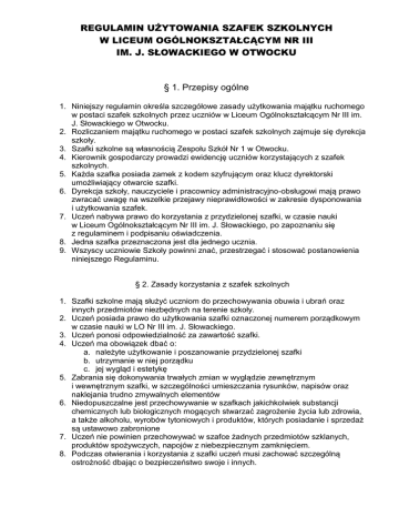 REGULAMIN UŻYTOWANIA SZAFEK SZKOLNYCH W LICEUM OGÓLNOKSZTAŁCĄCYM NR III IM. J. SŁOWACKIEGO W OTWOCKU § 1. Przepisy ogólne 1. Niniejszy regulamin określa szczegółowe zasady użytkowania majątku ruchomego w postaci szafek szkolnych przez uczniów w Liceum Ogólnokształcącym Nr III im. J. Słowackiego w Otwocku. 2. Rozliczaniem majątku ruchomego w postaci szafek szkolnych zajmuje się dyrekcja szkoły. 3. Szafki szkolne są własnością Zespołu Szkół Nr 1 w Otwocku. 4. Kierownik gospodarczy prowadzi ewidencję uczniów korzystających z szafek szkolnych. 5. Każda szafka posiada zamek z kodem szyfrującym oraz klucz dyrektorski umożliwiający otwarcie szafki. 6. Dyrekcja szkoły, nauczyciele i pracownicy administracyjno-obsługowi mają prawo zwracać uwagę na wszelkie przejawy nieprawidłowości w zakresie dysponowania i użytkowania szafek. 7. Uczeń nabywa prawo do korzystania z przydzielonej szafki, w czasie nauki w Liceum Ogólnokształcącym Nr III im. J. Słowackiego, po zapoznaniu się z regulaminem i podpisaniu oświadczenia. 8. Jedna szafka przeznaczona jest dla jednego ucznia. 9. Wszyscy uczniowie Szkoły powinni znać, przestrzegać i stosować postanowienia niniejszego Regulaminu. § 2. Zasady korzystania z szafek szkolnych 1. Szafki szkolne mają służyć uczniom do przechowywania obuwia i ubrań oraz innych przedmiotów niezbędnych na terenie szkoły. 2. Uczeń posiada prawo do użytkowania szafki oznaczonej numerem porządkowym w czasie nauki w LO Nr III im. J. Słowackiego. 3. Uczeń ponosi odpowiedzialność za zawartość szafki. 4. Uczeń ma obowiązek dbać o: a. należyte użytkowanie i poszanowanie przydzielonej szafki b. utrzymanie w niej porządku c. jej wygląd i estetykę 5. Zabrania się dokonywania trwałych zmian w wyglądzie zewnętrznym i wewnętrznym szafki, w szczególności umieszczania rysunków, napisów oraz naklejania trudno zmywalnych elementów 6. Niedopuszczalne jest przechowywanie w szafkach jakichkolwiek substancji chemicznych lub biologicznych mogących stwarzać zagrożenie życia lub zdrowia, a także alkoholu, wyrobów tytoniowych i produktów, których posiadanie i sprzedaż są ustawowo zabronione 7. Uczeń nie powinien przechowywać w szafce żadnych przedmiotów szklanych, produktów spożywczych, napojów z niebezpiecznym zamknięciem. 8. Podczas otwierania i korzystania z szafki uczeń musi zachować szczególną ostrożność dbając o bezpieczeństwo swoje i innych. 9. Uczeń nie może udostępniać przydzielonej szafki innym uczniom, a także zamieniać się z nimi na szafki oraz podawać kodu do szafki innym osobom. 10. W przypadku zapomnienia kodu przez ucznia, może on udać się do dyrekcji w celu zmiany lub odtworzenia kodu. 11. Ewentualne kradzieże mienia oraz wszelkie uszkodzenia szafki powinny być natychmiast zgłaszane przez ucznia dyrekcji szkoły. 12. Sprawca umyślnego uszkodzenia lub zniszczenia szafki szkolnej ponosi całkowity koszt związany z jej naprawą lub zakupem nowej. 13. Uczniowie odchodzący ze szkoły (przenoszący się do innych szkół w trakcie roku szkolnego) przekazują szafkę kierownikowi gospodarczemu. 14. Uczniowie, którzy w danym roku kończą naukę w szkole zobowiązani są do przekazania szafki najpóźniej w przedostatnim tygodniu zakończenia roku szkolnego. § 3 Kontrola przestrzegania regulaminu 1. W przypadku uzasadnionego podejrzenia nierespektowania postanowień regulaminu dyrekcja szkoły ma prawo zażądać od ucznia otwarcia szafki i umożliwienia przejrzenia jej zawartości. 2. W przypadkach nagłych lub szczególnie uzasadnionych, a także w razie odmowy wykonania przez ucznia polecenia, o którym mowa w pkt 1, dyrekcja w obecności wskazanego przez siebie pracownika szkoły ma prawo samodzielnego otwarcia szafki i przejrzenia jej zawartości. 3. W każdym powołanym przypadku sporządza się notatkę z otwarcia i przejrzenia zawartości szafki. 4. Niezależnie od powyższych przypadków dyrekcja wyznacza okresowe kontrole zawartości szafek. W kontroli takiej bierze udział dyrektor szkoły lub jego zastępca, pedagog szkolny oraz wyznaczony przedstawiciel samorządu szkolnego. 5. Kontrole, o których mowa w pkt 4 może przeprowadzać za zgodą dyrekcji także wychowawca klasy w obecności co najmniej dwóch uczniów. 6. Z kontroli okresowej sporządzany jest protokół, w którym opisywane są przypadki naruszenia regulaminu. § 4 Postanowienia końcowe 1. Szkoła nie ponosi odpowiedzialności za rzeczy pozostawione w szafkach szkolnych. 2. Wychowawca klasy corocznie zapoznaje z zasadami korzystania z szafek szkolnych uczniów i rodziców. Uczniowie zobowiązani są znać, przestrzegać i stosować postanowienia niniejszego regulaminu. 3. Za nieprzestrzeganie zasad korzystania z szafek szkolnych konsekwencje wobec uczniów wyciąga dyrektor szkoły zgodnie ze statutem szkoły. 4. W sprawach nie unormowanych w niniejszym regulaminie decyzje rozstrzygające podejmuje dyrektor szkoły.