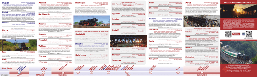 Sobotnia wyprawa pociągiem turystycznym dla całej rodziny na malowniczej trasie Poznań Wągrowiec - Gołańcz, w czasie której uczestnicy będą mogli skorzystać z zabawy na basenie w Aquaparku lub relaksu w grocie solnej. Dodatkowo uczestników wyprawy czeka zwiedzanie Wągrowca z przewodnikiem i wizyta w zamku Pałuków w Gołańczy. Bilet: normalny 49,00 zł, ulgowy 30,87 zł Notec 12 kwietnia 2014 Turystyczny pociąg specjalny uruchamiany jako wiosenna inauguracja sezonu turystycznego w Toruniu. Przejazd połączony ze zwiedzaniem z przewodnikiem zabytkowej starówki w Toruniu, poznaniem ciekawej historii miasta wybudowanego przez Krzyżaków oraz obowiązkowymi zakupami smacznych i znanych na całym świecie pierników. Dodatkowymi atrakcjami będą niespodzianki na stacjach w Gnieźnie i Trzemesznie. Lokomotywa spalinowa, wagony 2 klasy. 15 lutego 2014 Oferta dla koneserów! Niecodzienny przejazd piękną i klimatyczną linią kolejową z Poznania przez Wągrowiec i Rogoźno Wielkopolskie do Czarnkowa oraz z powrotem. W Czarnkowie czekają na nas atrakcje zorganizowane przez lokalne władze samorządowe. Zobacz miasto nad Notecią słynące ze Spółdzielni Mleczarskiej Czarnków oraz małego browaru Czarnków z długą tradycją warzelniczą. Ko-Piernik 1 - 4 maja 2014 Wolsztyn / Poznań / Międzychód / Gostyń / Łagów / i inne. Pociągi podczas XXI Parady Parowozów w Wolsztynie (3 i 4 maja): Wiele tysięcy osób odwiedzi w trakcie pierwszego weekendu maja polską stolicę parowozów Wolsztyn, w którym już po raz dwudziesty pierwszy odbędzie się wielkie święto tych wspaniałych maszyn. Zapraszamy serdecznie do przejazdu nostalgicznym pociągiem ciągniętym zabytkowym parowozem. Do wyboru tego dnia pasażerowie będą mieli kilka pociągów zestawionych z parowozu oraz historycznych dwuosiowych wagonów pasażerskich. Pociągi te będą dostępne zarówno w sobotę czyli w dniu samej parady, jak i w niedzielę. Zapraszamy nie tylko miłośników kolei, ale i całe rodziny. Oferta czterodniowego pobytu w Wielkopolsce i częściowo na Ziemi Lubuskiej połączonego z przejazdami pociągami retro.W ramach uczestnictwa w imprezie pasażerowie skorzystają z wycieczek pociągami prowadzonymi przez zabytkowe parowozy z wolsztyńskiej parowozowni. Pociągi z Wolsztyna pojadą do Gostynia, Poznania, Międzychodu i Łagowa. Większość zaplanowanych do pokonania odcinków to linie niezelektryfikowane, w dużej części z zawieszonym ruchem pasażerskim. Przewidziano także udział w XXI Paradzie Parowozów w Wolsztynie oraz przejazdy pociągami retro wokół Wolsztyna. Uczestnikom tej czterodniowej wyprawy zapewniamy noclegi, a także gwarantujemy miejsca siedzące w pociągach retro przemierzających wielkopolskie szlaki. Ryszard Parowóz, wagony 2 klasy, wagon kawowy. 12 kwietnia 2014 Przejazd malowniczą niezelektryfikowaną linią kolejową pomiędzy stolicami województwa kujawsko pomorskiego. Gościnne miasteczka Chełmża i Unisław tradycyjnie powitają gości na swoich dworcach kolejowych. Przejazd powrotny odbędzie się przez Solec Kujawski tuż nad brzegami rzeki Wisły. Bilet: normalny 14,00 zł, ulgowy 8,82 zł Parowóz / Lokomotywa spalinowa, wagony 2 klasy, wagon kawowy. 24 marca 2014 Pasażerowie będą mogli obejrzeć pozostałości słynnego z "Wielkiej Ucieczki" obozu jenieckiego Stalag Luft III, zobaczyć panoramę okolicy z wieży widokowej, pałac książęcy i inne zabytki Żagania. Nazwa pociągu pochodzi od jednego z tuneli, które zostały wykopane przez jeńców przygotowujących ucieczkę. W tym roku przypada 70-ta rocznica "Wielkiej Ucieczki" - pasażerowie będą mieli okazję uczestniczyć w oficjalnych uroczystościach. Parowóz, zabytkowe wagony 3 klasy. Pociągi na XXI Paradę Parowozów w Wolsztynie: Bilet: normalny 69,00 zł, ulgowy 43,47 zł Franek Parowóz, zabytkowe wagony 3 klasy. 1 maja 2014 Parowóz, zabytkowe wagony 3 klasy. Tulipan Dick Morena 24 marca 2014 Jeden z dwóch pociągów turystycznych przygotowanych specjalnie dla mieszkańców Żagania i Żar oraz gości przybyłych do Żagania z okazji uroczystych obchodów 70-tej rocznicy "Wielkiej Ucieczki" z obozu jenieckiego Stalag Luft III. Wierzba W o N dn o i C te k za c ru s 15 So LUTY MARZEC Parowóz, zabytkowe wagony 3 klasy. 4 maja 2014 Parowóz, zabytkowe wagony 3 klasy. 4 maja 2014 Helena Warto odwiedzić Wolsztyn w drugim dniu XXI Parady Parowozów. Dla miłośników kolejowych wypraw przygotowaliśmy pociągi retro ciągnięte przez zabytkowe parowozy, dostępne dla zwiedzających będą wszystkie zakamarki zabytkowej parowozowni, a także słynna lokomotywa Pm36-2 zwana "Piękną Heleną". Niestety aktualnie nieczynna nadal jednak prezentuje się wspaniale. Pociąg Helena będzie ciągnięty lokomotywą spalinową. Parowóz, wagony 2 klasy, wagon kawowy. 4 maja 2014 Wolsztyn - Zbąszyń - Zbąszynek - Świebodzin - Toporów - Łagów. Łagów - Toporów - Świebodzin - Zbąszynek - Zbąszyń - Wolsztyn. Zapraszamy mieszkańców Łagowa, ich gości, jak i wszystkich chętnych do krótkiej wycieczki pociągiem prowadzonym zabytkowym parowozem. 3 maja 2014 Bilet: normalny 14,00 zł, ulgowy 8,82 zł Parowóz, zabytkowe wagony 3 klasy. 3 maja 2014 Wolsztyn - Powodowo - Wolsztyn. Bilet: normalny 29,00 zł, ulgowy 18,27 zł Parowóz, zabytkowe wagony 3 klasy. Hefajstos 2 maja 2014 Parowóz / Lokomotywa spalinowa, wagony 2 klasy. 3 maja 2014 Parowóz, zabytkowe wagony 3 klasy. k k e ta ne bel z as ra e B F M KWIECIEŃ Seweryn Bilet: normalny 79,00 zł, ulgowy 49,77 zł 2 maja 2014 1 Cz a anena zb p r i r ul o ie T M W 2 Pt 3 maja 2014 Wolsztyn - Nowawieś Mochy - Wolsztyn. Bilet: normalny 29,00 zł, ulgowy 18,27 zł Wrocław Główny - Oborniki Śląskie - Żmigród - Rawicz - Leszno - Wolsztyn. Wolsztyn - Leszno - Rawicz - Żmigród - Oborniki Śląskie - Wrocław Główny. Pociąg turystyczny na coroczną Paradę Parowozów w Wolsztynie dla pasażerów z Wrocławia i okolic