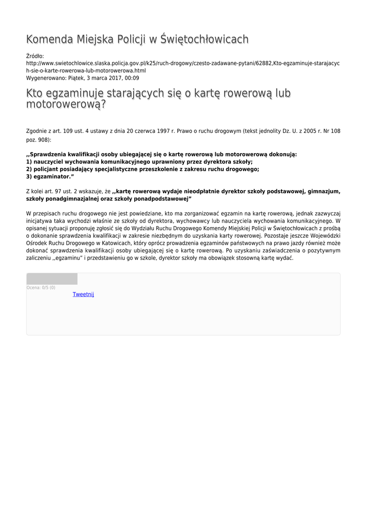 Komenda Miejska Policji w Świętochłowicach Źródło: http://www.swietochlowice.slaska.policja.gov.pl/k25/ruch-drogowy/czesto-zadawane-pytani/62882,Kto-egzaminuje-starajacyc h-sie-o-karte-rowerowa-lub-motorowerowa.html Wygenerowano: Piątek, 3 marca 2017, 00:09 Kto egzaminuje starających się o kartę rowerową lub motorowerową? Zgodnie z art. 109 ust. 4 ustawy z dnia 20 czerwca 1997 r. Prawo o ruchu drogowym (tekst jednolity Dz. U. z 2005 r. Nr 108 poz. 908): ,,Sprawdzenia kwalifikacji osoby ubiegającej się o kartę rowerową lub motorowerową dokonują: 1) nauczyciel wychowania komunikacyjnego uprawniony przez dyrektora szkoły; 2) policjant posiadający specjalistyczne przeszkolenie z zakresu ruchu drogowego; 3) egzaminator.” Z kolei art. 97 ust. 2 wskazuje, że ,,kartę rowerową wydaje nieodpłatnie dyrektor szkoły podstawowej, gimnazjum, szkoły ponadgimnazjalnej oraz szkoły ponadpodstawowej” W przepisach ruchu drogowego nie jest powiedziane, kto ma zorganizować egzamin na kartę rowerową, jednak zazwyczaj inicjatywa taka wychodzi właśnie ze szkoły od dyrektora, wychowawcy lub nauczyciela wychowania komunikacyjnego. W opisanej sytuacji proponuję zgłosić się do Wydziału Ruchu Drogowego Komendy Miejskiej Policji w Świętochłowicach z prośbą o dokonanie sprawdzenia kwalifikacji w zakresie niezbędnym do uzyskania karty rowerowej. Pozostaje jeszcze Wojewódzki Ośrodek Ruchu Drogowego w Katowicach, który oprócz prowadzenia egzaminów państwowych na prawo jazdy również może dokonać sprawdzenia kwalifikacji osoby ubiegającej się o kartę rowerową. Po uzyskaniu zaświadczenia o pozytywnym zaliczeniu ,,egzaminu” i przedstawieniu go w szkole, dyrektor szkoły ma obowiązek stosowną kartę wydać. Ocena: 0/5 (0) Tweetnij