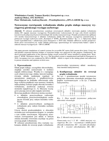 Włodzimierz Garski, Tomasz Kardyś, Energotest sp. z o.o. Andrzej Oleksy, ITG KOMAG Piotr Michalczuk, Andrzej Buczek – Przedsiębiorstwo „OPA-LABOR Sp. z o.o. Nowoczesne rozwiązanie wzbudzenia silnika prądu stałego maszyny wyciągowej górniczego wyciągu szybowego Abstrakt. W referacie przedstawiono symulacje rewersyjnych układów sterowania prądem wzbudzenia silnika DC napędu maszyny wyciągowej. Przeanalizowano wykorzystanie do tego celu dwóch mostków tyrystorowych połączonych przeciwrównolegle lub mostka tranzystorowego. Ponadto przedstawiono aplikacje w/w mostka tranzystorowego w układzie wzbudzenia silnika DC maszyny wyciągowej zainstalowanej w górniczym wyciągu szybowym szybu „Kazimierz I” KWK „Kazimierz-Juliusz” Sp. z o. o. Opisywany układ został wyprodukowany i zabudowany przez Energotest w 2010 roku. Badanie odbiorcze zostało przeprowadzone przez rzeczoznawcę ds. ruchu zakładu górniczego, uprawnionego do wykonywania badań i opinii w zakresie maszyn wyciągowych – OPA-LABOR. The paper presents simulations of control systems for reversible DC motor field current drive hoist. Using two anti-parallel connected thyristor bridges or transistor bridge was analyzed for this purpose. Furthermore, the above presented application of the transistor bridge circuit excited DC motor installed in mining hoist "Kazimierz I" KWK "Kazimierz-Juliusz" Sp. z o.o. The described system is manufactured and built by Energotest in 2010. Acceptance test was conducted by OPA-LABOR – which is expert in the mining plants and authorized to pursue researches and opinions on hoist area. 1. Wprowadzenie Silnik prądu stałego, szczególnie obcowzbudny, znajduje szerokie zastosowanie w technice napędu elektrycznego. Wynika to z następujących właściwości tego silnika: łatwość konfigurowania układu zamkniętej regulacji ze sprzężeniem prądowym i prędkościowym, pozwalającym na dokładne odtworzenie zadanego wykresu prędkości oraz nastawę i kontrolę maksymalnej wartości prądu obwodu twornika i wzbudzenia, możliwość realizacji rewersu momentu napędowego [1, 3]. Maszyny wyciągowe pracują zawsze jako napędy nawrotne. Rewersję prędkości obrotowej można uzyskać: • w układzie przeciwsobnym (odwrotnie równoległym, przeciwrównoległym) zasilającym twornik przy stałym kierunku wzbudzenia, • w układzie przeciwsobnym zasilającym wzbudzenie przy stałym kierunku zasilania twornika. Użycie dwóch przekształtników w obwodzie twornika jest rozwiązaniem drogim i w związku z tym rzadko stosowanym. Najczęściej stosowanym rozwiązaniem jest układ, w którym zmiana kierunku wirowania uzyskuje się przez rewersję prądu wzbudzenia. W referacie przedstawiono dwa warianty wykonania układu do rewersji prądu wzbudzenia: przeciwsobny tyrystorowy układ oraz mostek tranzystorowy. mostkowy 2. Konfiguracja układów do rewersji prądu wzbudzenia Na rys. 1 przedstawiono mostki tyrystorowe połączone odwrotnie równolegle pracujące bez prądów wyrównawczych a na rys. 2 mostek tranzystorowy. Rys. 1. Dwa mostki tyrystorowe połączone odwrotnie równolegle Rys. 2. Mostek tranzystorowy Oznaczenia rys.1 i 2: M – silnik maszyny wyciągowej; Rw, Lw – rezystancja i indukcyjność obwodu wzbudzenia; SO – stycznik odwzbudzania; R – rezystor odwzbudzania; M1, M2 - mostek tyrystorowy; TW – transformator wzbudzenia; SW – stycznik wzbudzenia; T1-T4 – mostek tranzystorowy; MD – mostek diodowy; U>, T5, RH – układ „hamowania”; C – kondensator impulsowy Stosowane bezinercyjne układy sterowania prostowników tyrystorowych umożliwiają bardzo szybkie przejście z pracy prostownikowej do falownikowej i odwrotnie, dzięki czemu dla uniknięcia prądu wyrównawczego można utrzymywać jeden mostek w pracy a drugi zblokowany. Rewersję prądu uzyskuje się przez wysterowanie aktualnego mostka z pracy prostowniczej do falownikowej. Energia zgromadzona w indukcyjności wzbudzenia przepływa do sieci zasilającej i po osiągnięciu przez prąd zerowej wartości po niewielkim czasie zwłoki rzędu kilkunastu milisekund drugi mostek zostaje załączany do pracy prostowniczej i przejmuje narastanie prądu w przeciwną stronę. Mostek tranzystorowy sterowany jest metodą modulacji szerokości impulsów (PWM). Dla uzyskania jednego kierunku przepływu prądu załączane są tranzystory np. T1 i T4 na określony czas, prąd zaczyna narastać, po wyłączeniu tych tranzystorów prąd zaczyna płynąć przez diody włączone przeciwrównolegle do tranzystorów T2 i T4 i ładuje kondensator C. Prąd wzbudzenia jest proporcjonalny do współczynnika wypełnienia wyrażonego wzorem (1): γ= czas _ przewodzenia okres (1) W celu rewersji prądu, tranzystory T1 i T4 zostają na stałe wyłączone, kluczowaniu zostają poddane tranzystory T2 i T3, energia wzbudzenia przez diody włączone przeciwrównolegle do tranzystorów T2 i T3 ładuje kondensator C. Napięcie na nim wzrasta do poziomu kontrolowanego przez zabezpieczenie U>, po którego przekroczeniu tranzystor T5 włącza rezystor „hamowania” RH. Rezystor ten jest tak dobrany, że absorbuje energię wzbudzenia, co powoduje obniżenie napięcia na kondensatorze C i wyłączenie tranzystora T5. Proces powtarza się do czasu osiągnięcia przez prąd wzbudzenia wartości zerowej. Dalej tranzystory T2 i T3 ustawiają pożądany prąd w przeciwną stronę. Przejście do pracy rewersyjnej odbywa się w sposób płynny bez czasu martwego, który jest potrzebny w wykonaniach tyrystorowych 3. Symulacje Pokazane na rys.1 i 2 układy poddano badaniom symulacyjnym. Założono następujące parametry wzbudzenia odpowiadające w przybliżeniu silnikowi o mocy 1MW: Iwn=100A; Uwn=100V; Rw=1Ω; Lw=1,5H Parametry zastępcze transformatora TW: r=2%; x=3% Napięcie strony wtórnej transformatora wzbudzenia dobrano: • dla prostowników tyrystorowych (2): U AC _ tyr = k f × Uwn 3× 2 π • (2) × cos(30°) dla mostka tran