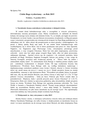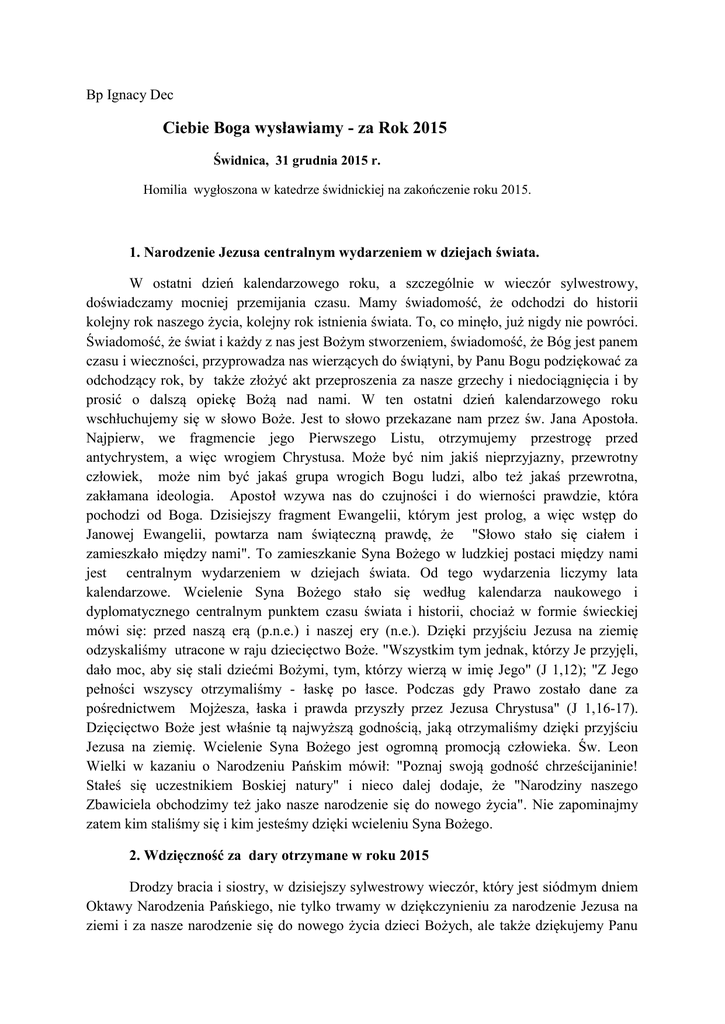 Bp Ignacy Dec Ciebie Boga wysławiamy - za Rok 2015 Świdnica, 31 grudnia 2015 r. Homilia wygłoszona w katedrze świdnickiej na zakończenie roku 2015. 1. Narodzenie Jezusa centralnym wydarzeniem w dziejach świata. W ostatni dzień kalendarzowego roku, a szczególnie w wieczór sylwestrowy, doświadczamy mocniej przemijania czasu. Mamy świadomość, że odchodzi do historii kolejny rok naszego życia, kolejny rok istnienia świata. To, co minęło, już nigdy nie powróci. Świadomość, że świat i każdy z nas jest Bożym stworzeniem, świadomość, że Bóg jest panem czasu i wieczności, przyprowadza nas wierzących do świątyni, by Panu Bogu podziękować za odchodzący rok, by także złożyć akt przeproszenia za nasze grzechy i niedociągnięcia i by prosić o dalszą opiekę Bożą nad nami. W ten ostatni dzień kalendarzowego roku wschłuchujemy się w słowo Boże. Jest to słowo przekazane nam przez św. Jana Apostoła. Najpierw, we fragmencie jego Pierwszego Listu, otrzymujemy przestrogę przed antychrystem, a więc wrogiem Chrystusa. Może być nim jakiś nieprzyjazny, przewrotny człowiek, może nim być jakaś grupa wrogich Bogu ludzi, albo też jakaś przewrotna, zakłamana ideologia. Apostoł wzywa nas do czujności i do wierności prawdzie, która pochodzi od Boga. Dzisiejszy fragment Ewangelii, którym jest prolog, a więc wstęp do Janowej Ewangelii, powtarza nam świąteczną prawdę, że "Słowo stało się ciałem i zamieszkało między nami". To zamieszkanie Syna Bożego w ludzkiej postaci między nami jest centralnym wydarzeniem w dziejach świata. Od tego wydarzenia liczymy lata kalendarzowe. Wcielenie Syna Bożego stało się według kalendarza naukowego i dyplomatycznego centralnym punktem czasu świata i historii, chociaż w formie świeckiej mówi się: przed naszą erą (p.n.e.) i naszej ery (n.e.). Dzięki przyjściu Jezusa na ziemię odzyskaliśmy utracone w raju dziecięctwo Boże. "Wszystkim tym jednak, którzy Je przyjęli, dało moc, aby się stali dziećmi Bożymi, tym, którzy wierzą w imię Jego" (J 1,12); "Z Jego pełności wszyscy otrzymaliśmy - łaskę po łasce. Podczas gdy Prawo zostało dane za pośrednictwem Mojżesza, łaska i prawda przyszły przez Jezusa Chrystusa" (J 1,16-17). Dzięcięctwo Boże jest właśnie tą najwyższą godnością, jaką otrzymaliśmy dzięki przyjściu Jezusa na ziemię. Wcielenie Syna Bożego jest ogromną promocją człowieka. Św. Leon Wielki w kazaniu o Narodzeniu Pańskim mówił: "Poznaj swoją godność chrześcijaninie! Stałeś się uczestnikiem Boskiej natury" i nieco dalej dodaje, że "Narodziny naszego Zbawiciela obchodzimy też jako nasze narodzenie się do nowego życia". Nie zapominajmy zatem kim staliśmy się i kim jesteśmy dzięki wcieleniu Syna Bożego. 2. Wdzięczność za dary otrzymane w roku 2015 Drodzy bracia i siostry, w dzisiejszy sylwestrowy wieczór, który jest siódmym dniem Oktawy Narodzenia Pańskiego, nie tylko trwamy w dziękczynieniu za narodzenie Jezusa na ziemi i za nasze narodzenie się do nowego życia dzieci Bożych, ale także dziękujemy Panu Bogu za dar roku 2015, który odchodzi do historii. Przypomnijmy najważniejsze wydarzenia, jakie miały miejsce w roku 2015 , najpierw - w Kościele powszechnym, następnie - w Kościele w Polsce i w naszej diecezji. a) Ważniejsze wydarzenia w roku 2015 w Kościele powszechnym Jednym z najważniejszych wydarzeń odchodzącego roku była inauguracja Nadzwyczajnego Jubileuszu Miłosierdzia, dokonana przez Ojca św. Franciszka poprzez otwarcie Drzwi Świętych w bazylice watykańskiej 8 grudnia br. Rok, który mamy przed sobą będzie rokiem łaski i miłosierdzia dla Kościoła i dla całej ludzkości. Innym doniosłym wydarzeniem o niezwykle ważnym znaczeniu było z pewnością XIV Zwyczajne Zgromadzenie Ogólne Synodu Biskupów, które obradowało pod przewodnictwem Ojca św. Franciszka w Watykanie w dniach 4-25 października br.. Przypomnijmy, że Synod pochylił się nad tematem: "Powołanie i misja rodzony w Kościele i w świecie współczesnym". Wiemy jak światowe i nasze media czekały na jakąś sensację, a Synod potwierdził dotychczasową naukę Kościoła o małżeństwie i rodzinie. Rok 2015 był w Kościele katolickim Rokiem Życia Konsekrowanego, Zakończy się on 2 lutego 2016 r., w święto Ofiarowania Pańskiego, w obchodzony od wielu lat Dzień Życia Konsekrowanego. Patrząc na odchodzący rok w perspektywie całego Kościoła, nie możemy nie zauważyć wielkiej aktywności Ojca św. Franciszka. Ojciec św. ogłosił 24 maja mijającego roku swoją drugą encyklikę: "Laudato si", w której przestawił relację człowieka do środowiska naturalnego. Papież w odchodzącym roku odbył pięć zagranicznych podróży apostolskich, odwiedzając 11 państw na pięciu kontynentach: pielgrzymka pierwsza: Sri Lanka i Filipiny (12-19 stycznia); pielgrzymka druga: Bośnia i Hercegowina (6 czerwca); pielgrzymka trzecia: Ameryka Łacińska: Ekwador, Boliwia i Paragwaj (5-13 lipca); pielgrzymka czwarta: Kuba i Stany Zjednoczone (19-28 września) oraz pielgrzymka piąta: Afryka (Kenia, Uganda i Republika Środkowoafrykańska (25-30 listopada). Ponadto Ojciec św. odbył trzy podróże apostolskie na terenie Włoch: Pompeje i Neapol (21 marca); Turyn (21-22 czerwca) oraz Prato i Florencja (10 listopada). Ponadto w roku 2015 kanonizował 10 osób. W 11 krajach (w tym w Polsce) dokonano w sumie 17 obrzędów beatyfikacji, za sprawą których Kościół otrzymał 79 nowych błogosławionych. Wśród nich znalazło się troje Polaków: Klara Ludwika Szczęsna (1863-1916), zakonnica ze zgromadzenia sercanek, beatyfikowana w Krakowie 27 września br. oraz dwaj ojcowie franciszkanie konwentualni: Zbigniew Strzałkowski i Michał Tomaszek - misjonarze męczennicy, zamordowani 9 sierpnia 1990 r. w Peru, beatyfikowani tamże - 5 grudnia br.. W roku 2015 Ojciec św. zwołał konsystorz, na którym 14 lutego kreował 20 nowych