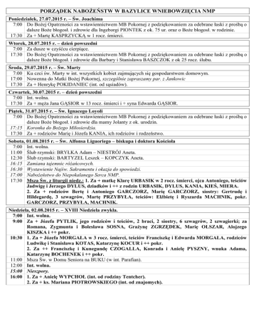 PORZĄDEK NABOŻEŃSTW W BAZYLICE WNIEBOWZIĘCIA NMP Poniedziałek, 27.07.2015 r. – Św. Joachima 7:00 Do Bożej Opatrzności za wstawiennictwem MB Pokornej z podziękowaniem za odebrane łaski z prośbą o dalsze Boże błogosł. i zdrowie dla Ingeborgi PIONTEK z ok. 75 ur. oraz o Boże błogosł. w rodzinie. 17:30 Za + Martę KASPRZYCKĄ w 1 rocz. śmierci. Wtorek, 28.07.2015 r. – dzień powszedni 7:00 Za dusze w czyśćcu cierpiące. 17:30 Do Bożej Opatrzności za wstawiennictwem MB Pokornej z podziękowaniem za odebrane łaski z prośbą o dalsze Boże błogosł. i zdrowie dla Barbary i Stanisława BASZCZOK z ok 25 rocz. ślubu. Środa, 29.07.2015 r. – Św. Marty 7:00 Ku czci św. Marty w int. wszystkich kobiet zajmujących się gospodarstwem domowym. 17:00 Nowenna do Matki Bożej Pokornej, szczególnie zapraszamy par. z Jankowic 17:30 Za + Henrykę POKIDANIEC (int. od sąsiadów). Czwartek, 30.07.2015 r. – dzień powszedni 7:00 Int. wolna. 17:30 Za + męża Jana GĄSIOR w 13 rocz. śmierci i + syna Edwarda GĄSIOR. Piątek, 31.07.2015 r. – Św. Ignacego Loyoli 7:00 Do Bożej Opatrzności za wstawiennictwem MB Pokornej z podziękowaniem za odebrane łaski z prośbą o dalsze Boże błogosł. i zdrowie dla mamy Jolanty z ok. urodzin. 17:15 Koronka do Bożego Miłosierdzia. 17:30 Za + rodziców Marię i Józefa KANIA, ich rodziców i rodzeństwo. Sobota, 01.08.2015 r. – Św. Alfonsa Liguoriego – biskupa i doktora Kościoła 7:00 Int. wolna. 11:00 Ślub rzymski: BRYŁKA Adam – NIESTRÓJ Aneta. 12:30 Ślub rzymski: BARTYZEL Leszek – KOPCZYK Aneta. 16:15 Zamiana tajemnic różańcowych. 16:30 Wystawienie Najśw. Sakramentu i okazja do spowiedzi. 17:00 Nabożeństwo do Niepokalanego Serca NMP. 17:30 Msza Św. z liturgii niedz.: 1. Za + matkę Klarę URBASIK w 2 rocz. śmierci, ojca Antoniego, teściów Jadwigę i Jerzego DYLUS, dziadków i ++ z rodzin URBASIK, DYLUS, KANIA, KIEŚ, MIERA. 2. Za + rodziców Bertę i Antoniego GARCZORZ, Marię GARCZORZ, siostry: Gertrudę i Hildegardę, 3 szwagrów, Martę PRZYBYŁA, teściów: Elżbietę i Ryszarda MACHNIK, pokr. GARCZORZ, PRZYBYŁA, MACHNIK. Niedziela, 02.08.2015 r. – XVIII Niedziela zwykła. 7:00 Int. wolna. 9:00 Za + Józefa PYTLIK, jego rodziców i teściów, 2 braci, 2 siostry, 6 szwagrów, 2 szwagierki; za Romana, Zygmunta i Bolesława SOSNA, Grażynę ZGRZĘDEK, Marię OLSZAR, Alojzego KISZKA i ++ pokr. 10:30 1. Za + Józefa MORGAŁA w 3 rocz. śmierci, teściów Franciszkę i Edwarda MORGAŁA, rodziców Ludwikę i Stanisława KOTAS, Katarzynę KOCUR i ++ pokr. 2. Za ++ Franciszkę i Kunegundę CZOGALLA, Konrada i Anielę PYSZNY, wnuka Adama, Katarzynę BOCHENEK i ++ pokr. 11:00 Msza Św. w Domu Seniora na BUKU (w int. Parafian). 12:00 Int. wolna. 15:00 Nieszpory. 16:00 1. Za + Anielę WYPCHOŁ (int. od rodziny Tentcher). 2. Za + ks. Mariana PIOTROWSKIEGO (int. od znajomych). Ogłoszenia Duszpasterskie 1. W sobotę przypada I sobota miesiąca. Zapraszamy na nabożeństwo do Niepokalanego Serca NMP o godz. 17.00. 2. Za tydzień (02 sierpnia) na Górze św. Anny – Odpust franciszkański ku czci Matki Bożej Anielskiej z Porcjunkuli. 3. Biskup Gliwicki zezwala na uzyskanie jeden raz odpustu zupełnego tzw. „Porcjunkuli” (w dniu 02 sierpnia) we wszystkich kościołach parafialnych. Warunki uzyskania odpustu zupełnego: spowiedź i Komunia św., nawiedzenie kościoła, odmówienie Ojcze nasz i Wierzę w Boga, modlitwa w intencji Papieża, wykluczenie wszelkiego przywiązania do grzechu. 4. Dziś po nieszporach dodatkowe błogosławieństwo kierowców i pojazdów. 5. Dziś o godz. 17:00 zapraszamy na koncert z cyklu „Muzyka w Starym Opactwie”. Za instrumentem zasiądzie pan Krzysztof Kotoński z Gliwic-Sośnicy - utalentowany muzyk (organista i wokalista) młodego pokolenia! 6. Dziękujemy klerykom naszego Seminarium Duchownego za ich pracę na rzecz Zespołu KlasztornoPałacowego. Polecajmy ich w naszej modlitwie. 7. Za tydzień Słowo Boże wygłosi neoprezbiter ks. Piotr Kwaśniok. Po Mszach Św. będzie udzielał błogosławieństwa prymicyjnego. Bóg Zapłać za składane ofiary. 8. W przyszłą niedzielę kolekta na Diecezję i Seminarium Duchowne. 9. Bóg Zapłać Paniom z Żywego Różańca za przygotowanie poczęstunku i ugoszczenie zaprzyjaźnionych pielgrzymów na Jasną Górę z Ostrawy:) 10. W piątek odwiedziny chorych z rejonu ks. Proboszcza. Rejon ks. wikarego – w sobotę. 11. W sobotę zamiana tajemnic różańcowych, g. 16:15. 12. W niedzielę (09 sierpnia) o g. 13:00 na boisku w Pokrzywnicy odbędą się V Zawody Sikawek Konnych OSP młodzieży do lat 18. Dla widzów i gości przygotowano wiele ciekawostek - gorąco polecamy tę atrakcję. 13. Miłośnikom Rud polecamy ciekawy album z archiwalnymi zdjęciami i widokówkami wydanymi przed wojną! - do nabycia w zakrystii oraz w punkcie z pamiątkami przy Nadleśnictwie. 14. Polecamy nowy nr. Gościa Niedzielnego. Ciekawostki: a) W 1842 r. par. Rudy (z Bargłówką, Białym Dworem i Stanicą) liczyła 4. 286 wiernych. W 1855 już 4. 880, a w 1864 sama miejscowość Rudy liczyła 1131 osób! b) W baroku wykonano 3 kopie obrazu MB z Rud Wielkich. Znajdują się one w: Opawie (kościół pojezuicki), w Krowiarkach, w Stanicy. Jest też inna kopia w kościele w Maciowakszu (niegdyś na chórze, obecnie chyba na probostwie!) c) Liczne dziękczynne wota ofiarowane Matce Bożej przedstawionej w Rudzkim obrazie skradziono w 1778 r. (włamanie do zakrystii w nocy 25. X.) d) Konsekracja Kościoła w Bargłówce - 1986 r. Kościół budowano 3 lata i 3 miesiące. Od 1994 r. do 2011 r. w ostatnią niedzielę października z Bargłówki przychodziła piesza pielgrzymka do Rud. e) Biały Dwór z dniem 30. 08. 1987 r. dekretem bp. A. Nossola (1477/87/L) stanowi część par. Bargłówka. W Adwencie prawdopodobnie zostanie znów przyłączony do par. w Rudach Wielkich. Zapowiedzi: I. 1. PROCEK Marcin, Jankowice – BIAŁY Patrycja, Babice 2. SZYMALA Marcin,