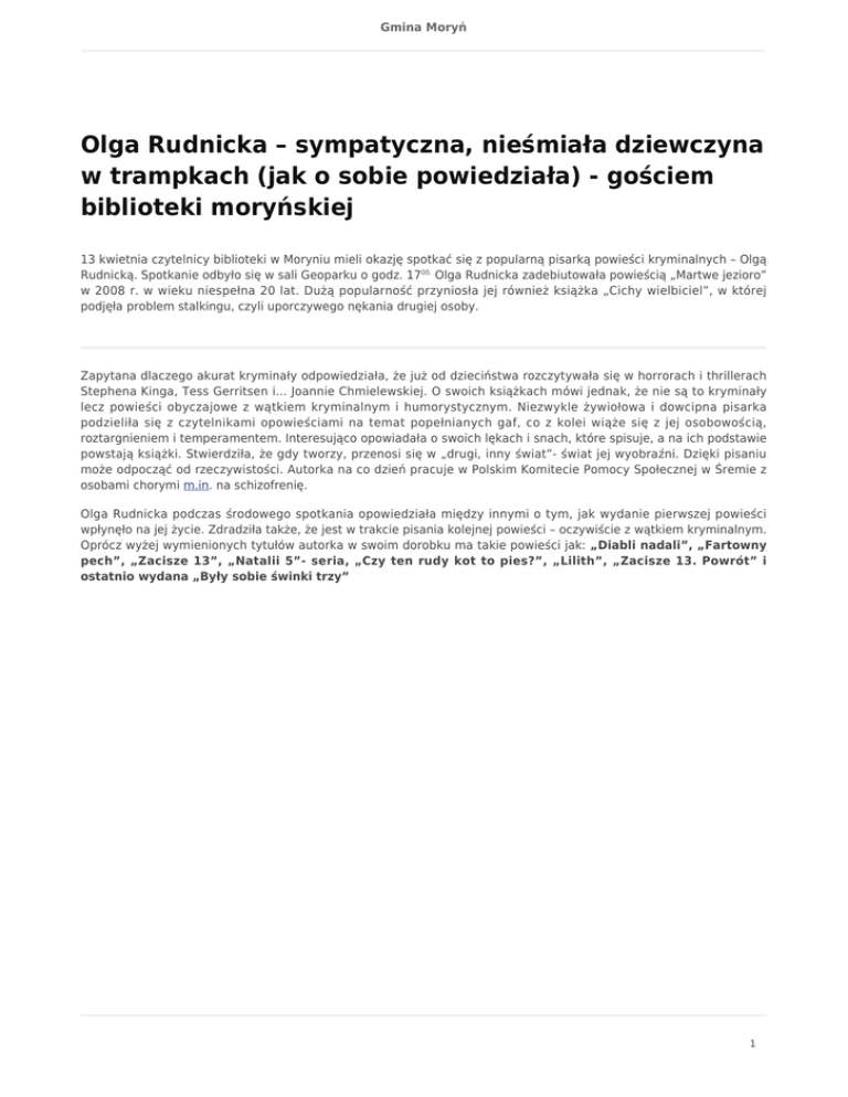 Gmina Moryń Olga Rudnicka – sympatyczna, nieśmiała dziewczyna w trampkach (jak o sobie powiedziała) - gościem biblioteki moryńskiej 13 kwietnia czytelnicy biblioteki w Moryniu mieli okazję spotkać się z popularną pisarką powieści kryminalnych – Olgą Rudnicką. Spotkanie odbyło się w sali Geoparku o godz. 1700. Olga Rudnicka zadebiutowała powieścią „Martwe jezioro” w 2008 r. w wieku niespełna 20 lat. Dużą popularność przyniosła jej również książka „Cichy wielbiciel”, w której podjęła problem stalkingu, czyli uporczywego nękania drugiej osoby. Zapytana dlaczego akurat kryminały odpowiedziała, że już od dzieciństwa rozczytywała się w horrorach i thrillerach Stephena Kinga, Tess Gerritsen i... Joannie Chmielewskiej. O swoich książkach mówi jednak, że nie są to kryminały lecz powieści obyczajowe z wątkiem kryminalnym i humorystycznym. Niezwykle żywiołowa i dowcipna pisarka podzieliła się z czytelnikami opowieściami na temat popełnianych gaf, co z kolei wiąże się z jej osobowością, roztargnieniem i temperamentem. Interesująco opowiadała o swoich lękach i snach, które spisuje, a na ich podstawie powstają książki. Stwierdziła, że gdy tworzy, przenosi się w „drugi, inny świat”- świat jej wyobraźni. Dzięki pisaniu może odpocząć od rzeczywistości. Autorka na co dzień pracuje w Polskim Komitecie Pomocy Społecznej w Śremie z osobami chorymi m.in. na schizofrenię. Olga Rudnicka podczas środowego spotkania opowiedziała między innymi o tym, jak wydanie pierwszej powieści wpłynęło na jej życie. Zdradziła także, że jest w trakcie pisania kolejnej powieści – oczywiście z wątkiem kryminalnym. Oprócz wyżej wymienionych tytułów autorka w swoim dorobku ma takie powieści jak: „Diabli nadali”, „Fartowny pech”, „Zacisze 13”, „Natalii 5”- seria, „Czy ten rudy kot to pies?”, „Lilith”, „Zacisze 13. Powrót” i ostatnio wydana „Były sobie świnki trzy” 1