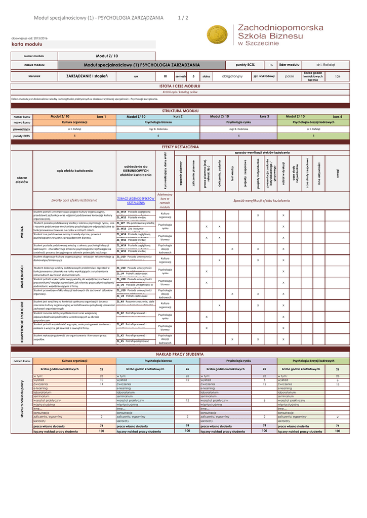 Moduł specjalnościowy (1) - PSYCHOLOGIA ZARZĄDZANIA 1/2 obowiązuje od: 2015/2016 karta modułu Moduł Z/ 10 numer modułu Moduł specjalnościowy (1) PSYCHOLOGIA ZARZĄDZANIA nazwa modułu ZARZĄDZANIE I stopień kierunek III rok 5 semestr punkty ECTS obligatoryjny status 16 lider modułu polski jęz. wykładowy dr I. Rafaląt liczba godzin kontaktowych łącznie 104 ISTOTA I CELE MODUŁU Krótki opis i katalog celów Celem modułu jest doskonalenie wiedzy i umiejętności praktycznych w obszarze wybranej specjalności - Psychologii zarządzania. STRUKTURA MODUŁU Moduł Z/ 10 numer kursu kurs 1 kurs 2 Moduł Z/ 10 Moduł Z/ 10 kurs 3 Moduł Z/ 10 kurs 4 nazwa kursu Kultura organizacji Psychologia biznesu Psychologia rynku Psychologia decyzji kadrowych prowadzący dr I. Rafaląt mgr B. Dobińska mgr B. Dobińska dr I. Rafaląt punkty ECTS 4 4 4 4 WIEDZA UMIEJĘTNOŚCI KOMPETENCJE SPOŁECZNE Student potrafi: zinterpretować pojęcie kultury organizacyjnej, przedstawić jej funkcje oraz objaśnić podstawowe koncepcje kultury organizacyjnej. Student posiada podstawową wiedzę z zakresu psychologii rynku, zna i rozumie podstawowe mechanizmy psychologiczne odpowiedzialne za funkcjonowania człowieka na rynku w różnych rolach. Student zna podstawowe normy i zasady etyczne, prawne i psychologiczne związane z prowadzeniem biznesu. Z1_W14 Posiada pogłębioną wiedzę w zakresie wybranej Z1_W15 Posiada wiedzę praktyczną, umożliwiającą Z1_W7 Ma podstawową wiedzę dotyczącą procesów Z1_W13 Zna i rozumie mechanizmy oddziaływania Z1_W14 Posiada pogłębioną wiedzę w zakresie wybranej Z1_W15 Posiada wiedzę praktyczną, umożliwiającą Student posiada podstawową wiedzę z zakresu psychologii decyzji Z1_W14 Posiada pogłębioną kadrowych i charakteryzuje zmienne psychologiczne wpływające na wiedzę w zakresie wybranej Z1_W15 Posiada wiedzę rzetelność procesu decyzyjnego w zakresie potencjału ludzkiego. praktyczną, umożliwiającą Student diagnozuje kulturę organizacyjną i wskazuje rekomendacje ją Z1_U10 Posiada umiejętności doskonalące/zmieniające praktyczne adekwatne o Student dokonuje analizy podstawowych problemów i zagrożeń w funkcjonowaniu człowieka na rynku wynikających z uruchamiania różnorodnych zachowań ekonomicznych. Student potrafi wykorzystać swoją wiedzę do współpracy zarówno z pracownikami/ współpracownikami, jak również pozostałymi osobami/ podmiotami, współpracującymi z firmą. Student przewiduje efekty decyzji kadrowych dla zachowań członków organizacji. Z1_U10 Posiada umiejętności praktyczne adekwatne o Z1_U4 Potrafi zastosować wybrane elementy wiedzy Z1_U10 Posiada umiejętności praktyczne adekwatne o Z1_U6 Posiada umiejętności w zakresie komunikacji Z1_U10 Posiada umiejętności praktyczne adekwatne o Z1_U4 Potrafi zastosować wybrane elementy wiedzy Student jest wrażliwy na kontekst społeczny organizacji i docenia Z1_K4 Rozumie znaczenie, stale znaczenie kultury organizacyjnej w kształtowaniu pożądanej sprawności rozwija i wykorzystuje zdolności zachowań organizacyjnych Student rozumie istotę współzależności oraz wzajemnej odpowiedzialności podmiotów uczestniczących w obrocie gospodarczym Student potrafi współdziałać w grupie, umie postępować zarówno z osobami z wnętrza, jak również z zewnątrz firmy. Z1_K2 Potrafi pracować i współpracować w grupie, Student wykazuje gotowość do organizowania i kierowani pracą zespołów. Z1_K2 Potrafi pracować i współpracować w grupie, Z1_K5 Potrafi podejmować decyzje i angażować Z1_K2 Potrafi pracować i współpracować w grupie, uwagi inne aktywności case study zespołowo case study indywidualnie udział w dyskusji prezentacja zadania indywidualnego / grupowego projekty indywidualne projekty zespołowe test wiedzy Adekwatny kurs w ramach modułu ćwiczenia, zadania ZOBACZ LEGENDĘ EFEKTÓW KSZTAŁCENIA praca pisemna (esej, referat, itp.) Zwarty opis efektu kształcenia obszar efektów zaliczenie pisemne odniesienie do KIERUNKOWYCH efektów kształcenia sposoby weryfikacji efektów kształcenia egzamin pisemny opis efektu kształcenia kurs realizujący dany efekt EFEKTY KSZTAŁCENIA Sposób weryfikacji efektu kształcenia Kultura organizacji x x Psychologia rynku x x x Psychologia biznesu x x x Psychologia decyzji kadrowych x Kultura organizacji x x x x x Psychologia rynku x x Psychologia biznesu x x Psychologia decyzji kadrowych x Kultura organizacji x x x x x Psychologia rynku x x Psychologia biznesu x x Psychologia decyzji kadrowych x x x NAKŁAD PRACY STUDENTA nazwa kursu Kultura organizacji struktura nakładu pracy liczba godzin kontaktowych w tym: wykład ćwiczenia e-learning laboratorium seminarium warsztat praktyczny wizyta studyjna inne… konsultacje zaliczenia, egzaminy Psychologia biznesu 26 26 10 14 2 lektoraty praca własna studenta łączny nakład pracy studenta liczba godzin kontaktowych w tym: wykład ćwiczenia e-learning laboratorium seminarium warsztat praktyczny wizyta studyjna inne… konsultacje zaliczenia, egzaminy Psychologia rynku 26 26 12 12 2 lektoraty 74 100 praca własna studenta łączny nakład pracy studenta liczba godzin kontaktowych w tym: wykład ćwiczenia e-learning laboratorium seminarium warsztat praktyczny wizyta studyjna inne… konsultacje zaliczenia, egzaminy Psychologia decyzji kadrowych 26 26 6 12 6 2 lektoraty 74 100 praca własna studenta łączny nakład pracy studenta liczba godzin kontaktowych w tym: wykład ćwiczenia e-learning laboratorium seminarium warsztat praktyczny wizyta studyjna inne… konsultacje zaliczenia, egzaminy 26 26 6 18 2 lektoraty 74 100 praca własna studenta łączny nakład pracy studenta 74 100 Moduł specjalnościowy (1) - PSYCHOLOGIA ZARZĄDZANIA nazwa kursu Kultura organizacji 2/2 Psychologia biznesu Psychologia rynku Psychologia decyzji kadrowych METODY DYDAKTYCZNE Adekwatne metody Adekwatne metody Adekwatne metody wykład ćwiczenia, zadania case study inn