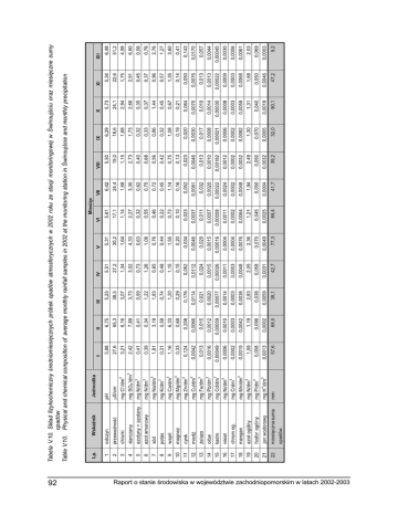 92 Raport o stanie Êrodowiska w województwie zachodniopomorskim w latach 2002-2003 Tabela V.10. Sk∏ad fizykochemiczny Êredniomiesi´cznych próbek opadów atmosferycznych w 2002 roku ze stacji monitoringowej w ÂwinoujÊciu oraz miesi´czne sumy opadów Table V.10. Physical and chemical composition of average monthly rainfall samples in 2002 at the monitoring station in ÂwinoujÊcie and monthly precipitation W 2002 roku na stacji monitoringowej w województwie zachodniopomorskim wykonano 102 pomiary odczynu pH dobowych próbek opadów w celu oceny kwasowoÊci wód opadowych. Odczyn pH mieÊci∏ si´ w zakresie od 3,07 do 7,80 pH, Êrednia roczna wa˝ona pH=5,37. W przypadku 29% próbek wartoÊci odczynu by∏y ni˝sze od wartoÊci pH=5,6 oznaczajàcej naturalnà kwasowoÊç wód opadowych, wskazujàc na zawartoÊç w nich mocnych kwasów mineralnych. W porównaniu z rokiem ubieg∏ym zanotowano spadek iloÊci kwaÊnych deszczy (opadów z odczynem poni˝ej 5,6 pH) o 7%. Na obszar województwa zachodniopomorskiego wody opadowe w 2002 roku wnios∏y: 45 207 Mg siarczanów (19,74 kg SO4-2/ha); 26 437 Mg chlorków (11,54 kg Cl-/ha); 7 257 Mg (N) azotynów i azotanów (3,17 kg N/ha); 10 451 Mg azotu amonowego (4,56 kg N/ha); 27 532 Mg azotu ogólnego (12,02 kg N/ha); 919 Mg fosforu ogólnego (0,401 kg P/ha); 15 173 Mg sodu (6,63 kg Na/ha); 6 361 Mg potasu (2,78 kg K/ha); 17 903 Mg wapnia (7,82 kg Ca/ha); 3 172 Mg magnezu (1,39 kg Mg/ha), 1 033,3 Mg cynku (0,451 kg Zn/ha); 94,7 Mg miedzi (0,0413 kg Cu/ha), 479,2 Mg ˝elaza (0,209 kg Fe/ha); 37,31 Mg o∏owiu (0,0163 kg Pb/ha); 4,475 ton kadmu (0,00195 kg Cd/ha); 26,62 Mg niklu (0,0116 kg Ni/ha), 5,267 Mg chromu (0,0023 kg Cr/ha) i 116,26 Mg manganu (0,0508 kg Mn/ha) oraz 111,25 Mg wolnych jonów wodorowych (0,0486 kg H+/ha). Najwi´kszym ∏adunkiem badanych substancji w województwie zachodniopomorskim zosta∏ obcià˝ony powiat kamieƒski, z najwy˝szymi w porównaniu do obcià˝enia pozosta∏ych powiatów ∏adunkami siarczanów, chlorków i sodu. Najmniejsze obcià˝enie powierzchniowe wystàpi∏o w powiecie s∏awieƒskim z najni˝szym w stosunku do pozosta∏ych powiatów obcià˝eniem ∏adunkami siarczanów, azotu amonowego, azotu ogólnego, potasu, wapnia, magnezu, cynku, kadmu i magnezu. Roczny ∏adunek jednostkowy w zdecydowanej wi´kszoÊci wskaêników zdeponowanych na obszarze województwa zachodniopomorskiego przekracza∏ Êredni roczny ∏adunek obliczony dla ca∏ego obszaru Polski. Zanieczyszczenie wód opadowych w województwie zachodniopomorskim przestawiono w tabeli V.11. Tabela V.11. Zanieczyszczenie wód opadowych w województwie zachodniopomorskim Table V.11. Pollution of rainfall in the West Pomeranian Voivodeship Ocena jakoÊci powietrza 93 Ocena wyników czteroletnich badaƒ monitoringowych chemizmu opadów atmosferycznych i depozycji zanieczyszczeƒ do pod∏o˝a prowadzonych w sposób ciàg∏y w latach 1999-2002 wykaza∏a, ˝e depozycja roczna analizowanych substancji wprowadzanych wraz z opadami na obszar województwa zachodniopomorskiego dla wi´kszoÊci sk∏adników charakteryzowa∏a si´, przy pewnym zró˝nicowaniu, zmianami spadkowymi, a ca∏kowite roczne obcià˝enie powierzchniowe obszaru województwa zachodniopomorskiego w 2002 roku ∏adunkiem badanych substancji deponowanych z atmosfery przez opad mokry kszta∏towa∏o si´ na poziomie Êredniego z poprzednich lat badaƒ. Wniesiony wraz z opadami w 2002 roku ∏adunek siarczanów, w porównaniu do Êredniej z lat 1999-2001, przy Êredniorocznej sumie wysokoÊci opadów na podobnym poziomie, zmala∏ o 5,6%, ∏adunek chlorków o 8,3%, azotynów i azotanów o 20,4%, azotu amonowego o 13,1%, azotu ogólnego o 8,7%, fosforu ogólnego o 12,3%, cynku o 13,6%, ˝elaza o 22,4%, o∏owiu o 23,0%, kadmu o 25,4%, chromu o 14,9%, manganu o 43,3% oraz jonów wodorowych o 39,9%. ¸adunki magnezu i miedzi kszta∏towa∏y si´ na podobnym poziomie, a zwi´kszy∏ si´ depozyt sodu o 16,7%, potasu o 14,1%, wapnia o 13,7% i niklu o 15,6%. Dla porównania wielkoÊci mokrej depozycji na obszarze województwa zachodniopomorskiego w latach 1999-2002 w tabeli V.12. podano wielkoÊci ∏adunków jednostkowych badanych substancji wniesionych przez opady atmosferyczne w poszczególnych latach, a na rysunku V.22 przedstawiono diagramy tych ∏adunków oraz Êredniorocznych sum opadów. Tabela V.12. Roczne obcià˝enie powierzchniowe obszaru województwa zachodniopomorskiego zanieczyszczeniami wniesionymi przez opady atmosferyczne w latach 1999-2002 Table V.12. Annual loads in the West Pomeranian Voivodeship by pollutants delivered with rainfalls in 1999-2002 Depozycja zanieczyszczeƒ atmosferycznych, pomimo obserwowanych tendencji malejàcych wielu sk∏adników w latach 1999-2002, nadal jest znaczàcym obcià˝eniem, szczególnie w przypadku kwasotwórczych zwiàzków siarki i azotu (kwaÊne deszcze), zwiàzków biogennych i metali ci´˝kich. 94 Raport o stanie Êrodowiska w województwie zachodniopomorskim w latach 2002-2003