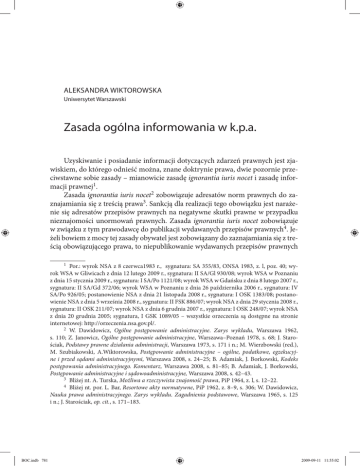 ALEKSANDRA WIKTOROWSKA Uniwersytet Warszawski Zasada ogólna informowania w k.p.a. Uzyskiwanie i posiadanie informacji dotyczących zdarzeń prawnych jest zjawiskiem, do którego odnieść można, znane doktrynie prawa, dwie pozornie przeciwstawne sobie zasady – mianowicie zasadę ignorantia iuris nocet i zasadę informacji prawnej1. Zasada ignorantia iuris nocet2 zobowiązuje adresatów norm prawnych do zaznajamiania się z treścią prawa3. Sankcją dla realizacji tego obowiązku jest narażenie się adresatów przepisów prawnych na negatywne skutki prawne w przypadku nieznajomości unormowań prawnych. Zasada ignorantia iuris nocet zobowiązuje w związku z tym prawodawcę do publikacji wydawanych przepisów prawnych4. Jeżeli bowiem z mocy tej zasady obywatel jest zobowiązany do zaznajamiania się z treścią obowiązującego prawa, to niepublikowanie wydawanych przepisów prawnych 1 Por.: wyrok NSA z 8 czerwca1983 r., sygnatura: SA 355/83, ONSA 1983, z. l, poz. 40; wyrok WSA w Gliwicach z dnia 12 lutego 2009 r., sygnatura: II SA/Gl 930/08; wyrok WSA w Poznaniu z dnia 15 stycznia 2009 r., sygnatura: I SA/Po 1121/08; wyrok WSA w Gdańsku z dnia 8 lutego 2007 r., sygnatura: II SA/Gd 372/06; wyrok WSA w Poznaniu z dnia 26 października 2006 r., sygnatura: IV SA/Po 926/05; postanowienie NSA z dnia 21 listopada 2008 r., sygnatura: I OSK 1383/08; postanowienie NSA z dnia 5 września 2008 r., sygnatura: II FSK 886/07; wyrok NSA z dnia 29 stycznia 2008 r., sygnatura: II OSK 211/07; wyrok NSA z dnia 6 grudnia 2007 r., sygnatura: I OSK 248/07; wyrok NSA z dnia 20 grudnia 2005; sygnatura, I GSK 1089/05 – wszystkie orzeczenia są dostępne na stronie internetowej: http://orzeczenia.nsa.gov.pl/. 2 W. Dawidowicz, Ogólne postępowanie administracyjne. Zarys wykładu, Warszawa 1962, s. 110; Z. Janowicz, Ogólne postępowanie administracyjne, Warszawa–Poznań 1978, s. 68; J. Starościak, Podstawy prawne działania administracji, Warszawa 1973, s. 171 i n.; M. Wierzbowski (red.), M. Szubiakowski, A.Wiktorowska, Postępowanie administracyjne – ogólne, podatkowe, egzekucyjne i przed sądami administracyjnymi, Warszawa 2008, s. 24–25; B. Adamiak, J. Borkowski, Kodeks postępowania administracyjnego. Komentarz, Warszawa 2008, s. 81–85; B. Adamiak, J. Borkowski, Postępowanie administracyjne i sądowoadministracyjne, Warszawa 2008, s. 42–43. 3 Bliżej nt. A. Turska, Możliwa a rzeczywista znajomość prawa, PiP 1964, z. l, s. 12–22. 4 Bliżej nt. por. L. Bar, Resortowe akty normatywne, PiP 1962, z. 8–9, s. 306; W. Dawidowicz, Nauka prawa administracyjnego. Zarys wykładu. Zagadnienia podstawowe, Warszawa 1965, s. 125 i n.; J. Starościak, op. cit., s. 171–183. BOC.indb 781 2009-09-11 11:55:02 782 ALEKSANDRA WIKTOROWSKA jest praktyką niedopuszczalną. W treści tej zasady zakodowany jest zatem postulat udzielania informacji prawnej. Rozwiązaniem uzupełniającym do zasady ignorantia iuris nocet jest prawne zobowiązanie organów państwowych do udzielania informacji na temat unormowań prawnych w ogólności, jak również w konkretnych, indywidualnych przypadkach. W zobowiązaniu tym mieści się szczegółowy obowiązek publikacji wszystkich aktów normatywnych i obowiązek udzielania obywatelom szeroko rozumianej pomocy prawnej. Wyjątki od formułowanej w doktrynie prawa zasady ignorantia iuris nocet znane są tak doktrynie prawa, jak i rozwiązaniom ustaw proceduralnych. Wyjątek od zasady ignorantia iuris nocet sformułowano expressis verbis, jako obowiązującą normę prawną, po raz pierwszy w art. 7 k.p.a. w 1960 r.5 Doktryna postępowania administracyjnego przypisała wówczas tej konstrukcji nazwę zasady informowania stron o ich prawach i obowiązkach w postępowaniu administracyjnym6 albo zasady udzielania pomocy prawnej7, czy wreszcie zasady udzielania informacji prawnej stronom8. Dopiero w następnej kolejności ustawodawca wprowadził instytucję udzielania pomocy prawnej stronom do postępowania cywilnego (art. 5 k.p.c.), do postępowania karnego (art. 10 k.p.k.) oraz do postępowania w sprawach o wykroczenia (art. 9 k.p.w.w.)9. Podstawę prawną obowiązywania zasady ogólnej informowania w ogólnym postępowaniu administracyjnym stanowią obecnie art. 9 k.p.a., formułujący zasadę ogólną wprost, oraz te przepisy szczegółowe k.p.a., w których zasada ta przejawia się i które zabezpieczają jej realizację. Zasada ogólna informowania w postępowaniu administracyjnym ogólnym formułuje pod adresem organu administracji załatwiającego sprawę administracyjną nakaz, mocą którego organ administracji zobowiązany jest, wobec stron i innych uczestników postępowania, do wykonywania fachowego doradztwa prawnego w celu zapewnienia w postępowaniu ochrony interesów indywidualnych tych podmiotów przed szkodą spowodowaną nieznajomością lub niedostateczną znajomością przepisów prawa. Informacje udzielane w ramach pomocy prawnej dotyczą okoliczności faktycznych i prawnych, mogących mieć wpływ na przebieg postępowania oraz 5 Dz.U. z 1960 r., Nr 30, poz. 168 (obecnie art. 9 k.p.a.). J. Służewski, Postępowanie administracyjne, Warszawa 1974, s. 31; por. też M. Wierzbowski (red.), M. Szubiakowski, A.Wiktorowska, Postępowanie administracyjne..., s. 24–25; B. Adamiak, J. Borkowski, Kodeks..., s. 81–85; B. Adamiak, J. Borkowski, Postępowanie…, s. 42–43. 7 Z. Janowicz, Ogólne postępowanie, s. 67; K. Jandy-Jendrośka, J. Jendrośka, System jurysdykcyjnego postępowania administracyjnego, [w:] System prawa administracyjnego, red. T. Rabska, J. Łętowski, t. III, Wrocław 1978, s. 173. 8 W. Dawidowicz, Ogólne postępowanie, s. 1–10; por. też M. Wierzbowski (red.), M. Szubiakowski, A.Wiktorowska, Postępowanie administracyjne..., s. 24–25; B. Adamiak, J. Borkowski, Kodeks..., s. 81–85; B. Adamiak, J. Borkowski, Postępowanie..., s. 42–43. 9 Ustawa z dnia 17 września 1964 r. (Dz.U. 1964, Nr 43, poz. 296 k.p.k.); ustawa z dnia 19 kw