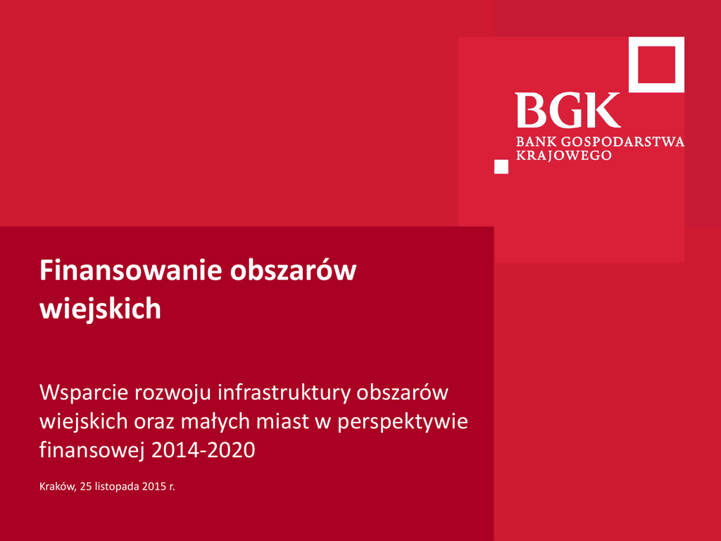 Finansowanie obszarów wiejskich Wsparcie rozwoju infrastruktury obszarów wiejskich oraz małych miast w perspektywie finansowej 2014-2020 Kraków, 25 listopada 2015 r. Podstawowe cele i zadania strategiczne Bank pierwszego wyboru dla Państwa przy realizacji zadań zleconych (państwowe fundusze i programy rozwoju społeczno-gospodarczego) Organizator finansowania w zakresie realizacji programu Inwestycje Polskie Organizator efektywnego modelu działalności w obszarze gwarancji i poręczeń dla przedsiębiorców (PLG de minimis) Bank zarządzający programami i funduszami rządowymi w zakresie rozwoju i modernizacji infrastruktury (transportowej, komunalnej, mieszkaniowej, związanej z ochroną środowiska) Bank wiodący w obszarze finansowania i obsługi jednostek samorządu terytorialnego, spółek komunalnych i instytucji ochrony zdrowia Organizator środków i systemu wsparcia eksportu Bank wspierający absorpcję funduszy Unii Europejskiej Instytucja wiodąca w procesie konsolidacji finansów publicznych 2 PROW 2007-2013 w BGK stan na dzień 16.11.2015 r. Liczba zawartych umów 5 518 Wartość zawartych umów pożyczki 3 883,3 Wartość uruchomionych środków pożyczki 3 379,4 Wartość spłat środków pożyczki 3 248,2 % spłaconych środków pożyczki 96,12 % mln PLN mln PLN mln PLN 3 PROW 2007-2013 w BGK stan na dzień 16.11.2015 r. Podstawowe usługi dla gospodarki i ludności wiejskiej 2 958,5 mln zł 76% Wdrażanie lokalnych strategii rozwoju 242,6 mln zł 6% Wdrażanie projektów współpracy 10,6 mln zł Funkcjonowanie LGD 142,4 mln zł 4% Odnowa i rozwój wsi 529,2 mln zł 14% 4 PROW 2007-2013 w woj. małopolskim stan na dzień 16.11.2015 r. 468 umowy 303,7 mln PLN wartość umów 273 mln PLN 232 mln PLN wartość wypłat wartość spłat 85% poziom spłat 5 PROW 2014-2020 w BGK [1/2] Pożyczki ze środków budżetu państwa będące finansowym wsparciem dla gmin, powiatów i LGD realizujących operacje z udziałem środków z EFRROW przeznaczonych na finansowanie wspólnej polityki rolnej. Spłata pożyczki tytułem zwrotu kosztów kwalifikowalnych poniesionych przez pożyczkobiorcę - środki z EFRROW - dokonywana jest ze środków przekazywanych przez Agencję Płatniczą (ARiMR) na rachunek Pożyczkobiorcy otwarty w BGK. Podstawa prawna: Ustawa z dnia 27 maja 2015 r. o finansowaniu wspólnej polityki rolnej (Dz.U. 2015 poz. 1130) Rozporządzenie Rady Ministrów z dnia 14 września 2015 r. w sprawie pożyczek z budżetu państwa na wyprzedzające finansowanie w ramach Programu Rozwoju Obszarów Wiejskich na lata 2014–2020 6 PROW 2014-2020 w BGK [2/2] M07 - Podstawowe usługi i odnowa wsi na obszarach wiejskich gmina, powiat lub ich związki gmina Budowa lub modernizacja dróg lokalnych Inwestycje w targowiska lub obiekty budowlane przeznaczone na cele promocji lokalnych produktów Gospodarka wodno-ściekowa Inwestycje w obiekty pełniące funkcje kulturalne lub kształtowanie przestrzeni publicznej Ochrona zabytków i budownictwa tradycyjnego M19 – Wsparcie dla rozwoju lokalnego w ramach inicjatywy LEADER JST w zakresie poddziałania wsparcie na wdrażanie operacji w ramach strategii rozwoju lokalnego kierowanego przez społeczność LGD projekty grantowe w zakresie poddziałania wsparcie na wdrażanie operacji w ramach strategii rozwoju lokalnego kierowanego przez społeczność 7 Warunki pożyczki (PROW 2014-2020) Waluta pożyczki – PLN. Oprocentowanie – oprocentowanie transz pożyczki w danym kwartale kalendarzowym, zgodnie z rozporządzeniem, jest równe 0,25 stawki referencyjnej obliczanej jako średnia arytmetyczna wskaźnika WIBOR 3M za okres ostatnich trzech dni, z wyłączeniem dni ustawowo wolnych od pracy oraz sobót, w miesiącu poprzedzającym ten kwartał. Prowizja – 0,1% kwoty udzielonej pożyczki, płatna przy uruchomieniu pierwszej transzy pożyczki. Zabezpieczenie – weksel własny in blanco (JST i LGD) wraz z deklaracją wekslową. Bez przetargu. Zawarcie umowy pożyczki – w terminie miesiąca od daty złożenia w BGK kompletnego wniosku. 8 Schemat przepływu środków pożyczki [1/2] 4 7 oryginał faktury z dyspozycją przelewu płatność faktury Wykonawca, sprzedawca, usługodawca 1 faktura lub inny równoważny dok. księgowy 2 3 Pożyczkobiorca Beneficjent PROW 2014-2020 spłata pożyczki refundacja środków zwrot oryginału opłaconej faktury 5 wniosek o płatność z zał. fakturami Urząd Marszałkowski 6 Agencja Płatnicza (ARiMR) zlecenie płatności 9 Schemat przepływu środków pożyczki [2/2] 1. Pożyczkobiorca dokonuje zakupu towaru lub usługi. 2. Pożyczkobiorca dostarcza do Oddziału Banku faktury lub inne równoważne dokumenty księgowe wystawione przez wykonawców (sprzedawców) oraz dyspozycje przelewów z rachunku środków własnych i z rachunku pożyczki. 3. Bank sporządza kopię faktury i poświadcza ją za zgodność z oryginałem. Oryginał faktury oddaje Pożyczkobiorcy. 4. Bank uruchamia transzę pożyczki. Dokonuje płatności kwoty wynikającej z faktury zgodnie z zamówionymi środkami w MF oraz aktualnym harmonogramem (przelewy z rachunku pożyczki i rachunku środków własnych). 5. Pożyczkobiorca składa w Urzędzie Marszałkowskim wniosek o płatność. 6. Samorząd Województwa, po weryfikacji, przekazuje dokumenty do Agencji Płatniczej (ARiMR) - wniosek o refundację. 7. Spłata kwoty wykorzystanej pożyczki. ARiMR przekazuje na rachunek pożyczki Pożyczkobiorcy środki, tytułem zwrotu kosztów kwalifikowalnych poniesionych przez Pożyczkobiorcę. 10 Instrumenty finansowe Kredyt inwestycyjny i obrotowy Obligacje komunalne Obligacje przychodowe obszary wiejskie Gwarancje bankowe Kredyt ze środków EBI 11 Nowe inicjatywy inwestycyjne Fundusz Mieszkań na Wynajem Fundusz Inwestycji Samorządowych Celem Funduszu Mieszkań na Wynajem jest poszerzenie oferty atrakcyjnych jakościowo i cenowo mieszkań do wynajęcia w największych polskich aglomeracjach. Celem Funduszu Inwestycji Samorządowych 