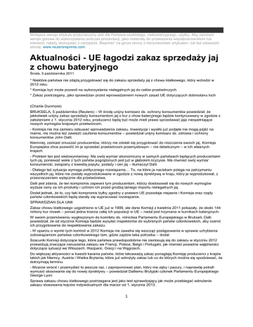 Niniejsza wersja artykułu przeznaczony jest dla Państwa osobistego, niekomercyjnego, użytku. Aby zamówić wersje gotowe do wykorzystania podczas prezentacji, jako materiały do przekazania współpracownikom lub klientom, należy skorzystać z narzędzia „Reprints” na górze strony z którymkolwiek artykułem, lub też odwiedzić stronę: www.reutersreprints.com. Aktualności - UE łagodzi zakaz sprzedaży jaj z chowu bateryjnego Środa, 5 października 2011 * Niektóre państwa nie zdążą przygotować się do zakazu sprzedaży jaj z chowu klatkowego, który wchodzi w 2012 roku * Komisja być może pozwoli na wykorzystanie nielegalnych jaj do celów przetwórczych * Zakaz postrzegany, jako sprawdzian przed wprowadzeniem nowych zasad UE dotyczących dobrostanu loch (Charlie Dunmore) BRUKSELA, 5 października (Reuters) – W środę unijny komisarz ds. ochrony konsumentów powiedział, że jakkolwiek unijny zakaz sprzedaży konsumentom jaj o kur z chow bateryjnego będzie kontynuowany w zgodzie z założeniami z 1. stycznia 2012 roku, producenci będą być może mieli prawo sprzedawać jaja niespełniające nowych wymogów krajowym przetwórcom. - Komisja nie ma zamiaru odsuwać wprowadzenia zakazu. Inwestycje i wysiłki już podjęte nie mogą pójść na marne, nie można też zawieźć zaufania konsumentów – powiedział unijny komisarz ds. zdrowia i ochrony konsumentów John Dalli. Niemniej, zamiast zmuszać producentów, którzy nie zdołali się przygotować do niszczenia swoich jaj, Komisja Europejska chce pozwolić im je sprzedać przetwórcom przemysłowym – nie detalicznym – w ich własnych krajach. - Problem ten jest wielowymiarowy. Ma swój wymiar ekonomiczny w samych państwach będących producentami tych jaj, ponieważ wiele z tych państw pogrążonych jest już w głębokim kryzysie. Ma również swój wymiar konsumencki, związany z kwestią popytu, podaży i cen jaj – tłumaczył Dalli. - Dlatego też sytuacja wymaga politycznego rozwiązania… To, na które ja naciskam polega na zatrzymaniu wszystkich jaj, które nie zostały wyprodukowane w zgodzie z nową dyrektywą w kraju, który je wyprodukował, z przeznaczeniem wyłącznie dla przetwórstwa. Dalli jest zdania, że ten kompromis zapewni tym producentom, którzy dostosowali się do nowych wymogów wyższe ceny za ich produkty i uchroni ich przed groźbą taniego importu nielegalnych jaj. Dodał jednak, że to, czy taki kompromis byłby zgodny z prawem UE pozostaje niejasne i Komisja oraz rządy państw członkowskich będą starały się wypracować rozwiązanie. SPRAWDZIAN DLA UNII Zakaz chowu klatkowego uzgodniono w UE już w 1999, ale dane Komisji z kwietnia 2011 pokazały, że około 144 miliony kur niosek – ponad jedna trzecia całej ich populacji w UE – nadal jest trzymana w kurnikach bateryjnych. W swoim przemówieniu wygłoszonym do komitetu ds. rolnictwa Parlamentu Europejskiego w Brukseli, Dalli powiedział, że od stycznia Komisja będzie wysyłać inspektorów do wybranych państw członkowskich, aby ocenić ich przygotowanie do respektowania zakazu. - W oparciu o wyniki tych kontroli w 2012 Komisja nie zawaha się wszcząć postępowania w sprawie uchybienia zobowiązaniom państwa członkowskiego tam, gdzie zajdzie taka potrzeba – dodał. Szacunki Komisji dotyczące tego, które państwa prawdopodobnie nie zastosują się do zakazu w styczniu 2012 przewidują znaczące naruszenia zakazu we Francji, Polsce, Belgii i Portugalii, jak również poważne wątpliwości dotyczące sytuacji we Włoszech, Hiszpanii, Grecji i na Węgrzech. Do większej aktywności w kwestii karania państw, które lekceważą zakaz ponaglają Komisję producenci z krajów takich jak Niemcy, Austria i Wielka Brytania, które już wdrożyły zakaz lub co do których można się spodziewać, że dotrzymają terminu. - Musicie wrócić i przemyśleć to jeszcze raz, i zaproponować plan, który ma zęby i pazury, i naprawdę potrafi wymusić stosowanie się do nowej dyrektywy – powiedział Dalliemu Brytyjski członek Parlamentu Europejskiego George Lyon. Sprawa zakazu chowu klatkowego postrzegana jest jako test sprawdzający jak może przebiegać wdrożenie zakazu stosowania kojców indywidualnych dla macior od 1. stycznia 2013. 1 Kojce indywidualne dla macior – zwane także pojedynczymi – to klatki o długości około 210 centymetrów na 60 cm używane do odosobniania loch prośnych w intensywnej hodowli trzody chlewnej. Aktywiści działający na rzecz zwiększenia dobrostanu zwierząt twierdzą, że kojce poważnie ograniczają ruch i są odpowiedzialne za fizyczne i psychiczne cierpienia zwierząt, powodując między innymi stres, otępienie i problemy sercowo-naczyniowe. Kojce zostały już zakazane w Wielkiej Brytanii i Szwecji. W całej UE ich stosowanie będzie zabronione za wyjątkiem czterech pierwszych tygodni ciąży od 2013. (Edycja Rex Merrifield, edycja Jane Baird) © Thomson Reuters 2011. Wszystkie prawa zastrzeżone. Użytkownicy mogą pobierać oraz drukować fragmenty treści dostępnych na tej stronie na swoje własne potrzeby i z wykluczeniem celów komercyjnych. Bez uprzedniego uzyskania pisemnej zgody Thomson Reuters wyraźnie zakazuje się powtórnej publikacji lub dystrybucji treści należących do Thomson Reuters, w tym poprzez zamieszczanie tekstu w ramce lub w podobny sposób. Znak Thomson Reuters, wraz z logiem, to zastrzeżone znaki handlowe lub znaki handlowe grupy firm Thomson Reuters na całym świecie. Dziennikarze Thomson Reuters mają obowiązek stosowania się do Podręcznika Redakcji Tekstów, który wymaga rzetelnej prezentacji faktów i ujawniania interesów istotnych w danej kwestii. Niniejsza wersja artykułu przeznaczony jest dla Państwa osobistego, niekomercyjnego, użytku. Aby zamówić wersje gotowe do wykorzystania podczas prezentacji, jako materiały do przekazania współpracownikom lub klientom, należy skorzystać z narzędzia „Reprints” na gó