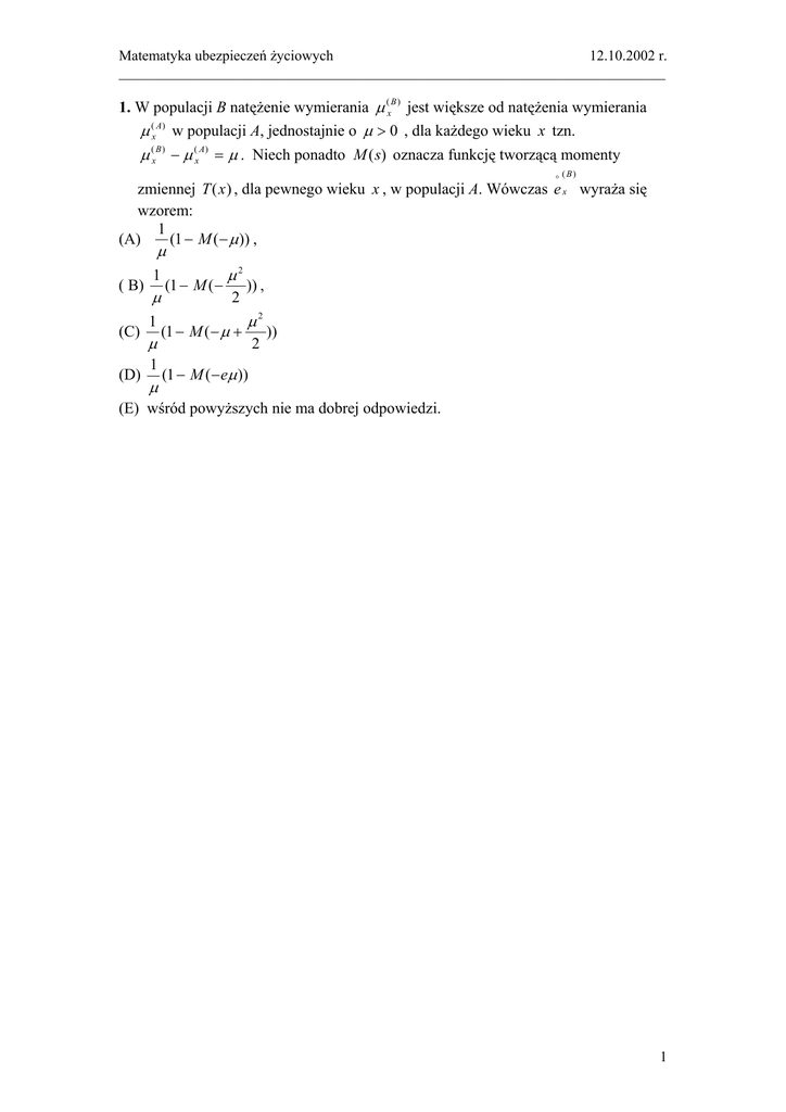 Matematyka ubezpieczeń życiowych 12.10.2002 r. ___________________________________________________________________________ 1. W populacji B natężenie wymierania µ (xB ) jest większe od natężenia wymierania µ (xA) w populacji A, jednostajnie o µ > 0 , dla każdego wieku x tzn. µ (xB ) − µ (xA) = µ . Niech ponadto M ( s) oznacza funkcję tworzącą momenty o ( B) zmiennej T ( x ) , dla pewnego wieku x , w populacji A. Wówczas e x wyraża się wzorem: 1 (A) (1 − M ( − µ )) , µ ( B) (C) (D) 1 µ 1 µ 1 µ (1 − M ( − µ2 2 (1 − M ( − µ + )) , µ2 2 )) (1 − M ( − eµ )) (E) wśród powyższych nie ma dobrej odpowiedzi. 1 Matematyka ubezpieczeń życiowych 12.10.2002 r. ___________________________________________________________________________ 2. Dane jest ubezpieczenie bezterminowe na życie, które wypłaca 20 000 zł, jeśli ubezpieczony umrze w ciągu najbliższych 30 lat lub 12 000 zł, jeśli umrze później. Świadczenie wypłacane jest w chwili śmierci . Niech Z oznacza wartość obecną świadczenia obliczoną przy technicznej intensywności oprocentowania δ = 0,03 . Oblicz Var ( Z ) , jeśli wiadomo, że µ x = const ≡ 0,01 . Podaj najbliższą odpowiedź. (A) 27 000 000 (E) 39 000 000. (B) 30 000 000 (C) 33 000 000 (D) 36 000 000 2 Matematyka ubezpieczeń życiowych 12.10.2002 r. ___________________________________________________________________________ 3. Rozważamy następujące dwa ubezpieczenia dyskretnego typu: P1 20-letnie na życie i dożycie dla (40) z sumą ubezpieczenia 1, P2 35-letnie na życie i dożycie dla (40) z sumą ubezpieczenia 1. Wiadomo, że stosunek wariancji straty ubezpieczyciela dla P2 do wariancji straty ubezpieczyciela dla P1 wynosi 2,571429 w przypadku zakupu tych polis za składki jednorazowe netto oraz wynosi 1,746143 w przypadku płacenia regularnych składek netto przez cały okres ubezpieczenia. Składka jednorazowa netto za P1 wynosi 0,334327. Techniczna stopa oprocentowania wynosi i = 6% . Oblicz składkę jednorazową netto za P2 (podaj najbliższą wartość). (A) (E) 0,19 0,27 (B) 0,21 (C) 0,23 (D) 0,25 3 Matematyka ubezpieczeń życiowych 12.10.2002 r. ___________________________________________________________________________ 4. Rozważamy dwa rodzaje ubezpieczeń terminowych dyskretnego typu: T1 20-letnie na życie dla 30-latka z sumą ubezpieczenia 1, T2 20-letnie na dożycie dla 30-latka z sumą ubezpieczenia 1. (r ) (r ) Oba opłacane są za pomocą regularnych składek netto. Niech π 12 (T1) , π 12 ( T 2) oznaczają ryzyko-składki zawarte w 13. regularnej składce kontraktu (odpowiednio) T1, T2. Dane są: (r ) π 12 (T1) = −1,881996 , a&&30:20| = 12,973599 (r ) π 12 (T 2) a&&43:7| = 6,031501 . Rezerwy składek netto dla T1 oraz T2, po 13 latach, wynoszą odpowiednio (wskaż najbliższe wartości): (A) 0,004 oraz 0,531 (D) 0,010 oraz 0,525 (B) (E) 0,006 oraz 0,529 0,006 oraz 0,523 (C) 0,008 oraz 0,527 4 Matematyka ubezpieczeń życiowych 12.10.2002 r. ___________________________________________________________________________ 5. Ubezpieczenie ciągłe ogólnego typu dla (x) jest opłacane za pomocą ciągłej renty życiowej regularnych składek w wysokości π (t ) = const ≡ 1 . Wiadomo, że wiek graniczny (nieprzekraczalny) w rozważanej populacji wynosi ω = x + 1 . Ponadto dla t ∈[0,1) zachodzi zależność t π s (t ) = π r (t ) 1− t Niech V (t ) oznacza rezerwę składek netto po czasie t. Oblicz granicę funkcji V (t ) , gdy t dąży do 1 (podaj najbliższą wartość). Wiadomo, że δ = 0,025 . (A) (E) 0,45 0,65 (B) 0,50 (C) 0,55 (D) 0,60 5 Matematyka ubezpieczeń życiowych 12.10.2002 r. ___________________________________________________________________________ 6. Rozważamy dożywotnie ubezpieczenie rentowe dla (40). Przez następne 25 lat (lub krócej w przypadku wcześniejszej śmierci) będzie on płacić roczną regularną składkę brutto P br . Po dożyciu wieku 65 lat zacznie otrzymywać coroczną rentę w wysokości 1 zł netto (na początku roku). A oto identyfikacja wszystkich kosztów: • jednorazowe koszty akwizycji wynoszą α = 0,5 zł. • koszt poboru składki lub wypłaty emerytury wynosi β = 1% przekazywanej kwoty, • roczne koszty obsługi ubezpieczenia, ponoszone każdorazowo na początku roku, przez cały okres ubezpieczenia wynoszą γ = 0,02 zł. Oblicz P br , jeśli dane są: a&&40:25| = 14,336139 , 25| a&&40 = 2,862772 . Podaj najbliższą wartość. (A) (E) 0,25 0,45 (B) 0,30 (C) 0,35 (D) 0,40 6 Matematyka ubezpieczeń życiowych 12.10.2002 r. ___________________________________________________________________________ 7. Rozważmy ubezpieczenie na wypadek śmierci dla (35). Jeśli ubezpieczony zginie w wypadku (J=2), to zostanie wypłacona suma ubezpieczenia 300 000 zł; jeśli umrze z innych przyczyn (J=1), zostanie wypłacone 120 000 zł (w obydwu przypadkach na koniec roku śmierci). Dane są: q1,55 = 0,01 q 2 ,55 = 0,001 . Wiadomo ponadto, że cała ryzyko-składka zawarta w 21. składce wynosi π r20 = 590,476190 oraz, że Var ( Λ 20 | K ≥ 20) = 58064000 . Oblicz ryzyko-składkę (w 21. składce) pokrywającą ryzyko śmierci w wypadku π r2 ,20 . Podaj najbliższą wartość. (A) (E) 170 210 (B) 180 (C) 190 (D) 200 7 Matematyka ubezpieczeń życiowych 12.10.2002 r. ___________________________________________________________________________ 8. Ubezpieczenie wdowie dla małżeństwa działa w następujący sposób: • jeśli on (y) umrze wcześniej niż ona (x), to ona zaczyna otrzymywać rentę dożywotnią wdowią (ciągłą) z intensywnością 1 na rok, • jeśli ona umrze wcześniej niż on, on otrzymuje jednorazowo, w chwili jej śmierci, zwrot wniesionych składek bez odsetek. Składka za to ubezpieczenie płacona jest w postaci renty ciągłej, z intensywnością P na rok, aż do pierwszej śmierci. Oblicz P . Dane są: µ x + t ≡ 0,01 , µ y + t ≡ 0,02 , δ = 0,03. Podaj najbliższą wartość. (A) (E) 0,4 0,8 (B) 0,5 (C) 0,6 (