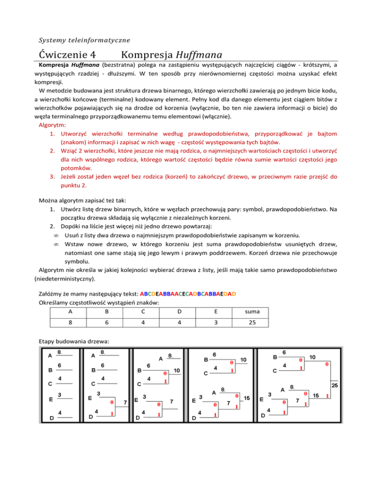 Systemy teleinformatyczne Kompresja Huffmana Ćwiczenie 4 Kompresja Huffmana (bezstratna) polega na zastąpieniu występujących najczęściej ciągów - krótszymi, a występujących rzadziej - dłuższymi. W ten sposób przy nierównomiernej częstości można uzyskać efekt kompresji. W metodzie budowana jest struktura drzewa binarnego, którego wierzchołki zawierają po jednym bicie kodu, a wierzchołki końcowe (terminalne) kodowany element. Pełny kod dla danego elementu jest ciągiem bitów z wierzchołków pojawiających się na drodze od korzenia (wyłącznie, bo ten nie zawiera informacji o bicie) do węzła terminalnego przyporządkowanemu temu elementowi (włącznie). Algorytm: 1. Utworzyć wierzchołki terminalne według prawdopodobieństwa, przyporządkować je bajtom (znakom) informacji i zapisać w nich wagę - częstość występowania tych bajtów. 2. Wziąć 2 wierzchołki, które jeszcze nie mają rodzica, o najmniejszych wartościach częstości i utworzyć dla nich wspólnego rodzica, którego wartość częstości będzie równa sumie wartości częstości jego potomków. 3. Jeżeli został jeden węzeł bez rodzica (korzeń) to zakończyć drzewo, w przeciwnym razie przejść do punktu 2. Można algorytm zapisać też tak: 1. Utwórz listę drzew binarnych, które w węzłach przechowują pary: symbol, prawdopodobieństwo. Na początku drzewa składają się wyłącznie z niezależnych korzeni. 2. Dopóki na liście jest więcej niż jedno drzewo powtarzaj: • Usuń z listy dwa drzewa o najmniejszym prawdopodobieństwie zapisanym w korzeniu. • Wstaw nowe drzewo, w którego korzeniu jest suma prawdopodobieństw usuniętych drzew, natomiast one same stają się jego lewym i prawym poddrzewem. Korzeń drzewa nie przechowuje symbolu. Algorytm nie określa w jakiej kolejności wybierać drzewa z listy, jeśli mają takie samo prawdopodobieństwo (niedeterministyczny). Załóżmy że mamy następujący tekst: ABCDEABBAACECADBCABBAEDAD Określamy częstotliwość wystąpień znaków: A B C D E 8 6 Etapy budowania drzewa: 4 4 3 suma 25 Budujemy zatem drzewo binarne posortowane wg wystąpień – z wagami. Łączymy węzły sąsiadujące o najmniejszych prawdopodobieństwach wystąpień parami, sumując prawdopodobieństwa - aż uzyskamy korzeń. Przydzielamy bity 0 i 1 poszczególnym gałęziom. Reprezentacja znaków sekwencjami kodowymi (binarnymi) – zaczynamy od korzenia, poruszając się po drzewie aż do symbolu: A 10 B 00 C 01 D 111 E 110 ABCDEABB... = > 100001111110100000 itd.. Dekodowanie w metodzie Huffmana odbywa się w następujący sposób: 1. Bity czytane są od lewej do prawej, aż do momentu wykrycia kodu pojedynczego symbolu określonego przez drzewo kodowe. 2. Bity te zostają usunięte z ciągu bitów, a zdekodowany symbol zapamiętany. Następuje ponowne wykonanie punktu 1. 3. Punkty 1. i 2. są wykonywane aż do momentu odczytania całego ciągu bitów. Zauważmy ważną cechę metody - odczytanie tekstu nie sprawi problemów, mimo braku separatorów międzyznakowych. Zalety kompresji Huffmana: • Niewielka długość kodu – z powodu wystąpienia krótkich symboli dla najczęściej występujących znaków. • Brak konieczności stosowania separatorów dla symboli kodowych ! Zadania 1. Wykorzystując częstotliwości znaków: a j s 0.088 b 0.032 k 0.044 t 0.016 c 0.030 l 0.035 u 0.030 d 0.025 m 0.039 v 0.034 e 0.047 n 0.002 w 0.089 f 0.058 o 0.044 x 0.004 g 0.093 p 0.000 y 0.011 h 0.040 q 0.037 z 0.023 0.000 0.046 i r 0.071 0.062 zbudować drzewo kodowe dla wszystkich 24 liter alfabetu. Po utworzeniu drzewa zakodować słowo „teleinformatyka” i zilustrować jego dekodowanie. 2. Mamy obraz bitowy zdefiniowany następująco: Skompresować obrazek metodą Huffmana.