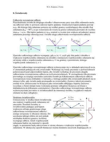 M.A. Karpierz, Fizyka 8. Światłowody Całkowite wewnętrzne odbicie Przechodzenie światła do drugiego ośrodka i obserwowany przy tym efekt załamania może się odbywać tylko w pewnym zakresie kątów padania. Granicznym kątem padania jest kąt αGR, dla którego fala załamana porusza się wzdłuż granicy rozdzielającej oba ośrodki (kąt załamania βGR = 90O), co po wstawieniu do wzoru na prawo załamania prowadzi do wyniku: sinαGR = n2/n1. Dla kątów padania α>αGR wartość n1/n2sinα jest większa od jedności, prawo załamania przestaje obowiązywać i światło ulega całkowitemu wewnętrznemu odbiciu. n1 n2 < n1 n1 α β n1 α GR β G R = 90 o n2 < n1 α>αGR n2 < n1 Zjawisko całkowitego odbicia występuje, gdy n1/n2>1, czyli gdy fala pada z ośrodka o większym współczynniku załamania na ośrodek o mniejszym współczynniku załamania np. od strony szkła o współczynniku załamania n1>1 na granicę z powietrzem, którego współczynnik załamania n2 ≈ 1. Zjawisko całkowitego wewnętrznego odbicia wykorzystuje się w układach optycznych m.in. w elementach pełniących rolę zwierciadeł. Wykonuje się wtedy pryzmaty o powierzchniach polerowanych pod odpowiednim kątem, aby światło wchodząc do pryzmatu ulegało całkowitemu wewnętrznemu odbiciu na tych powierzchniach. W szczególności dla pryzmatu powstałego ze ściętego narożnika sześcianu światło po kilkukrotnym całkowitym odbiciu wewnętrznym wraca dokładnie w kierunku, z którego padało (dla zwierciadeł płaskich ma to miejsce tylko, gdy światło pada prostopadle na zwierciadło). Zestawy takich pryzmatów zostały m.in. umieszczone na Księżycu jako zwierciadła odbijające impulsy laserowe wysyłane z Ziemi (dzięki temu wykonano pomiary odległości Księżyca od Ziemi z dokładnością do kilkunastu centymetrów). Zjawisko całkowitego wewnętrznego odbicia wykorzystywane jest także w światłowodach do transmisji światła z wyjątkowo małymi stratami na duże odległości. α1<αGR Struktura światłowodów α2>αGR n2 Umieszczony w środku rdzeń światłowodu ma większy współczynnik załamania niż otoczenie. Promień świetlny w α1 n1>n2 α2 światłowodzie padający pod kątem n większym od kąta granicznego ulega n2 całkowitemu wewnętrznemu odbiciu i zostaje uwięziony w obszarze rdzenia. Do n>n2 uzyskania takiego efektu nie jest jednak α niezbędna skokowa granica, na której występuje odbicie. Jeżeli współczynnik n2 załamania będzie się zmieniał w sposób ciągły, to promienie będą zakrzywiane w stronę obszaru o większym współczynniku załamania. W identyczny sposób tłumaczyć można działanie soczewek skupiających: w 8.1 M.A. Karpierz, Fizyka środku soczewka jest grubsza, co jest równoznaczne z większym przyrostem fazy fali, czyli średnia wartość współczynnika załamania jest większa niż na brzegu soczewki. Mody światłowodowe Prowadzenie fali świetlnej wewnątrz n2 B światłowodu wymaga, aby kąt padania był większy od kąta granicznego. Nie jest to F A n1 jednak warunek wystarczający. Jeśli fala h kolejno odbita na dwu granicach (tor D promienia ABCD na rysunku) nie będzie E C n2 miała tej samej fazy, co fala, która przebyła inną drogę (tor promienia EF) to obie fale będą się wygaszać i energia fali będzie wypływać na zewnątrz światłowodu. Dla propagacji światła wewnątrz światłowodu konieczna jest pozytywna interferencja fal płaskich odbijanych na granicach, czyli różnica faz pomiędzy nimi musi być całkowitą wielokrotnością 2π. Dla przypadku jak na rysunku warunek ten wynosi: 2π AB + BC + CD − EF n1 + ∆φ B + ∆φ C = 2πm , m = 0,1,2... λ gdzie oprócz różnicy dróg optycznych (będących iloczynem odległości i liczby falowej) uwzględniona jest zmiana fazy ∆φ powstająca przy odbiciu w punktach B i C. Analogiczny warunek można wprowadzić dla promieni zakrzywianych w falowodzie o nieskokowej zmianie współczynnika załamania światła. Uwzględnienie warunku interferencji powoduje, że dla każdej wartości liczby całkowitej m uzyskuje się co najwyżej jeden kąt αm i w rezultacie liczba kątów αm dla których propaguje się światło w światłowodzie jest skończona. Postać pola związana z jednym kątem αm nazywana jest modem światłowodowym. ( ) Liczba modów i odpowiadająca im wartość 1 kąta αm zależy od wielkości zwanej m=0 2 2 1/2 unormowaną częstością V = (n1 − n2 ) h/λ, m=1 gdzie h jest grubością światłowodu. Wraz ze m=2 wzrostem wartości V rośnie liczba modów cos αm prowadzonych w światłowodzie (rysunek m=3 obok). W światłowodzie jednomodowym grubość h musi być mała w porównaniu z cos αGR długością fali λ i mała musi być różnica 0 1 2 3 4 współczynników załamania pomiędzy V = (n12 − n22)1/2 h/λ rdzeniem a otoczeniem n12 − n22. Dla światła widzialnego średnice rdzenia muszą być wówczas rzędu pojedynczych mikrometrów. Wytwarzanie światłowodów jednomodowych wymaga bardziej zaawansowanych technologii. Światłowody takie mają jednak zalety w porównaniu ze światłowodami wielomodowymi. W światłowodzie wielomodowym każdemu z modów odpowiada inna prędkość fazowa i inna prędkość grupowa. Zatem światło wprowadzone do światłowodu wielomodowego jest przesyłane z różnymi prędkościami. W szczególności, gdy przesyłany jest impuls świetlny, to dociera on na końcu światłowodu wielomodowego wydłużony i zniekształcony. Również rozkład poprzeczny pola odbiega od rozkładu wejściowego, gdyż jest wynikiem interferencji wielu modów poprzesuwanych w fazie a ze względu na niejednorodność światłowodu różnice faz są przypadkowe. W światłowodach jednomodowych wydłużenie impulsów jest nieznaczne i wynika z dyspersji ośrodka. Odbywa się to jednak kosztem całkowitej energii 8.2 M.A. Karpierz, Fizyka przenoszonej przez światłowód gdyż światło wewnątrz światłowodu jednom