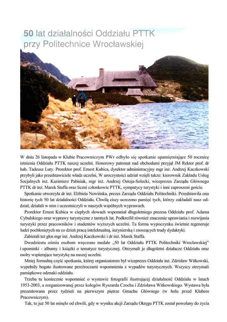 W dniu 26 listopada w Klubie Pracowniczym PWr odbyło się spotkanie upamiętniające 50 rocznicę istnienia Oddziału PTTK naszej uczelni. Honorowy patronat nad obchodami przyjął JM Rektor prof. dr hab. Tadeusz Luty. Prorektor prof. Ernest Kubica, dyrektor administracyjny mgr inż. Andrzej Kaczkowski przybyli jako przedstawiciele władz uczelni, W uroczystości udział wzięli także: kierownik Zakładu Usług Socjalnych inż. Kazimierz Pabisiak, mgr inż. Andrzej Ostoja-Solecki, wiceprezes Zarządu Głównego PTTK dr inż. Marek Staffa oraz liczni członkowie PTTK, sympatycy turystyki i inni zaproszeni goście. Spotkanie otworzyła dr inż. Elżbieta Nowińska, prezes Zarządu Oddziału Politechniki. Przedstawiła ona historię tych 50 lat działalności Oddziału. Chwilą ciszy uczczono pamięć tych, którzy zakładali nasz oddział, działali w nim i uczestniczyli w naszych wspólnych wyprawach. Prorektor Ernest Kubica w ciepłych słowach wspomniał długoletniego prezesa Oddziału prof. Adama Cybulskiego oraz wyprawy turystyczne z tamtych lat. Podkreślił również znaczenie uprawiania i rozwijania turystyki przez pracowników i studentów wyższych uczelni. Ta forma wypoczynku świetnie regeneruje ludzi pochłoniętych na co dzień pracą intelektualną, inżynierską i znoszących trudy dydaktyki. Zabierali też głos mgr inż. Andrzej Kaczkowski i dr inż. Marek Staffa. Dwudziestu ośmiu osobom wręczono medale „50 lat Oddziału PTTK Politechniki Wrocławskiej" i upominki - albumy i książki o tematyce turystycznej. Otrzymali je długoletni działacze Oddziału oraz osoby wspierające turystykę na naszej uczelni. Mniej formalną część spotkania, której organizatorem był wiceprezes Oddziału inż. Zdzisław Witkowski, wypełniły bogato ilustrowane przeźroczami wspomnienia z wypadów turystycznych. Wszyscy otrzymali pamiątkowe odznaki oddziału. Trzeba tu koniecznie wspomnieć o wystawie fotografii ilustrującej działalność Oddziału w latach 1953-2003, a zorganizowanej przez kolegów Ryszarda Czocha i Zdzisława Witkowskiego. Wystawa była prezentowana przez tydzień na pierwszym piętrze Gmachu Głównego (w holu przed Klubem Pracowniczym). Tak, to już 50 lat minęło od chwili, gdy w wyniku akcji Zarządu Okręgu PTTK został powołany do życia Oddział przy Politechnice Wrocławskiej. 12 maja 1953 roku wybrano pierwszy Zarząd Oddziału. Jego prezesem był prof. Tadeusz Broniewski, wiceprezesami - prof. H. Gumienny i T. Drożdżewski, sekretarzem - M. Łapińska-Cybulska, z-cą sekretarza-J. Martynowicz, skarbnikiem - M. Ślusarska, z-cą skarbnika - B. Peszkowska, a Tadeusz Zipser był członkiem Zarządu. W skład komisji rewizyjnej wchodzili: Z. Szafran, prof. E. Dworzak, S. Fuliński i R. Hajman. Oczywiście na przestrzeni tych 50 lat Zarząd Oddziału zmieniał się wielokrotnie. Trudno tu wymienić pełne składy osobowe kolejnych zarządów, ale wypada przedstawić przynajmniej wszystkich prezesów Oddziału: prof. T. Broniewski (1953-1956), prof. T. Waszkiewicz (1956-1957), prof. A. Cybulski (1957-1966), doc. B. Bałaziński (1966-1970), doc. W. Kazimierczak (1970-1981), dr inż. R. Czoch (1981-1989), dr inż. E. Nowińska (1989- ). Nie można też zapomnieć o Sekretariacie Oddziału, który bez względu na skromne warunki lokalowe pełni cały czas rolę biura, wypożyczalni sprzętu turystycznego oraz miejsca spotkań zarządu działaczy i sympatyków. Pierwszą kierowniczką sekretariatu była Krystyna Ostaszkiewicz-Gąsiorowska. Jej następcami kolejno byli: Kazimierz Krzyżak, Witold Bania i pani Irena Okolów. Obecnie funkcję tę pełni z wielkim zaangażowaniem pani Magda Zawada. Dzięki Jej inicjatywie lokal sekretariatu stał się bardziej funkcjonalny i estetyczny. Od początku działalności Oddziału PTTK przy PWr wykształciły się pewne formy turystyki popularne do dzisiaj. Narciarstwo było i jest bardzo popularne zarówno wśród kadry jak i studentów, wśród starszych i młodszych, w górach bliskich i dalekich, tych niższych i wysokich. Pierwszym przewodniczącym Komisji Narciarskiej był prof. Adam Cybulski -późniejszy długoletni prezes Oddziału. Regulamin, który opracował przewodniczący Komisji Narciarskiej, połowę miejsc na obozach i rajdach przewidywał dla pracowników, natomiast drugą połowę dla studentów. Za najważniejsze uznawał naukę jazdy na nartach. Organizowano ją w Szczyrku, na Szyndzielni, u Bustryckich na Hali Gąsienicowej, w Bronku Czechu, w Strzesze Akademickiej i w Zieleńcu. Instruktorami byli zazwyczaj pracownicy naszego Studium WF, magistrowie Adam Dotzauer, Leszek Kucharski, Józef Bogdanowicz i Zdzisław Wolański. Potem przyszli młodsi. Przepraszamy, że wszystkich nie wymienimy. Oprócz obozów organizowaliśmy wyjazdy na Wysokogórskie Rajdy Tatrzańskie. Drużyna Oddziału uczestniczyła w takich rajdach wielokrotnie, a tym, który prowadził ją w latach pięćdziesiątych, był nieodżałowany Adaś Dotzauer. Inną formą działalności na tym polu były niedzielne, a potem sobotnio-niedzielne expres-narty czy wielokrotny udział naszej drużyny w Biegu Piastów i Gwarków. Sprawą, która łączyła zawsze wszystkich członków naszego Oddziału, była i jest nadal turystyka górska. Uprawiano różne jej formy: od najbardziej ambitnej turystyki wysokogórskiej (bo przez pewien czas działał Klub Wysokogórski pod przewodnictwem kolegi Tadeusza Zipsera) po masowe wycieczki czy udziały w licznych rajdach. Wycieczki często były prowadzone przez profesorów Tworowskiego, Waszkiewicza i Cybulskiego. W latach sześćdziesiątych przyszła moda na Rajdy Świętojańskie, rajdy nocne, rajdy pod parasolem, wycieczki na pieczenie ziemniaków. Wśród organizatorów tych imprez byli doc. Mirek Walkowiak, prof. Władzio Mironowicz, kol. Wojciech Klimek, prof. Wojtek Suski i inni. Działalność krajoznawcza kwitła. W późniejszych latach komisja górska to: doc. Witold Kazimierczak