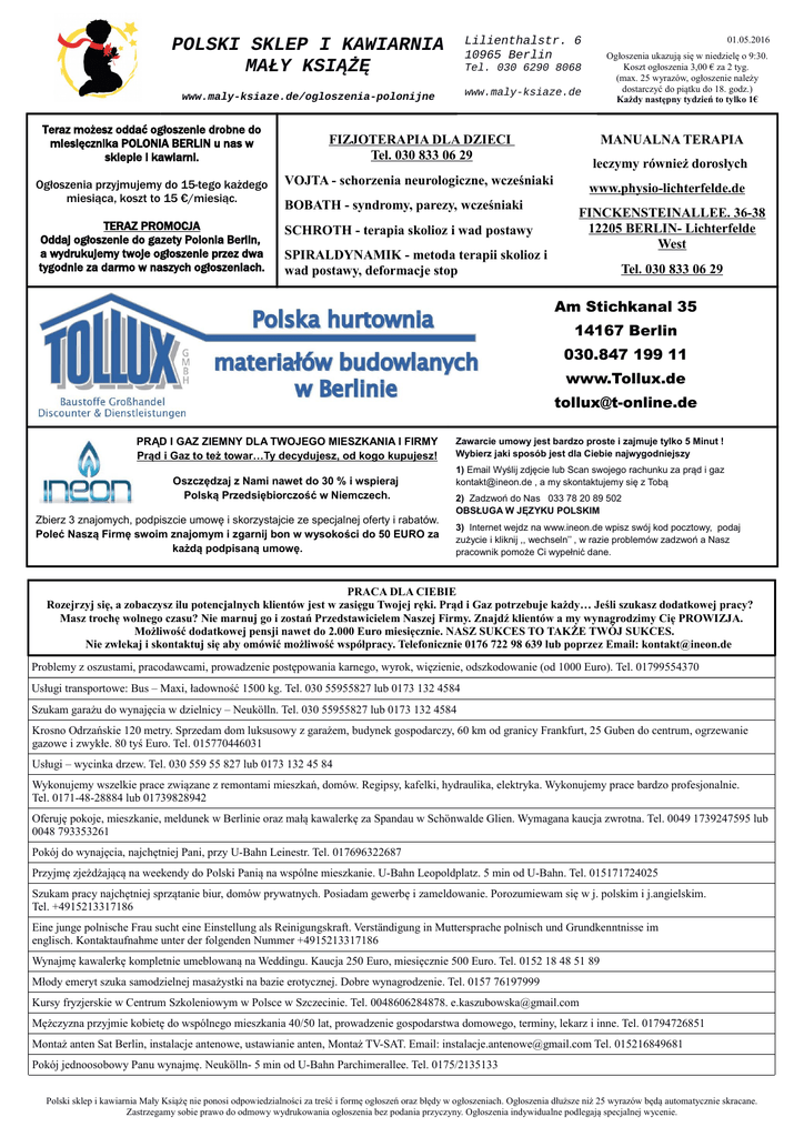 POLSKI SKLEP I KAWIARNIA MAŁY KSIĄŻĘ Lilienthalstr. 6 10965 Berlin www.maly-ksiaze.de/ogloszenia-polonijne www.maly-ksiaze.de Teraz możesz oddać ogłoszenie drobne do miesięcznika POLONIA BERLIN u nas w sklepie i kawiarni. 01.05.2016 Ogłoszenia ukazują się w niedzielę o 9:30. Koszt ogłoszenia 3,00 € za 2 tyg. (max. 25 wyrazów, ogłoszenie należy dostarczyć do piątku do 18. godz.) Każdy następny tydzień to tylko 1€ Tel. 030 6290 8068 FIZJOTERAPIA DLA DZIECI Tel. 030 833 06 29 Ogłoszenia przyjmujemy do 15-tego każdego miesiąca, koszt to 15 €/miesiąc. VOJTA - schorzenia neurologiczne, wcześniaki TERAZ PROMOCJA Oddaj ogłoszenie do gazety Polonia Berlin, a wydrukujemy twoje ogłoszenie przez dwa tygodnie za darmo w naszych ogłoszeniach. SCHROTH - terapia skolioz i wad postawy BOBATH - syndromy, parezy, wcześniaki SPIRALDYNAMIK - metoda terapii skolioz i wad postawy, deformacje stop MANUALNA TERAPIA leczymy również dorosłych www.physio-lichterfelde.de FINCKENSTEINALLEE. 36-38 12205 BERLIN- Lichterfelde West Tel. 030 833 06 29 Am Stichkanal 35 14167 Berlin 030.847 199 11 www.Tollux.de [email protected] PRĄD I GAZ ZIEMNY DLA TWOJEGO MIESZKANIA I FIRMY Prąd i Gaz to też towar…Ty decydujesz, od kogo kupujesz! Oszczędzaj z Nami nawet do 30 % i wspieraj Polską Przedsiębiorczość w Niemczech. Zbierz 3 znajomych, podpiszcie umowę i skorzystajcie ze specjalnej oferty i rabatów. Poleć Naszą Firmę swoim znajomym i zgarnij bon w wysokości do 50 EURO za każdą podpisaną umowę. Zawarcie umowy jest bardzo proste i zajmuje tylko 5 Minut ! Wybierz jaki sposób jest dla Ciebie najwygodniejszy 1) Email Wyślij zdjęcie lub Scan swojego rachunku za prąd i gaz [email protected] , a my skontaktujemy się z Tobą 2) Zadzwoń do Nas 033 78 20 89 502 OBSŁUGA W JĘZYKU POLSKIM 3) Internet wejdz na www.ineon.de wpisz swój kod pocztowy, podaj zużycie i kliknij ,, wechseln’’ , w razie problemów zadzwoń a Nasz pracownik pomoże Ci wypełnić dane. PRACA DLA CIEBIE Rozejrzyj się, a zobaczysz ilu potencjalnych klientów jest w zasięgu Twojej ręki. Prąd i Gaz potrzebuje każdy… Jeśli szukasz dodatkowej pracy? Masz trochę wolnego czasu? Nie marnuj go i zostań Przedstawicielem Naszej Firmy. Znajdź klientów a my wynagrodzimy Cię PROWIZJA. Możliwość dodatkowej pensji nawet do 2.000 Euro miesięcznie. NASZ SUKCES TO TAKŻE TWÓJ SUKCES. Nie zwlekaj i skontaktuj się aby omówić możliwość współpracy. Telefonicznie 0176 722 98 639 lub poprzez Email: [email protected] Problemy z oszustami, pracodawcami, prowadzenie postępowania karnego, wyrok, więzienie, odszkodowanie (od 1000 Euro). Tel. 01799554370 Usługi transportowe: Bus – Maxi, ładowność 1500 kg. Tel. 030 55955827 lub 0173 132 4584 Szukam garażu do wynajęcia w dzielnicy – Neukölln. Tel. 030 55955827 lub 0173 132 4584 Krosno Odrzańskie 120 metry. Sprzedam dom luksusowy z garażem, budynek gospodarczy, 60 km od granicy Frankfurt, 25 Guben do centrum, ogrzewanie gazowe i zwykłe. 80 tyś Euro. Tel. 015770446031 Usługi – wycinka drzew. Tel. 030 559 55 827 lub 0173 132 45 84 Wykonujemy wszelkie prace związane z remontami mieszkań, domów. Regipsy, kafelki, hydraulika, elektryka. Wykonujemy prace bardzo profesjonalnie. Tel. 0171-48-28884 lub 01739828942 Oferuję pokoje, mieszkanie, meldunek w Berlinie oraz małą kawalerkę za Spandau w Schönwalde Glien. Wymagana kaucja zwrotna. Tel. 0049 1739247595 lub 0048 793353261 Pokój do wynajęcia, najchętniej Pani, przy U-Bahn Leinestr. Tel. 017696322687 Przyjmę zjeżdżającą na weekendy do Polski Panią na wspólne mieszkanie. U-Bahn Leopoldplatz. 5 min od U-Bahn. Tel. 015171724025 Szukam pracy najchętniej sprzątanie biur, domów prywatnych. Posiadam gewerbę i zameldowanie. Porozumiewam się w j. polskim i j.angielskim. Tel. +4915213317186 Eine junge polnische Frau sucht eine Einstellung als Reinigungskraft. Verständigung in Muttersprache polnisch und Grundkenntnisse im englisch. Kontaktaufnahme unter der folgenden Nummer +4915213317186 Wynajmę kawalerkę kompletnie umeblowaną na Weddingu. Kaucja 250 Euro, miesięcznie 500 Euro. Tel. 0152 18 48 51 89 Młody emeryt szuka samodzielnej masażystki na bazie erotycznej. Dobre wynagrodzenie. Tel. 0157 76197999 Kursy fryzjerskie w Centrum Szkoleniowym w Polsce w Szczecinie. Tel. 0048606284878. [email protected] Mężczyzna przyjmie kobietę do wspólnego mieszkania 40/50 lat, prowadzenie gospodarstwa domowego, terminy, lekarz i inne. Tel. 01794726851 Montaż anten Sat Berlin, instalacje antenowe, ustawianie anten, Montaż TV-SAT. Email: [email protected] Tel. 015216849681 Pokój jednoosobowy Panu wynajmę. Neukölln- 5 min od U-Bahn Parchimerallee. Tel. 0175/2135133 Polski sklep i kawiarnia Mały Książę nie ponosi odpowiedzialności za treść i formę ogłoszeń oraz błędy w ogłoszeniach. Ogłoszenia dłuższe niż 25 wyrazów będą automatycznie skracane. Zastrzegamy sobie prawo do odmowy wydrukowania ogłoszenia bez podania przyczyny. Ogłoszenia indywidualne podlegają specjalnej wycenie. Wedding wynajmę pokój przy U-Bahn Osloerstr. Tylko osoby bez nałogów, najchętniej osoby wyjeżdżające na koniec tyg. cena 420 Euro. Tel. +48739604634 lub +4915218524399 Szukam pracy (Gewerba) Pomoc budowlanaregipsy, regeneracja okien, drzwi, malowanie itp. Tel. 01633900133 Megtrans Kleintransporte. Przeprowadzki, opróżnianie pomieszczeń, przewóz sklep-dom, Berlin i okolice, Polska. 24h E-mail: [email protected]. Tel. 0177 6423550 lub 015117890903, www.megtrans.de Poszukuję pokojówki do Małego Hotelu w centrum Berlina. Tel. 030 89567087 Poszukuję pracy od czerwca do września jako opiekunka do dziecka, pomoc domowa, praca w kuchni lub kawiarni. Jestem odpowiedzialną, szybko uczącą się osobą. Tel. 01724976247 Panie przyjmiemy do pracy w Hotelu (sprzątanie klatek schodowych, pokoje) na Gewerbe. Tel. 01735152021 lub 01735130575 Przyjmę do mieszkania. Kawalerka 30m². Pani