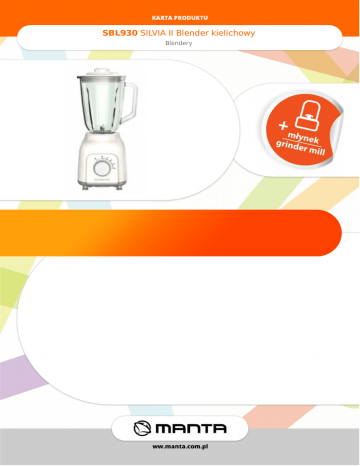 SBL930SILVIAIIBlenderkielichowy Blendery SBL930SILVIAIIBlenderkielichowy Blendery Specyfikacja Akcesoriawzestawie Szklanydzbanpoj.1,5L,staloweostrza, młynek Mocurządzenia 350W Funkcje 4prędkości,pulsacyjneobroty,nóżki antypoślizgowe,bezpiecznezamknięcie http://www.manta.com.pl/pl/sbl930 EAN:5902510606664