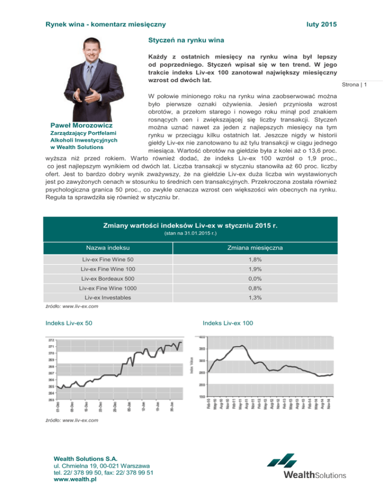 Rynek wina - komentarz miesięczny luty 2015 Styczeń na rynku wina Każdy z ostatnich miesięcy na rynku wina był lepszy od poprzedniego. Styczeń wpisał się w ten trend. W jego trakcie indeks Liv-ex 100 zanotował największy miesięczny wzrost od dwóch lat. W połowie minionego roku na rynku wina zaobserwować można było pierwsze oznaki ożywienia. Jesień przyniosła wzrost obrotów, a przełom starego i nowego roku minął pod znakiem rosnących cen i zwiększającej się liczby transakcji. Styczeń Paweł Morozowicz można uznać nawet za jeden z najlepszych miesięcy na tym Zarządzający Portfelami rynku w przeciągu kilku ostatnich lat. Jeszcze nigdy w historii Alkoholi Inwestycyjnych giełdy Liv-ex nie zanotowano tu aż tylu transakcji w ciągu jednego w Wealth Solutions miesiąca. Wartość obrotów na giełdzie była z kolei aż o 13,6 proc. wyższa niż przed rokiem. Warto również dodać, że indeks Liv-ex 100 wzrósł o 1,9 proc., co jest najlepszym wynikiem od dwóch lat. Liczba transakcji w styczniu stanowiła aż 60 proc. liczby ofert. Jest to bardzo dobry wynik zważywszy, że na giełdzie Liv-ex duża liczba win wystawionych jest po zawyżonych cenach w stosunku to średnich cen transakcyjnych. Przekroczona została również psychologiczna granica 50 proc., co zwykle oznacza wzrost cen większości win obecnych na rynku. Reguła ta sprawdziła się również w styczniu br. Zmiany wartości indeksów Liv-ex w styczniu 2015 r. (stan na 31.01.2015 r.) Nazwa indeksu Zmiana miesięczna Liv-ex Fine Wine 50 1,8% Liv-ex Fine Wine 100 1,9% Liv-ex Bordeaux 500 0,0% Liv-ex Fine Wine 1000 0,8% Liv-ex Investables 1,3% źródło: www.liv-ex.com Indeks Liv-ex 50 źródło: www.liv-ex.com Wealth Solutions S.A. ul. Chmielna 19, 00-021 Warszawa tel. 22/ 378 99 50, fax: 22/ 378 99 51 www.wealth.pl Indeks Liv-ex 100 Strona | 1 Rynek wina - komentarz miesięczny luty 2015 Wzrost notowań indeksów w styczniu jest zasługą kilku czynników. Pierwszym i najważniejszym jest ogólna poprawa nastrojów na całym rynku. Drugim są dobre noty przyznane przez krytyków winom z bordoskiego rocznika 2005, a trzecim był zbliżający się chiński Nowy Rok. Nie bez znaczenia jest też relacja dolara do funta i do euro. Umacniający się dolar jest dodatkowym czynnikiem, który przyciąga kupujących ze Stanów Zjednoczonych. Ciągły wzrost obrotów pod względem wielkości, jak również ich wartości można było obserwować Strona | 2 na giełdzie Liv-ex już od kilku miesięcy. Właściwie każdy następujący po sobie miesiąc w przeciągu ostatniego półrocza był lepszy od swojego poprzednika. Styczeń z pewnością wpisał się w ten trend. Bordeaux znów wraca do łask miłośników wina na całym świecie. Popyt na najlepsze bordoskie wina rośnie m.in. na rynku chińskim, przy czym obecnie dominują na nim świadome i czysto konsumpcyjne zakupy. We wcześniejszych latach wina te były głównie luksusowym prezentem biznesowym i sposobem na podkreślenie statusu społecznego. W takim przypadku walory nabywanego wina schodziły często na drugi plan. Zmiana ta jest dobrą informacją dla rynku wina bordoskiego, ponieważ pokazuje, że na Dalekim Wschodzie powstała już grupa świadomych i zamożnych miłośników wina. Był to również dobry sygnał w związku z chińskim Nowym Rokiem, który zwyczajowo jest okresem wzmożonych zakupów na rynku wina. Zaobserwowano także zwiększający się popyt na wino bordoskie w Europie Środkowej i Wschodniej, czy Stanach Zjednoczonych, które zawsze były ważnym rynkiem dla win pochodzących znad Żyrondy. Styczeń przyniósł również wzrost zainteresowania winami włoskimi i burgundzkimi. Zgromadziły one pod swoimi skrzydłami odpowiednia 5,7 oraz 5,3 proc. rynku, co jest w przypadku tych bardzo dobrym wynikiem. Najszybciej drożejące roczniki Bordeaux Do najszybciej drożejących roczników bordoskich należały w ostatnich sześciu miesiącach: 2002, 2003, 2005, 2006 i 2010. Rocznik 2009 utrzymywał się na podobnym poziomie cenowym od połowy roku 2014, a w przypadku rocznika 2011 odnotowano korektę. Procentowa zmiana wartości win z danego rocznika w styczniu br. (wina notowane w indeksie Liv-ex 500) źródło: www.liv-ex.com Wealth Solutions S.A. ul. Chmielna 19, 00-021 Warszawa tel. 22/ 378 99 50, fax: 22/ 378 99 51 www.wealth.pl Rynek wina - komentarz miesięczny luty 2015 Rocznik 2005 Pod koniec grudnia Robert Parker ogłosił również nowe oceny różnych roczników Mouton Rothschild. Rocznik 2005, który jeszcze w kwietniu 2008 r. cieszył się notą wysokości 96 p., a w kwietniu 93-95 p., został przy tej okazji oceniony aż na 99+. Tak dobry wynik zwrócił uwagę kupujących na to wino i na cały rocznik 2005, który już od pewnego czasu uchodził za niedoceniony. Warto dodać, że Robert Parker już od kilku miesięcy podczas ponownych tastingów bordoskiego rocznika 2005 poprawia Strona | 3 swoje wcześniejsze oceny. Oczywiście lepsze noty przełożyły się na wzrost cen i liczbę transakcji. W obrocie winem bordoskim od dłuższego czasu dominował znakomity duet roczników – 2009 oraz 2010. W styczniu to jednak rocznik 2005 odpowiadał aż 20 proc. obrotów winem bordoskim. Największym zainteresowaniem spośród wszystkich win obecnych na giełdzie - mierzonym liczbą wyświetleń na stronie Liv-ex - cieszyło się oczywiście Mouton Rothschild 2005. Wino to zanotowało dwa razy więcej wyświetleń niż Angleus 2012, który znalazł się na drugiej pozycji zestawienia najczęściej wyszukiwanych win na giełdzie. Nowe noty przełożyły się nie tylko na wzrost obrotów i zainteresowanie wspomnianym rocznikiem, ale oczywiście także na jego ceny. Wina wchodzące w jego skład zdominowały nawet zestawienie pięciu najszybciej drożejących win w styczniu. Pięć najszybciej drożejących win na giełdzie Liv-ex w styczniu 2015 r. Wino Rocznik Średnia cena w styczniu 2015 r. (GBP)* Wzrost ceny Mission Ha