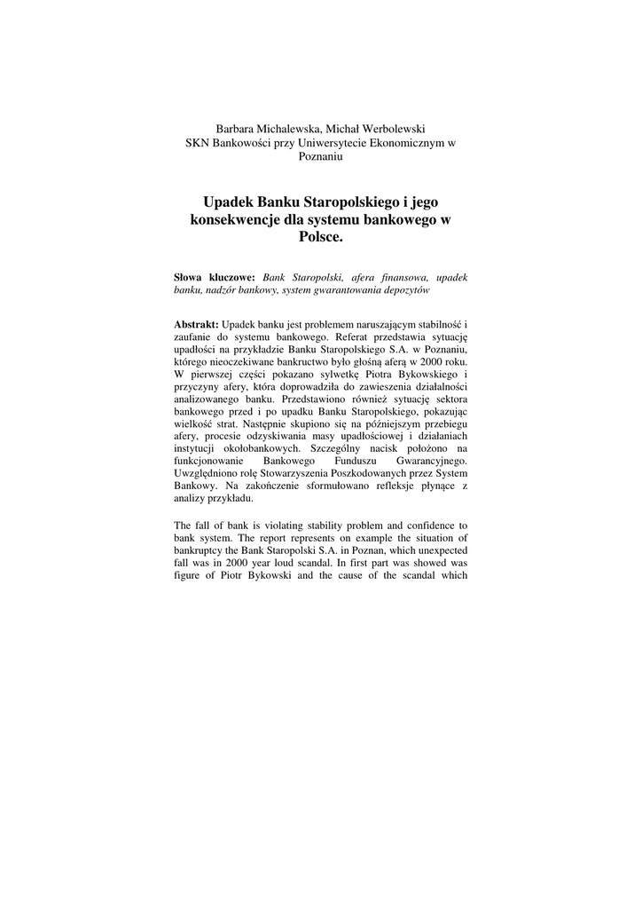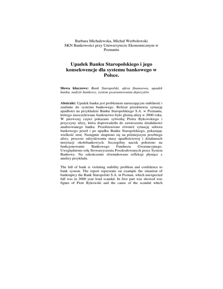 Barbara Michalewska, Michał Werbolewski SKN Bankowości przy Uniwersytecie Ekonomicznym w Poznaniu Upadek Banku Staropolskiego i jego konsekwencje dla systemu bankowego w Polsce. Słowa kluczowe: Bank Staropolski, afera finansowa, upadek banku, nadzór bankowy, system gwarantowania depozytów Abstrakt: Upadek banku jest problemem naruszającym stabilność i zaufanie do systemu bankowego. Referat przedstawia sytuację upadłości na przykładzie Banku Staropolskiego S.A. w Poznaniu, którego nieoczekiwane bankructwo było głośną aferą w 2000 roku. W pierwszej części pokazano sylwetkę Piotra Bykowskiego i przyczyny afery, która doprowadziła do zawieszenia działalności analizowanego banku. Przedstawiono również sytuację sektora bankowego przed i po upadku Banku Staropolskiego, pokazując wielkość strat. Następnie skupiono się na późniejszym przebiegu afery, procesie odzyskiwania masy upadłościowej i działaniach instytucji okołobankowych. Szczególny nacisk położono na funkcjonowanie Bankowego Funduszu Gwarancyjnego. Uwzględniono rolę Stowarzyszenia Poszkodowanych przez System Bankowy. Na zakończenie sformułowano refleksje płynące z analizy przykładu. The fall of bank is violating stability problem and confidence to bank system. The report represents on example the situation of bankruptcy the Bank Staropolski S.A. in Poznan, which unexpected fall was in 2000 year loud scandal. In first part was showed was figure of Piotr Bykowski and the cause of the scandal which brought to suspension of activity of analysed bank. The situation of bank sector was introduced also before and after fall of Bank Staropolski, showing the size of losses. It it was concentrated was on later course of scandal then, the process of regaining the bankruptcy mass and the workings of another institutions. Special pressure was put on functioning Bank Guarantee Fund. Important part of Stowarzyszenie Poszkodowanych przez System Bankowy (the Injured's Association by Bank System).The flowing with analysis of example reflections last of all were formulated. Wprowadzenie Przez stabilność systemu bankowego rozumie się zdolność systemu do zachowania płynności finansowej oraz poszczególnych jednostek do pokrywania strat i ryzyka, nieodłączna towarzyszącego ich działalności1. Jest ona celem nadrzędnym. Słabość systemu bankowego danego kraju, może zagrażać stabilności całej gospodarki2. Upadający bank stanowi słabe ogniwo systemu bankowego, które może być niebezpieczne dla jego stabilności. Przyczyny upadłości banków można podzielić na zewnętrzne i wewnętrzne. Wśród przyczyn zewnętrznych możemy wymienić: - spadek zaufania społeczeństwa do banku, - problemy innego banku lub grupy zależnej (efekt zarażania), - zła sytuacja makroekonomiczna, - plotki i niekorzystne informacje prasowe. Do przyczyn wewnętrznych możemy zaliczyć: 1 Małgorzata Zaleska, Prognozowanie upadłości banków na podstawie ich sprawozdawczości, Bezpieczny Bank, nr 3/4 2001, str. 65 2 j.w. - złe zarządzanie aktywami banku (w tym podejmowanie nadmiernego ryzyko), - brak właściwego kierownictwa (m.in. oszustwa finansowe), - niewłaściwy system kontroli wewnętrznej, - zła pozycja finansowa banku, - niedokapitalizowanie banku. Sytuacja upadłości banku może pociągnąć za sobą wiele niebezpieczeństw w postaci: zakłócenia obrotu płatniczego, zmniejszenia podaży kredytów i utratą skłonności do oszczędzania. Pozostałe banki funkcjonujące w systemie narażone są, m.in. na nagłe wycofanie wkładów i efekt domina. Dla społeczeństwa skutkiem jest utrata majątku zdeponowanego w banku-bankrucie i ograniczenie aktywności. Koszy upadku banku rozkładają się między wszystkich uczestników rynku finansowego3. Celem artykułu jest przedstawienie i ocena skutków, jakie wywarł upadek Banku Staropolskiego na system bankowy w Polsce. Osiągnięcie celu będzie realizowane poprzez ogólną analizę sytuacji finansowej banków oraz działań podjętych przez nadzór bankowy, system gwarantowania depozytów i innych podmiotów. Sytuacja sektora bankowego w Polsce u schyłku 1998 roku Sektor bankowy w 1998 roku w Polsce był już ukształtowany i dochodziło w nim do stopniowej konsolidacji. Największe banki istniejące w tamtym czasie w Polsce to PKO BP, Pekao SA, Powszechny Bank Kredytowy 3 Małgorzata Zaleska, Prognozowanie upadłości banków na podstawie ich sprawozdawczości, Bezpieczny Bank, nr 3/4 2001, str. 70 SA, Bank Przemysłowo – Handlowy, Bank Śląski, Kredyt Bank, Big Bank Gdański, WBK, BZ i Invest Bank (Tabela 1). Tabela 1. Aktywa największych banków w Polsce w latach 1997 - 1999 Nazwa banku Aktywa w mln zł 1997 1998 1999 PKO BP 46.708 56.306 60.788 Pekao SA 28.600 34.660 59.733 Powszechny Bank 10.853 13.682 17.537 Kredytowy Bank Przemysłowo9.710 13.197 15.261 Handlowy Bank Śląski 9.567 12.530 14.787 Kredyt Bank 8.693 11.253 14.772 BIG Bank Gdański 8.541 10.737 12.735 Wielkopolski Bank 6.603 8.114 10.567 Kredytowy Bank Zachodni 6.259 8.214 8.962 Invest Bank 1.262 1.926 2.079 Razem 10 136.800 170.625 217.224 Aktywa sektora 263.320 320.357 365.674 Udział w aktywach 52,0 53,3 59,4 sektora (w %) Źródło: Janina Harasim, Wewnętrzne uwarunkowania strategii marketingowych banków detalicznych w Polsce – analiza zasobów finansowych, Bank i Kredyt, kwiecień 2001, NBP W dniu 29 sierpnia 1997 r. Sejm uchwalił nowe ustawy Prawo bankowe i o Narodowym Banku Polskim, które weszły w życie 1 stycznia 1998 r. Nowe regulacje wprowadziły istotne zmiany w organizacji nadzoru bankowego. Sprawowanie nadzoru powierzono Komisji Nadzoru Bankowego, która przejęła wcześniejsze kompetencje nadzorcze Narodowego Banku Polskiego i prezesa NBP. Liczba inspekcji KNB w bankach w 1998 roku osiągnęła 4534, co było najwyższym wynikiem w historii, od tamtego czasu stale maleje. Może to potwierdzić, że rok 1998 był rokiem sporych zawirowań w systemie bankowy