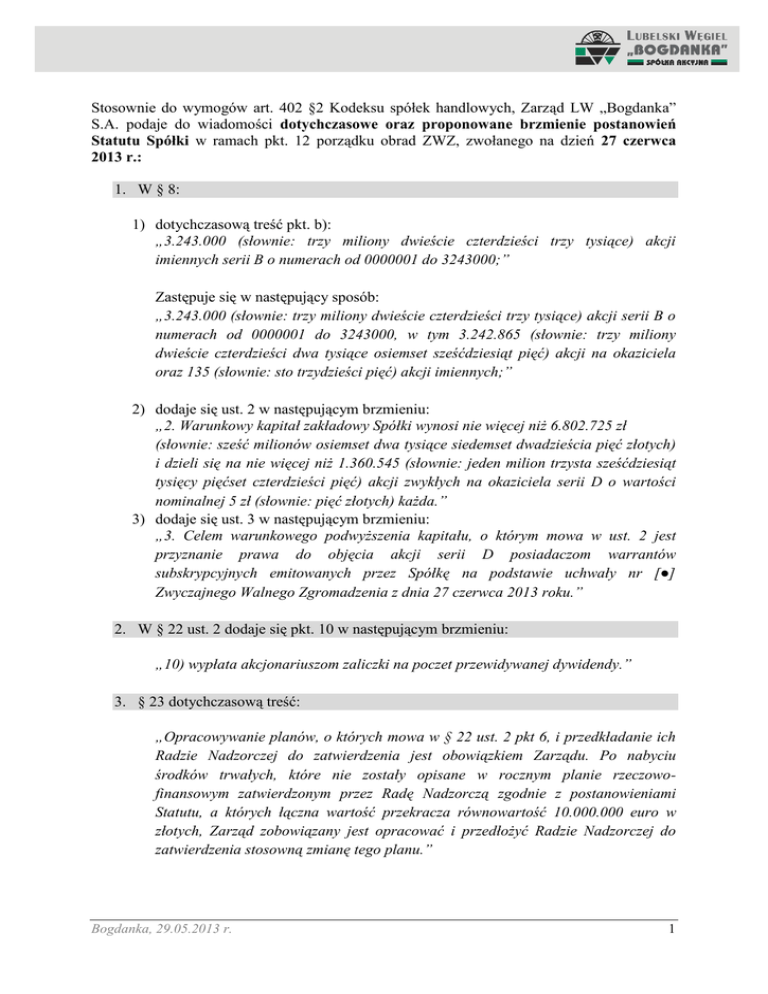 Stosownie do wymogów art. 402 §2 Kodeksu spółek handlowych, Zarząd LW „Bogdanka” S.A. podaje do wiadomości dotychczasowe oraz proponowane brzmienie postanowień Statutu Spółki w ramach pkt. 12 porządku obrad ZWZ, zwołanego na dzień 27 czerwca 2013 r.: 1. W § 8: 1) dotychczasową treść pkt. b): „3.243.000 (słownie: trzy miliony dwieście czterdzieści trzy tysiące) akcji imiennych serii B o numerach od 0000001 do 3243000;” Zastępuje się w następujący sposób: „3.243.000 (słownie: trzy miliony dwieście czterdzieści trzy tysiące) akcji serii B o numerach od 0000001 do 3243000, w tym 3.242.865 (słownie: trzy miliony dwieście czterdzieści dwa tysiące osiemset sześćdziesiąt pięć) akcji na okaziciela oraz 135 (słownie: sto trzydzieści pięć) akcji imiennych;” 2) dodaje się ust. 2 w następującym brzmieniu: „2. Warunkowy kapitał zakładowy Spółki wynosi nie więcej niż 6.802.725 zł (słownie: sześć milionów osiemset dwa tysiące siedemset dwadzieścia pięć złotych) i dzieli się na nie więcej niż 1.360.545 (słownie: jeden milion trzysta sześćdziesiąt tysięcy pięćset czterdzieści pięć) akcji zwykłych na okaziciela serii D o wartości nominalnej 5 zł (słownie: pięć złotych) każda.” 3) dodaje się ust. 3 w następującym brzmieniu: „3. Celem warunkowego podwyższenia kapitału, o którym mowa w ust. 2 jest przyznanie prawa do objęcia akcji serii D posiadaczom warrantów subskrypcyjnych emitowanych przez Spółkę na podstawie uchwały nr [●] Zwyczajnego Walnego Zgromadzenia z dnia 27 czerwca 2013 roku.” 2. W § 22 ust. 2 dodaje się pkt. 10 w następującym brzmieniu: „10) wypłata akcjonariuszom zaliczki na poczet przewidywanej dywidendy.” 3. § 23 dotychczasową treść: „Opracowywanie planów, o których mowa w § 22 ust. 2 pkt 6, i przedkładanie ich Radzie Nadzorczej do zatwierdzenia jest obowiązkiem Zarządu. Po nabyciu środków trwałych, które nie zostały opisane w rocznym planie rzeczowofinansowym zatwierdzonym przez Radę Nadzorczą zgodnie z postanowieniami Statutu, a których łączna wartość przekracza równowartość 10.000.000 euro w złotych, Zarząd zobowiązany jest opracować i przedłożyć Radzie Nadzorczej do zatwierdzenia stosowną zmianę tego planu.” Bogdanka, 29.05.2013 r. 1 Zastępuje się w następujący sposób: „Opracowywanie planów, o których mowa w § 22 ust. 2 pkt 6, i przedkładanie ich Radzie Nadzorczej do zatwierdzenia jest obowiązkiem Zarządu. Po nabyciu środków trwałych, które nie zostały przewidziane w rocznym planie rzeczowofinansowym zatwierdzonym przez Radę Nadzorczą zgodnie z postanowieniami Statutu, a których łączna wartość przekracza równowartość 10.000.000 euro w złotych, Zarząd zobowiązany jest opracować i przedłożyć Radzie Nadzorczej do zatwierdzenia stosowną zmianę tego planu.” 4. W § 25: 1) ust. 1 w miejsce dotychczasowej treści: „1. Z zastrzeżeniem postanowień niniejszego Statutu Członków Zarządu lub cały Zarząd powołuje i odwołuje Rada Nadzorcza.” otrzymuje następujące brzmienie: „1. Członków Zarządu powołuje i odwołuje Rada Nadzorcza.” 2) skreśla się ust. 3: „3. Każdy z członków Zarządu może być w odwołany lub zawieszony w czynnościach przez Radę Nadzorczą.” 5. W § 32: 1) ust. 1 pkt. 1 w miejsce dotychczasowej treści: „1) ocena sprawozdania Zarządu z działalności Spółki oraz sprawozdania finansowego za ubiegły rok obrotowy w zakresie ich zgodności z księgami, dokumentami, jak i ze stanem faktycznym. Dotyczy to także skonsolidowanego sprawozdania finansowego grupy kapitałowej, o ile jest ono sporządzane,” otrzymuje brzmienie: „1) ocena sprawozdania Zarządu z działalności Spółki oraz sprawozdania finansowego za ubiegły rok obrotowy w zakresie ich zgodności z księgami, dokumentami, jak i ze stanem faktycznym oraz ocena skonsolidowanego sprawozdania finansowego grupy kapitałowej, o ile jest ono sporządzane,” 2) ust. 2 pkt. 2a w miejsce dotychczasowej treści: „2a) nabycie, zbycie lub wytworzenie środków trwałych, środków trwałych w budowie lub wartości niematerialnych i prawnych, które nie zostało opisane w rocznym planie rzeczowo-finansowym zatwierdzonym przez Radę Nadzorczą zgodnie z postanowieniami Statutu, jeżeli wartość pojedynczej lub większej liczby powiązanych transakcji przekracza równowartość 1.000.000 euro w złotych," Bogdanka, 29.05.2013 r. 2 otrzymuje następujące brzmienie: „2a) nabycie, zbycie lub wytworzenie środków trwałych, środków trwałych w budowie lub wartości niematerialnych i prawnych, które nie zostało przewidziane w rocznym planie rzeczowo-finansowym zatwierdzonym przez Radę Nadzorczą zgodnie z postanowieniami Statutu, jeżeli wartość pojedynczej lub większej liczby powiązanych transakcji przekracza równowartość 5.000.000 euro w złotych," 3) ust. 2 pkt. 2b w miejsce dotychczasowej treści: „2b) ustanowienie zabezpieczenia z tytułu jakiegokolwiek zobowiązania Spółki lub osoby trzeciej, które nie zostało opisane w rocznym planie rzeczowo finansowym zatwierdzonym przez Radę Nadzorczą zgodnie z postanowieniami Statutu, jeżeli wartość pojedynczej lub większej liczby powiązanych transakcji przekracza równowartość 250.000 euro w złotych,” otrzymuje następujące brzmienie: „2b) ustanowienie zabezpieczenia z tytułu jakiegokolwiek zobowiązania Spółki lub osoby trzeciej, jeżeli wartość pojedynczej lub większej liczby powiązanych transakcji przekracza równowartość 1.000.000 euro w złotych,” 4) ust. 2 pkt. 2c w miejsce dotychczasowej treści: „2c) zawarcie umowy lub dokonanie przez Spółkę jakiejkolwiek innej czynności prawnej, innej niż wskazane w ustępach 2a) lub 2b), która nie została opisana w rocznym planie rzeczowo finansowym zatwierdzonym przez Radę Nadzorczą zgodnie z postanowieniami Statutu, gdzie łączna wartość świadczeń lub