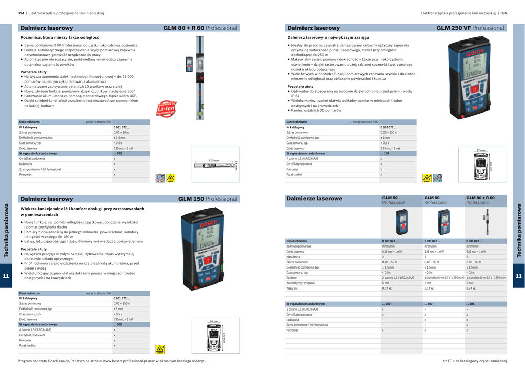 394 | Elektronarzędzia profesjonalne linii niebieskiej Elektronarzędzia profesjonalne linii niebieskiej | 395 GLM 80 + R 60 Professional Dalmierz laserowy o największym zasięgu ▶▶ Szyna pomiarowa R 60 Professional do użytku jako cyfrowa poziomica ▶▶ Funkcja automatycznego rozpoznawania szyny pomiarowej zapewnia natychmiastową gotowość urządzenia do pracy ▶▶ Automatycznie obracający się, podświetlany wyświetlacz zapewnia optymalną czytelność wyników ▶▶ Idealny do pracy na zewnątrz: zintegrowany celownik optyczny zapewnia optymalną widoczność punktu laserowego, nawet przy odległości dochodzącej do 250 m ▶▶ Maksymalny zasięg pomiaru i dokładność – także przy niekorzystnym oświetleniu – dzięki zastosowaniu dużej, szklanej soczewki i wytrzymałego nośnika układu optycznego ▶▶ Wiele łatwych w obsłudze funkcji pomiarowych zapewnia szybkie i dokładne mierzenie odległości oraz obliczanie powierzchni i kubatur Dane techniczne Pozostałe atuty ▶▶ Optymalny do stosowania na budowie dzięki ochronie przed pyłem i wodą IP 54 ▶▶ Wielofunkcyjny trzpień ułatwia dokładny pomiar w miejscach trudno dostępnych i na krawędziach ▶▶ Pamięć ostatnich 30 pomiarów Dane techniczne ... więcej na stronie 395 ... więcej na stronie 396 Nr katalogowy 0 601 072 ... Nr katalogowy 0 601 072 ... Zakres pomiarowy 0,05 – 80 m Zakres pomiarowy 0,05 – 250 m Dokładność pomiarowa, typ. ± 1,5 mm Dokładność pomiarowa, typ. ± 1 mm Czas pomiaru, typ. < 0,5 s Czas pomiaru, typ. < 0,5 s Dioda laserowa 635 nm, < 1 mW Dioda laserowa 635 nm, < 1 mW W wyposażeniu standardowym ... 301 W wyposażeniu standardowym ... 100 Certyfikat producenta x 4 baterie 1,5 V LR03 (AAA) x Ładowarka x Certyfikat producenta x Szyna pomiarowa R 60 Professional x Pokrowiec x Pokrowiec x Pasek na dłoń x Dalmierz laserowy Technika pomiarowa GLM 250 VF Professional Poziomica, która mierzy także odległość Pozostałe atuty ▶▶ Najwyższa autonomia dzięki technologii litowo-jonowej – do 25.000 pomiarów na jednym cyklu ładowania akumulatora ▶▶ Automatyczne zapisywanie ostatnich 10 wyników oraz stałej ▶▶ Nowe, złożone funkcje pomiarowe dzięki czujnikowi nachylenia 360° ▶▶ Ładowanie akumulatora za pomocą standardowego złącza Micro-USB ▶▶ Dzięki solidnej konstrukcji urządzenie jest niezawodnym pomocnikiem na każdej budowie 11 Dalmierz laserowy GLM 150 Professional Dalmierze laserowe GLM 50 Professional GLM 80 Professional GLM 80 + R 60 Professional Większa funkcjonalność i komfort obsługi przy zastosowaniach w pomieszczeniach ▶▶ Nowe funkcje, np. pomiar odległości cząstkowej, obliczanie wysokości i pomiar pochylenia dachu ▶▶ Pomiary z dokładnością do jednego milimetra: powierzchnie, kubatury i długości w zasięgu do 150 m ▶▶ Łatwa, intuicyjna obsługa i duży, 4-liniowy wyświetlacz z podświetleniem Pozostałe atuty ▶▶ Najwyższa precyzja w całym okresie użytkowania dzięki wytrzymałej podstawie układu optycznego ▶▶ IP 54: ochrona całego urządzenia wraz z przegrodą akumulatora, przed pyłem i wodą ▶▶ Wielofunkcyjny trzpień ułatwia dokładny pomiar w miejscach trudno dostępnych i na krawędziach Dane techniczne Dane techniczne 0 601 072 ... 0 601 072 ... 0 601 072 ... Jednostki pomiarowe m/cm/mm m/cm/mm m/cm/mm Dioda laserowa 635 nm, < 1 mW 635 nm, < 1 mW 635 nm, < 1 mW Klasa lasera 2 2 2 Zakres pomiarowy 0,05 – 50 m 0,05 – 80 m 0,05 – 80 m Dokładność pomiarowa, typ. ± 1,5 mm ± 1,5 mm ± 1,5 mm Czas pomiaru, typ. < 0,5 s < 0,5 s < 0,5 s Zasilanie 2 baterie 1,5 V LR03 (AAA) 1 akumulator Li-Ion 3,7 V (1.250 mAh) 1 akumulator Li-Ion 3,7 V (1.250 mAh) Automatyczny wyłącznik 5 min 5 min 5 min Waga, ok. 0,14 kg 0,14 kg 0,74 kg ... więcej na stronie 396 Nr katalogowy 0 601 072 ... Zakres pomiarowy 0,05 – 150 m W wyposażeniu standardowym ... 200 ... 300 ... 301 Dokładność pomiarowa, typ. ± 1 mm 2 baterie 1,5 V LR03 (AAA) x – – Czas pomiaru, typ. < 0,5 s Certyfikat producenta x x x Dioda laserowa 635 nm, < 1 mW Ładowarka – x x W wyposażeniu standardowym ... 000 Szyna pomiarowa R 60 Professional – – x 4 baterie 1,5 V LR03 (AAA) x Pokrowiec x x x Certyfikat producenta x Pokrowiec x Pasek na dłoń x Program osprzętu Bosch znajdą Państwo na stronie www.bosch-professional.pl oraz w aktualnym katalogu osprzętu Nr ET = nr katalogowy części zamiennej Technika pomiarowa Dalmierz laserowy 11