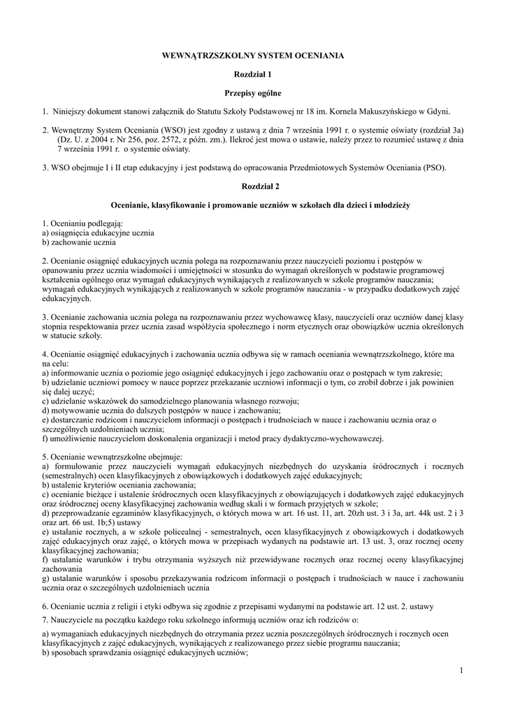 WEWNĄTRZSZKOLNY SYSTEM OCENIANIA Rozdział 1 Przepisy ogólne 1. Niniejszy dokument stanowi załącznik do Statutu Szkoły Podstawowej nr 18 im. Kornela Makuszyńskiego w Gdyni. 2. Wewnętrzny System Oceniania (WSO) jest zgodny z ustawą z dnia 7 września 1991 r. o systemie oświaty (rozdział 3a) (Dz. U. z 2004 r. Nr 256, poz. 2572, z późn. zm.). Ilekroć jest mowa o ustawie, należy przez to rozumieć ustawę z dnia 7 września 1991 r. o systemie oświaty. 3. WSO obejmuje I i II etap edukacyjny i jest podstawą do opracowania Przedmiotowych Systemów Oceniania (PSO). Rozdział 2 Ocenianie, klasyfikowanie i promowanie uczniów w szkołach dla dzieci i młodzieży 1. Ocenianiu podlegają: a) osiągnięcia edukacyjne ucznia b) zachowanie ucznia 2. Ocenianie osiągnięć edukacyjnych ucznia polega na rozpoznawaniu przez nauczycieli poziomu i postępów w opanowaniu przez ucznia wiadomości i umiejętności w stosunku do wymagań określonych w podstawie programowej kształcenia ogólnego oraz wymagań edukacyjnych wynikających z realizowanych w szkole programów nauczania; wymagań edukacyjnych wynikających z realizowanych w szkole programów nauczania - w przypadku dodatkowych zajęć edukacyjnych. 3. Ocenianie zachowania ucznia polega na rozpoznawaniu przez wychowawcę klasy, nauczycieli oraz uczniów danej klasy stopnia respektowania przez ucznia zasad współżycia społecznego i norm etycznych oraz obowiązków ucznia określonych w statucie szkoły. 4. Ocenianie osiągnięć edukacyjnych i zachowania ucznia odbywa się w ramach oceniania wewnątrzszkolnego, które ma na celu: a) informowanie ucznia o poziomie jego osiągnięć edukacyjnych i jego zachowaniu oraz o postępach w tym zakresie; b) udzielanie uczniowi pomocy w nauce poprzez przekazanie uczniowi informacji o tym, co zrobił dobrze i jak powinien się dalej uczyć; c) udzielanie wskazówek do samodzielnego planowania własnego rozwoju; d) motywowanie ucznia do dalszych postępów w nauce i zachowaniu; e) dostarczanie rodzicom i nauczycielom informacji o postępach i trudnościach w nauce i zachowaniu ucznia oraz o szczególnych uzdolnieniach ucznia; f) umożliwienie nauczycielom doskonalenia organizacji i metod pracy dydaktyczno-wychowawczej. 5. Ocenianie wewnątrzszkolne obejmuje: a) formułowanie przez nauczycieli wymagań edukacyjnych niezbędnych do uzyskania śródrocznych i rocznych (semestralnych) ocen klasyfikacyjnych z obowiązkowych i dodatkowych zajęć edukacyjnych; b) ustalenie kryteriów oceniania zachowania; c) ocenianie bieżące i ustalenie śródrocznych ocen klasyfikacyjnych z obowiązujących i dodatkowych zajęć edukacyjnych oraz śródrocznej oceny klasyfikacyjnej zachowania według skali i w formach przyjętych w szkole; d) przeprowadzanie egzaminów klasyfikacyjnych, o których mowa w art. 16 ust. 11, art. 20zh ust. 3 i 3a, art. 44k ust. 2 i 3 oraz art. 66 ust. 1b;5) ustawy e) ustalanie rocznych, a w szkole policealnej - semestralnych, ocen klasyfikacyjnych z obowiązkowych i dodatkowych zajęć edukacyjnych oraz zajęć, o których mowa w przepisach wydanych na podstawie art. 13 ust. 3, oraz rocznej oceny klasyfikacyjnej zachowania; f) ustalanie warunków i trybu otrzymania wyższych niż przewidywane rocznych oraz rocznej oceny klasyfikacyjnej zachowania g) ustalanie warunków i sposobu przekazywania rodzicom informacji o postępach i trudnościach w nauce i zachowaniu ucznia oraz o szczególnych uzdolnieniach ucznia 6. Ocenianie ucznia z religii i etyki odbywa się zgodnie z przepisami wydanymi na podstawie art. 12 ust. 2. ustawy 7. Nauczyciele na początku każdego roku szkolnego informują uczniów oraz ich rodziców o: a) wymaganiach edukacyjnych niezbędnych do otrzymania przez ucznia poszczególnych śródrocznych i rocznych ocen klasyfikacyjnych z zajęć edukacyjnych, wynikających z realizowanego przez siebie programu nauczania; b) sposobach sprawdzania osiągnięć edukacyjnych uczniów; )1 c) warunkach i trybie otrzymania wyższej niż przewidywana rocznej oceny klasyfikacyjnej z zajęć edukacyjnych. 8. Wychowawca oddziału na początku każdego roku szkolnego informuje uczniów oraz ich rodziców o: 1) warunkach i sposobie oraz kryteriach oceniania zachowania; 2) warunkach i trybie otrzymania wyższej niż przewidywana rocznej oceny klasyfikacyjnej zachowania I. Szczegółowe warunki i sposób oceniania wewnątrzszkolnego w Szkole Podstawowej nr 18 I a. Ocenianie uczniów w pierwszym etapie edukacyjnym – edukacja wczesnoszkolna. I. Postanowienia ogólne. 1. Mówiąc o ocenianiu w klasach I-III mamy na myśli proces gromadzenia informacji o uczniach. Stała obserwacja uczniów przez nauczyciela i rozpoznawanie poziomu opanowania przez nich wiadomości i umiejętności, a także ich postaw społeczno-moralnych w stosunku do wymagań edukacyjnych i gromadzenie informacji stanowi integralną część procesu nauczania, uczenia się i wychowania. 2. Mówiąc edukacja wczesnoszkolna mamy na myśli również kształcenie zintegrowane (nazwa edukacja wczesnoszkolna, zgodnie z podstawą programową, dotyczy klas rozpoczynających naukę w szkole od 1 września 2009 roku). II. 1. 2. 3. 4. 5. Ogólne cele edukacyjne. Wspomaganie dziecka w rozwoju intelektualnym, emocjonalnym, społecznym, etycznym, fizycznym i estetycznym. Przygotowanie do życia w zgodzie z samym sobą, ludźmi i przyrodą. Dbałość o to, aby dziecko rozróżniało dobro od zła, było świadome przynależności społecznej (do rodziny, grupy rówieśniczej i wspólnoty narodowej) oraz rozumiało konieczność dbania o przyrodę. Kształtowanie systemu wiadomości i umiejętności potrzebnych dziecku do poznawania i rozumienia świata, radzenia sobie w codziennych sytuacjach oraz do kontynuowania nauki w klasach IV-VI szkoły podstawowej. W procesie oceniania uwzględniane są następujące obszary: a) Indywidualne predyspozycje i możliwości dziecka w opanowaniu materiału edukacyjnego. b) Stopień zaangażowania uc