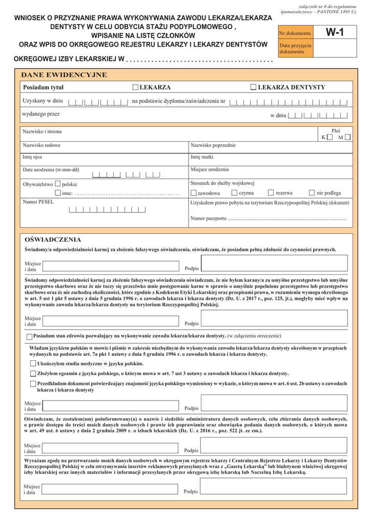 WNIOSEK O PRZYZNANIE PRAWA WYKONYWANIA ZAWODU LEKARZA/LEKARZA DENTYSTY W CELU ODBYCIA STAŻU PODYPLOMOWEGO , WPISANIE NA LISTĘ CZŁONKÓW ORAZ WPIS DO OKRĘGOWEGO REJESTRU LEKARZY I LEKARZY DENTYSTÓW OKRĘGOWEJ IZBY LEKARSKIEJ W . . . . . . . . . . . . . . . . . . . . . . . . . . . . . . . . . . . . . . . . . załącznik nr 8 do regulaminu (pomarańczowy – Pantone 1495 U) W-1 Nr dokumentu Data przyjęcia dokumentu DANE EWIDENCYJNE Posiadam tytuł Uzyskany w dniu LEKARZA LEKARZA DENTYSTY na podstawie dyplomu/zaświadczenia nr wydanego przez w dniu Nazwisko i imiona K Nazwisko rodowe Nazwisko poprzednie Imię ojca Imię matki Data urodzenia (rr-mm-dd) Miejsce urodzenia Obywatelstwo polskie inne: . . . . . . . . . . . . . . . . . . . . . . . . . . . . . . . . . . . . . . . . . Numer PESEL Płeć M Stosunek do służby wojskowej zawodowa czynna rezerwa nie podlega Uzyskałem prawo pobytu na terytorium Rzeczypospolitej Polskiej (dokument) Numer paszportu ............................................................................................ OŚWIADCZENIA Świadomy/a odpowiedzialności karnej za złożenie fałszywego oświadczenia, oświadczam, że posiadam pełną zdolność do czynności prawnych. Miejsce i data Podpis Świadomy odpowiedzialności karnej za złożenie fałszywego oświadczenia oświadczam, że nie byłem karany/a za umyślne przestępstwo lub umyślne przestępstwo skarbowe oraz że nie toczy się przeciwko mnie postępowanie karne w sprawie o umyślnie popełnione przestępstwo lub przestępstwo skarbowe oraz że nie zachodzą okoliczności, które zgodnie z Kodeksem Etyki Lekarskiej oraz przepisami prawa, w rozumieniu wymogu określonego w art. 5 ust 1 pkt 5 ustawy z dnia 5 grudnia 1996 r. o zawodach lekarza i lekarza dentysty (Dz. U. z 2017 r., poz. 125, jt.), mogłyby mieć wpływ na wykonywanie zawodu lekarza/lekarza dentysty na terytorium Rzeczypospolitej Polskiej. Miejsce i data Podpis Posiadam stan zdrowia pozwalający na wykonywanie zawodu lekarza/lekarza dentysty. (w załączeniu orzeczenie) Władam językiem polskim w mowie i piśmie w zakresie niezbędnym do wykonywania zawodu lekarza/lekarza dentysty określonym w przepisach wydanych na podstawie art. 7a pkt 1 ustawy z dnia 5 grudnia 1996 r. o zawodach lekarza i lekarza dentysty. Ukończyłem studia medyczne w języku polskim. Złożyłem egzamin z języka polskiego, o którym mowa w art. 7 ust 3 ustawy o zawodach lekarza i lekarza dentysty. Przedkładam dokument potwierdzający znajomość języka polskiego wymieniony w wykazie, o którym mowa w art. 6 ust. 2b ustawy o zawodach lekarza i lekarza dentysty Miejsce i data Podpis Oświadczam, że zostałem(am) poinformowany(a) o nazwie i siedzibie administratora danych osobowych, celu zbierania danych osobowych, o prawie dostępu do treści moich danych osobowych i prawie ich poprawiania oraz obowiązku podania danych osobowych, o których mowa w art. 49 ust. 6 ustawy z dnia 2 grudnia 2009 r. o izbach lekarskich (Dz. U. z 2016 r., poz. 522 jt. ze zm.). Miejsce i data Podpis Wyrażam zgodę na przetwarzanie moich danych osobowych w okręgowym rejestrze lekarzy i Centralnym Rejestrze Lekarzy i Lekarzy Dentystów Rzeczypospolitej Polskiej w celu otrzymywania insertów reklamowych przesyłanych wraz z „Gazetą Lekarską” lub biuletynem właściwej okręgowej izby lekarskiej oraz innych materiałów i informacji przesyłanych przez okręgową izbę lekarską lub Naczelną Izbę Lekarską. Miejsce i data Podpis MIEJSCE STAŁEGO ZAMELDOWANIA Województwo MIEJSCE ZAMIESZKANIA Powiat Gmina/Dzielnica Ulica i nr domu/nr lokalu Miejscowość Kod pocztowy Telefon E-mail Powiat Gmina/Dzielnica ADRES DO KORESPONDENCJI Województwo Ulica i nr domu/nr lokalu Miejscowość Miejsce Data Kod pocztowy E-mail Telefon Podpis Załączone dokumenty Miękka kopia dyplomu / kopia dyplomu / dokumentu potwierdzającego* Orzeczenie o stanie zdrowia Dokument uprawniający do pobytu na obszarze RP kwalifikacje formalne lekarza/lekarza dentysty Kserokopia dowodu osobistego lub paszportu Dokument potwierdzający znajomość języka polskiego Dokument potwierdzający zmianę nazwiska Inne, dotyczące lekarza cudzoziemca Inne . . . . . . . . . . . . . . . . . . . . . . . . . . . . . . . . . . . . . . . . . . . . . . . . . . . . . . . . . . . . . . . . . . . . . . . . . . . . . . . . . . . . . . . . . . . . . . . . . . . . . . . . . . . . . ................................................................................................................. Oświadczam, że przyjąłem/am do wiadomości, że z dniem uzyskania wpisu na listę członków i do okręgowego rejestru lekarzy i lekarzy dentystów obowiązany/a jestem do zawiadamiania okręgowej rady lekarskiej okręgowej izby lekarskiej, której jestem członkiem, w terminie 30 dni o zmianie danych wymienionych w art. 49 ust. 7 ustawy z dnia 2 grudnia 2009 o izbach lekarskich (Dz. U. z 2016 poz. 522 jt. ze zm.) oraz do przedstawiania dokumentów potwierdzających ich zmianę. Miejsce Data Podpis Oświadczam, że przyjęłam/ąłem do wiadomości obowiązek regularnego oplacania składki członkowskiej Miejsce Data POTWIERDZENIE Potwierdzam odbiór dokumentu „Prawo wykonywania zawodu lekarza” „Prawo wykonywania zawodu lekarza dentysty” Data Podpis z numerem rejestru oznaczonego numerem seryjnym Podpis WYPEŁNIA OKRĘGOWA IZBA LEKARSKA Komisja ds. rejestracji i prawa wykonywania zawodu stwierdza że: Uwagi/brakujące dokumenty/ograniczenia Podjął wykonywanie zawodu przed upływem 5 lat od uzyskania dyplomu Załączono wszystkie wymagane dokumenty Spełnia warunki przyznania prawa Nie spełnia warunków przyznania prawa (uzasadnienie w załączeniu) Wniosek Komisji: Przyznać prawo wykonywania zawodu w celu odbycia stażu podyplomowego, wpisać na listę członków i do okręgowego rejestru lekarzy i lekarzy dentystów Odmówić przyznania prawa wykonywania zawodu w celu odbycia stażu podyplomowego ..........................