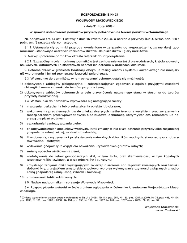 ROZPORZĄDZENIE Nr 27 WOJEWODY MAZOWIECKIEGO z dnia 31 lipca 2009 r. w sprawie ustanowienia pomników przyrody położonych na terenie powiatu wołomińskiego. Na podstawie art. 44 ust. 1 ustawy z dnia 16 kwietnia 2004r. o ochronie przyrody (Dz.U. Nr 92, poz. 880 z późn. zm.1)) zarządza się, co następuje: § 1.1. Ustanawia się pomniki przyrody wymienione w załączniku do rozporządzenia, zwane dalej „pomnikami”, stanowiące okazałych rozmiarów drzewa, skupiska drzew i głazy narzutowe. 2. Nazwy i położenie pomników określa załącznik do rozporządzenia. § 2.1. Szczególnym celem ochrony pomników jest zachowanie wartości przyrodniczych, krajobrazowych, naukowych, kulturowych i historycznych poprzez ich ochronę w granicach lokalizacji. 2. Ochrona drzew w granicach lokalizacji obejmuje zasięg korony i systemu korzeniowego nie mniejszy niż w promieniu 15m od zewnętrznej krawędzi pnia drzewa. § 3. W stosunku do pomników, w ramach czynnej ochrony, ustala się możliwość: 1) dokonywania zabiegów pielęgnacyjno – zabezpieczających zgodnych z ogólnie przyjętymi zasadami chirurgii drzew w stosunku do tworów przyrody żywej; 2) dokonywania zabiegów ochronnych w celu przywrócenia naturalnego stanu w stosunku do tworów przyrody nieożywionej. § 4. W stosunku do pomników wprowadza się następujące zakazy: 1) niszczenia, uszkadzania lub przekształcania obiektu lub obszaru; 2) wykonywania prac ziemnych trwale zniekształcających rzeźbę terenu, z wyjątkiem prac związanych z zabezpieczeniem przeciwpowodziowym albo budową, odbudową, utrzymywaniem, remontem lub naprawą urządzeń wodnych; 3) uszkadzania i zanieczyszczania gleby; 4) dokonywania zmian stosunków wodnych, jeżeli zmiany te nie służą ochronie przyrody albo racjonalnej gospodarce rolnej, leśnej, wodnej lub rybackiej; 5) likwidowania, zasypywania i przekształcania naturalnych zbiorników wodnych, starorzeczy oraz obszarów wodno - błotnych; 6) wylewania gnojowicy, z wyjątkiem nawożenia użytkowanych gruntów rolnych; 7) zmiany sposobu użytkowania ziemi; 8) wydobywania do celów gospodarczych skał, w tym torfu, oraz skamieniałości, w tym kopalnych szczątków roślin i zwierząt, a także minerałów i bursztynu; 9) umyślnego zabijania dziko występujących zwierząt, niszczenia nor, legowisk zwierzęcych oraz tarlisk i złożonej ikry, z wyjątkiem amatorskiego połowu ryb oraz wykonywania czynności związanych z racjonalną gospodarką rolną, leśną, rybacką i łowiecką; 10) umieszczania tablic reklamowych. § 5. Nadzór nad pomnikami sprawuje Wojewoda Mazowiecki. § 6. Rozporządzenie wchodzi w życie z dniem ogłoszenia w Dzienniku Urzędowym Województwa Mazowieckiego. 1) Zmiany wymienionej ustawy zostały ogłoszone w Dz.U. z 2005r. Nr 113, poz. 954, Nr 130, poz. 1087, z 2007r. Nr 75, poz. 493, Nr 176, poz. 1238, Nr 181, poz. 1286, z 2008r. Nr 154, poz. 958, Nr 199, poz. 1227, Nr 201, poz. 1237 oraz z 2009r. Nr 18, poz. 97. Wojewoda Mazowiecki: Jacek Kozłowski Załącznik do rozporządzenia nr 27 Wojewody Mazowieckiego z dnia 31 lipca 2009r. Lp. Położenie Powiat Gmina / dzielnica Miejscowość Bliższa lokalizacja Obiekt poddany ochronie Nazwa obiektu Nazwa gatunkowa polska Nazwa gatunkowa łacińska Obwód (cm) Wys. (m) Rodzaj skały/ minerału 11 1 2 3 4 5 6 7 8 9 10 1 wołomiński Jadów Jadów Plac Dreszera 10, teren zieleni przykościelnej, dz.ewid. Nr 648 drzewo lipa drobnolistna Tilia cordata 530 20 2 wołomiński Klembów Ostrówek w parku leśnym koło Zakładu Wychowaw. "Charitas" drzewo świerk pospolity Picea abies 243 26 3 wołomiński Klembów Ostrówek w parku leśnym koło Zakładu Wychowaw. "Charitas" drzewo świerk pospolity Picea abies 287 28 4 wołomiński Klembów Ostrówek Warszawski Zespół Leśny, Leśnictwo Ostrówek drzewo dąb szypułkowy Quercus robur 354 30 5 wołomiński Klembów Ostrówek w parku leśnym koło Zakładu Wychowaw. "Charitas" drzewo świerk pospolity Picea abies 258 26 6 wołomiński Klembów Ostrówek w parku leśnym koło Zakładu Wychowaw. "Charitas" drzewo świerk pospolity Picea abies 268 28 7 wołomiński Klembów Ostrówek w parku leśnym koło Zakładu Wychowaw. "Charitas" drzewo dąb szypułkowy Quercus robur 240 20 8 wołomiński Klembów Ostrówek w parku leśnym koło Zakładu Wychowaw. "Charitas" drzewo dąb szypułkowy Quercus robur 260 22 9 wołomiński Klembów Ostrówek w parku leśnym koło Zakładu Wychowaw. "Charitas" drzewo świerk pospolity Picea abies 214 25 10 wołomiński Kobyłka Kobyłka Żymirkiego 44 róg Orszagka drzewo dąb szypułkowy Quercus robur 250 23 11 wołomiński Kobyłka Kobyłka Grecka 5 drzewo dab szypułkowy Quercus robur 340 22 12 wołomiński Kobyłka Kobyłka p. Jadwiga Wist/w odległości ok. 20 m od drogi NadmaCzarnej; ok4 km od szosy WarszawaRadzymin, dojazd przez wieś Nadma drzewo dąb szypułkowy Quercus robur 360 20 13 wołomiński Kobyłka Kobyłka Chałubińskiego (przy skrzyżowaniu z ul. Zagańczyka) drzewo lipa drobnolistna Tilia cordata 410 22 14 wołomiński Kobyłka Kobyłka p. Krystyna i Mieczysław Kostrzewa/w odległości ok. 390 m w linii prostej od drogi Nadma-Wołomin; ok. 3,5 km od szosy RadzyminWarszawa-dojazd przez wieś Nadma drzewo dąb szypułkowy Quercus robur 230 18 15 wołomiński Kobyłka Kobyłka p. Konstancja i Jan Banaszak/ok. 150 m i 280 m w linii prostej od drogi NadmaWołomin; ok. 3,5 km od szosy WarszawaRadzymin, dojazd przez wieś Nadma grupa drzew dąb szypułkowy (3 szt.) Quercus robur 270, 245, 240 20, 23, 22 16 wołomiński Kobyłka Kobyłka Wygonowa 2 grupa drzew lipa drobnolistna; grab pospolity (4 szt.); jesion wyniosły; modrzew syberyjski Tilia cordata; Carpinus betulus; Fraxinus excelsior; Larix sibirica 440; 180, 230, 205, 235; 290; 250 20; 1618; 20; 20 17 wołomiński Kobyłka Kobyłka p. Aniela i Zygmunt Dąbek/w odległości 310 m i 350 m w prostej linii od drogi Nadma-Wołomin; ok. 3,5 km od szosy RadzyminWarszawa-dojazd prz