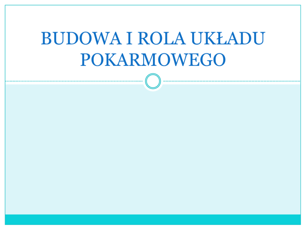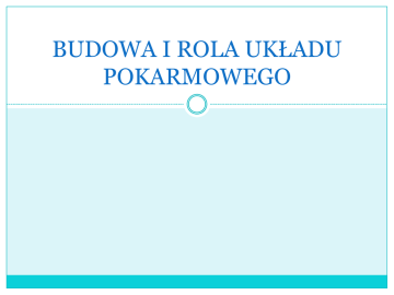 BUDOWA I ROLA UKŁADU POKARMOWEGO CELE LEKCJI: zapoznanie z budową i funkcjonowaniem odcinków przewodu pokarmowego omówienie budowy i funkcji zębów omówienie roli gruczołów współpracujących z przewodem pokarmowym BUDOWA UKŁADU POKARMOWEGO KĄTNICA Jama ustna Warga górna Języczek Dziąsło Policzek Podniebienie twarde Podniebienie miękkie Migdałek podniebienny Zęby Cieśń gardzieli Język Dno jamy ustnej Wędzidełko języka Warga dolna Jama ustna PRZYJMOWANIE POKARMU, ŻUCIE I ROZDRABNIANIE POKARMU TRAWIENIE WĘGLOWODANÓW UZĘBIENIE UZĘBIENIE MLECZNE UZĘBIENIE STAŁE siekacze – odgryzanie kęsów pokarmu kły – rozgryzanie pokarmu przedtrzonowe i trzonowe – rozcieranie pokarmu BUDOWA ZĘBA JĘZYK SMAK PRZESUWANIE POKARMU MOWA Brodawki 2000 – 5000 KOMÓREK SMAKOWYCH na języku i podniebieniu Ślinianki GARDŁO i PRZEŁYK Zbudowane z błony: Zbudowany z błony : śluzowej śluzowej pokrytej nabłonkiem mięśniowej poprzecznie wielowarstwowym płaskim mięśniowej poprzecznie prążkowanej (górny odcinek) i gładkiej (dolny odcinek przełyku) Funkcja: przesuwanie treści pokarmowych prążkowanej Funkcja: połykanie pokarmu ŻOŁĄDEK Budowa histologiczna Anatomia żołądka WPUST DNO TRZON ODŹWIERNIK Upłynnianie treści pokarmowych, trawienie białek ODCINKI JELITA CIENKIEGO DWUNASTNICA JELITO KREZKOWE JELITO CZCZE JELITO KRĘTE J E L I T O C I E N K I E BUDOWA KOSMKÓW JELITOWYCH Trawienie białek, węglowodanów i tłuszczów, wchłanianie wody, soli mineralnych, witamin i produktów trawienia BUDOWA KOSMKÓW JELITOWYCH JELITO GRUBE WCHŁANIANIE WODY, soli mineralnych i niektórych witamin FORMOWANIE MAS KAŁOWYCH, Wyrostek robaczkowy WYDALANIE NIESTRAWIONYCH RESZTEK POKARMU WĄTROBA i PĘCHERZYK ŻÓŁCIOWY 4 PŁATY → SEGMENTY → → ZRAZIKI → KOMÓRKI WĄTROBY – HEPATOCYTY WĄTROBA i PĘCHERZYK ŻÓŁCIOWY NEUTRALIZACJA SZKODLIWYCH SUBSTANCJI MAGAZYNOWANIE GLUKOZY W POSTACI GLIKOGENU MAGAZYNOWANIE WITAMINY A, D i B12 TRAWIENIE TŁUSZCZÓW TRZUSTKA dwunastnica ZRAZIKI – wydzielanie soku trzustkowego do dwunastnicy – trawienie białek, tłuszczów i węglowodanów (funkcja zewnątrzwydzielnicza) WYSPY TRZUSTKOWE Langerhansa – wydzielanie insuliny oraz hormonów wpływających na wydzielanie soku trzustkowego oraz rozkładanie glikogenu w wątrobie (funkcja wewnątrzwydzielnicza)