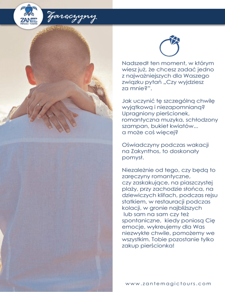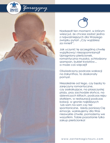 Zareczyny , Nadszedł ten moment, w którym wiesz już, że chcesz zadać jedno z najważniejszych dla Waszego związku pytań „Czy wyjdziesz za mnie?”. Jak uczynić tę szczególną chwilę wyjątkową i niezapomnianą? Upragniony pierścionek, romantyczna muzyka, schłodzony szampan, bukiet kwiatów... a może coś więcej? Oświadczyny podczas wakacji na Zakynthos, to doskonały pomysł. Niezależnie od tego, czy będą to zaręczyny romantyczne, czy zaskakujące, na piaszczystej plaży, przy zachodzie słońca, na dziewiczych klifach, podczas rejsu statkiem, w restauracji podczas kolacji, w gronie najbliższych lub sam na sam czy też spontaniczne, kiedy poniosą Cię emocje, wykreujemy dla Was niezwykłe chwile, pomożemy we wszystkim. Tobie pozostanie tylko zakup pierścionka! www.zantemagictours.com Zareczyny , Zaręczyny podczas wycieczki Doskonałym pomysłem są zaręczyny podczas jednej z wycieczek Zante Magic Tours. Zapoznawszy się z naszymi programami zwiedzania, możesz sam zastanowić się, w którym miejscu poprosić ukochaną osobę o rękę. W trakcie wycieczki przewodnik dodatkowo poradzi Ci, w jaki sposób wybrać najwłaściwszy moment i które z miejsc danego dnia może okazać się najlepsze. O planie zaręczyn podczas wycieczki poinformuj nas najlepiej na minimum 48 godzin przed planowanym dniem wycieczki. Wówczas będziemy mieli czas na ustalenie szczegółów. KOSZT zaręczyn podczas wycieczki: 0€ DODATKOWE PROPOZYCJE • wino musujące 10€ • kwiaty od 30€ • tort od 20€ • Pamiątkowe zdjęcie wykonane przez przewodnika 0€ www.zantemagictours.com Zareczyny , Zaręczyny podczas romantycznej kolacji Pierścionek zaręczynowy możesz wręczyć ukochanej osobie podczas romantycznej kolacji w restauracji Akrotiri North. W tle przygrywać będzie mogła Wam prawdziwa grecka muzyka wzbogacona szumem morskich fal. O chęci zaręczyn podczas kolacji poinformuj nas przynajmniej kilka dni wcześniej. Wówczas będziemy mieli czas na ustalenie szczegółów. KOSZT zaręczyn podczas kolacji: 120€ PRZYKŁADOWE MENU • stifado – gulasz wołowy w sosie pomidorowym z szalotkami Cena obejmuje: (2 uczestników) • dorada – ryba grillowana • xirino krasáto – wieprzowina pieczona • transfer z/do hotelu w sosie winnym • posiłek (danie główne z przystawką) • roladka z kurczaka • lokalne wino • briam – pieczone warzywa • dekoracja stolika • gemista – pomidory i papryki zapiekane z ryżem i warzywami DODATKOWE PROPOZYCJE • muzyka na żywo od 100€ za godzinę • kwiaty od 30€ • tort od 20€ • Pamiątkowe zdjęcie wykonane przez pracownika 0€ • moussaka – zapiekanka z mięsem mielonym, bakłażanami, serem i sosem beszamelowym • soufle lub kanellonia – zapiekanka makaronowa • sałatka wiejska z serem feta • soki, piwo, lokalne wino www.zantemagictours.com Zareczyny , Zaręczyny podczas prywatnego rejsu z piknikiem lub kolacją Bezludna plaża, wysokie wapienne klify, lazur wody, pierścionek i wy… Taki scenariusz jest możliwy podczas naszego prywatnego, trzygodzinnego rejsu zaręczynowego łodzią motorową. Naszą morską podróż wzbogaci piknik lub romantyczna kolacją w restauracji Akrotiri. PROGRAM REJSU 1. Plaża Marathia + piknik Prywatną łodzią motorową w towarzystwie kapitana wypłyniemy z małego portu w Keri. Dopłyniemy do plaży Marathia. Ta urocza, naturalnie utworzona, mała plaża to świetne miejsce na chwilę odpoczynku i romantyczny piknik w pięknej scenerii. 2. Keri i Błękitne Groty Zachodniego Wybrzeża Cechami tej najbardziej na południe wysuniętej części wyspy są niezwykłej urody wapienne klify. Nabrzeże porośnięte jest lasem, a woda krystalicznie czysta i przejrzysta. Błękitne Groty zachodniego wybrzeża niezbyt często są odwiedzane przez turystów, co nadaje im są bardziej dziewiczego charakteru. www.zantemagictours.com Zareczyny , 3. Wyspa Marathonisi Wyspa Marathonisi, kształtem przypominająca żółwia, kryje wiele niespodzianek. Niektóre z nich, to urokliwa plaża pokryta śnieżnobiałymi kamyczkami i tajemnicze przejścia między jaskiniami. Wpłyniemy do środka wybranych formacji skalnych. Tutejsza, niemal karaibska plaża z miękkim piaskiem należy do Narodowego Parku Morskiego na Zakynthos i jest miejscem lęgowym żółwi Caretta Caretta. 4. Spotkanie z żółwiem Na wodach zatoki Laganas poszukamy żółwi Caretta Caretta. Ci nasi morscy towarzysze wynurzają się zwykle co kilkanaście minut, by zaczerpnąć powietrza, dając nam tym samym okazję do przyjrzenia się im z bliska. Nie zapomnijmy uwiecznić tego spotkania na zdjęciach! 5. Wyspa Cameo od strony morza Wysepka Cameo, zwana także wysepką Agios Sostis (Świętego Zbawcy) określana jest często mianem wyspy ślubów, wyspy prześcieradeł lub białej wyspy. W czasie rejsu będziemy mogli podziwiać Cameo od strony morza. Być może ukradkiem uda się nam nawet zobaczyć romantyczny ślub. KOSZT zaręczyn podczas rejsu z piknikiem: 350€ KOSZT zaręczyn podczas rejsu z kolacją: 420€ Cena obejmuje: (2 uczestników) Cena obejmuje: (2 uczestników) • transfer z/do hotelu • transfer z/do hotelu • trzygodzinny rejs prywatną motorówką • trzygodzinny rejs prywatną motorówką • opiekę przewodnika/kapitana • opiekę przewodnika/kapitana • przekąski podczas pikniku • posiłek (danie główne z przystawką) • pamiątkowe zdjęcie wykonane przez • pamiątkowe zdjęcie wykonane przez przewodnika przewodnika DODATKOWE PROPOZYCJE • kwiaty od 30€ • tort od 20€ • wino musujące 10€ www.zantemagictours.com