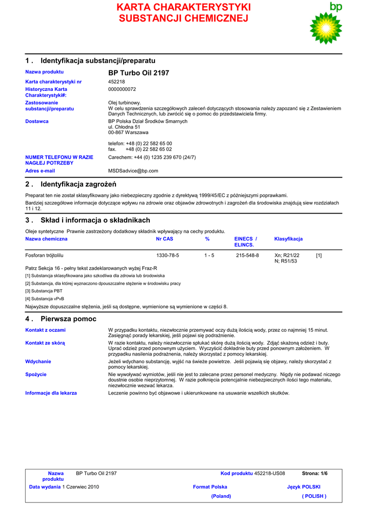 KARTA CHARAKTERYSTYKI SUBSTANCJI CHEMICZNEJ 1. Identyfikacja substancji/preparatu Nazwa produktu BP Turbo Oil 2197 Karta charakterystyki nr 452218 Historyczna Karta Charakterystyki#: 0000000072 Zastosowanie substancji/preparatu Olej turbinowy. W celu sprawdzenia szczegółowych zaleceń dotyczących stosowania należy zapozanć się z Zestawieniem Danych Technicznych, lub zwrócić się o pomoc do przedstawiciela firmy. Dostawca BP Polska Dział Środków Smarnych ul. Chłodna 51 00-867 Warszawa telefon: +48 (0) 22 582 65 00 fax. +48 (0) 22 582 65 02 NUMER TELEFONU W RAZIE NAGŁEJ POTRZEBY Carechem: +44 (0) 1235 239 670 (24/7) Adres e-mail [email protected] 2. Identyfikacja zagrożeń Preparat ten nie został sklasyfikowany jako niebezpieczny zgodnie z dyrektywą 1999/45/EC z późniejszymi poprawkami. Bardziej szczegółowe informacje dotyczące wpływu na zdrowie oraz objawów zdrowotnych i zagrożeń dla środowiska znajdują siew rozdziałach 11 i 12. 3. Skład i informacja o składnikach Oleje syntetyczne Prawnie zastrzeżony dodatkowy składnik wpływający na cechy produktu. Nazwa chemiczna Nr CAS % EINECS / ELINCS. Fosforan trójtolilu 1330-78-5 1-5 215-548-8 Klasyfikacja Xn; R21/22 N; R51/53 [1] Patrz Sekcja 16 - pełny tekst zadeklarowanych wyżej Fraz-R [1] Substancja sklasyfikowana jako szkodliwa dla zdrowia lub środowiska [2] Substancja, dla której wyznaczono dpouszczalne stężenie w środowisku pracy [3] Substancja PBT [4] Substancja vPvB Najwyższe dopuszczalne stężenia, jeśli są dostępne, wymienione są wymienione w części 8. 4. Pierwsza pomoc Kontakt z oczami W przypadku kontaktu, niezwłocznie przemywać oczy dużą ilością wody, przez co najmniej 15 minut. Zasięgnąć porady lekarskiej, jeśli pojawi się podrażnienie. W razie kontaktu, należy niezwłocznie spłukać skórę dużą ilością wody. Zdjąć skażoną odzież i buty. Uprać odzież przed ponownym użyciem. Wyczyścić dokładnie buty przed ponownym założeniem. W przypadku nasilenia podrażnenia, należy skorzystać z pomocy lekarskiej. Kontakt ze skórą Wdychanie Spożycie Jeżeli wdychano substancję, wyjść na świeże powietrze. Jeśli pojawią się objawy, należy skorzystać z pomocy lekarskiej. Nie wywoływać wymiotów, jeśli nie jest to zalecane przez personel medyczny. Nigdy nie podawać niczego doustnie osobie nieprzytomnej. W razie połknięcia potencjalnie niebezpiecznych ilości tego materiału, niezwłocznie wezwać lekarza. Informacje dla lekarza Leczenie powinno być objawowe i ukierunkowane na usuwanie wszelkich skutków. Nazwa produktu BP Turbo Oil 2197 Data wydania 1 Czerwiec 2010 Kod produktu 452218-US08 Format Polska (Poland) Strona: 1/6 Język POLSKI ( POLISH ) 5. Postępowanie w przypadku pożaru Środki gaśnicze Odpowiednie W przypadku pożaru stosować gaśnicę lub aerozol pianowy, proszkowy lub z dwutlenkiem węgla. Nieodpowiednie Nie używać strumienia wody. Niebezpieczne produkty rozkładu Produkty rozkładu mogą zawierać następujące materiały: dwutlenek węgla tlenek węgla tlenki fosforu Wyjątkowe niebezpieczeństwa pożaru/wybuchu Zgodnie z obowiązującymi normami, materiał ten nie jest wybuchowy. Specjalne środki zwalczania pożaru Niczego nie określono. Ochrona strażaków Strażacy powinni nosić izolacyjne aparaty oddechowe i pełną odzież ochronną. 6. Postępowanie w przypadku niezamierzonego uwolnienia do środowiska Osobiste środki ostrożności Nie należy podejmować żadnych działań, które stwarzałyby ryzyko dla kogokolwiek chyba, że jest się odpowiednio przeszkolonym. Ewakuować ludzi z okolicznych terenów. Nie udzielać zezwolenia na wejście - niepotrzebnemu i nie zabezpieczonemu personelowi. Nie dotykać, ani nie przechodzić, po rozlanym materiale. Nosić właściwe wyposażenie ochrony osobistej (patrz część 8). Zabezpieczenia środowiskowe Należy unikać rozprzestrzeniania się rozlanego materiału jego spływania do gleby lub kontaktu z glebą, ciekami wodnymi, drenami i kanalizacją. Należy poinformować odpowiednie władze, w przypadku kiedy produkt spowodował zanieczyszczenie środowiska (ścieków, cieków wodnych, gleby lub powietrza). Duże rozlanie Zatrzymać wyciek, jeśli jest to możliwe bez narażenia na niebezpieczeństwo. Wynieść pojemniki z obszaru rozlania. Zbliżać się do miejsca wylotowego od nawietrznej. Zabezpieczyć ujścia kanalizacji, instalacji wodnych oraz wejścia do piwnic i obszarów zamkniętych. Rozlane lub rozsypane substancje, należy zebrać za pomocą niepalnych substancji, takich jak: piasek, ziemia, wermikulit, ziemia okrzemkowa. Następnie umieścić w pojemnikach i utylizować zgodnie z miejscowymi przepisami (patrz sekcja 13). Utylizować w licencjonowanym przedsiębiorstwie utylizacji odpadów. Zanieczyszczony materiał absorbujący może stanowić takie samo zagrożenie jak rozlany produkt. Uwaga: Patrz część 1, aby uzyskać Informacje o kontaktach w sytuacjach awaryjnych i część 13 z danymi o likwidacji odpadów. Małe rozlanie Zatrzymać wyciek, jeśli jest to możliwe bez narażenia na niebezpieczeństwo. Wynieść pojemniki z obszaru rozlania. Zaabsorbować za pomocą obojętnego materiału i umieścić w odpowiednim pojemniku na odpady. Utylizować w licencjonowanym przedsiębiorstwie utylizacji odpadów. 7. Postępowanie z substancją/preparatem i jej/jego magazynowanie Postępowanie z substancją/preparatem Magazynowanie Nieodpowiednie 8. Umyć dokladnie po manipulowaniu. Unikać silnych utleniaczy. Przechowywać pojemnik szczelnie zamknięty. Pojemnik należy przechowywać w chłodnym, dobrze wietrzonym miejscu. Długotrwałe narażenie na podwyższoną temperaturę. Kontrola narażenia i środki ochrony indywidualnej Najwyższe dopuszczalne stężenia Temu produktowi nie nadano granic oddziaływania na stanowiskach roboczych. Kontrola narażenia Kontrola narażenia w miejscu pracy Zapewnić wentylację wyciągową lub inną technikę kontroli, aby ut
