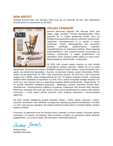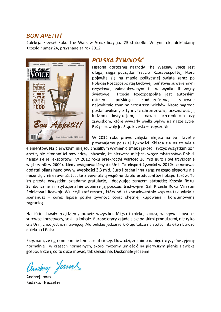 BON APETIT! Kolekcja Krzeseł Roku The Warsaw Voice liczy już 23 statuetki. W tym roku dokładamy Krzesło numer 24, przyznane za rok 2012. POLSKA ŻYWNOŚĆ Historia dorocznej nagrody The Warsaw Voice jest długa, sięga początku Trzeciej Rzeczpospolitej, która pojawiła się na mapie politycznej świata zaraz po Polskiej Rzeczpospolitej Ludowej, państwie suwerennym częściowo, zainstalowanym tu w wyniku II wojny światowej. Trzecia Rzeczpospolita jest autorskim dziełem polskiego społeczeństwa, zapewne najwybitniejszym na przestrzeni wieków. Naszą nagrodę postanowiliśmy z tym zsynchronizować, przyznawać ją ludziom, instytucjom, a nawet przedmiotom czy zjawiskom, które wywarły wielki wpływ na nasze życie. Reżyserowały je. Stąd krzesło – reżyserskie. W 2012 roku prawo zajęcia miejsca na tym krześle przyznajemy polskiej żywności. Składa się na to wiele elementów. Na pierwszym miejscu chciałbym wymienić smak i jakość i życzyć wszystkim bon apetit, ale ekonomiści powiedzą, i słusznie, że pierwsze miejsce, wręcz mistrzostwo Polski, należy się jej eksportowi. W 2012 roku przekroczył wartość 16 mld euro i był trzykrotnie większy niż w 2004r. kiedy wstępowaliśmy do Unii. To eksport żywości w 2012r. zanotował dodatni bilans handlowy w wysokości 3,3 mld. Euro i żadna inna gałąź naszego eksportu nie może się z nim równać. Jest to z pewnością wspólne dzieło producentów i eksporterów. To im przede wszystkim składamy gratulacje, dedykując zarazem statuetkę Krzesła Roku. Symbolicznie i instytucjonalnie odbierze ją podczas tradycyjnej Gali Krzesła Roku Minister Rolnictwa i Rozwoju Wsi czyli szef resortu, który od lat konsekwentnie wspiera taki właśnie scenariusz – coraz lepsza polska żywność coraz chętniej kupowana i konsumowana zagranicą. Na liście chwały znajdziemy prawie wszystko. Mięso i mleko, zboża, warzywa i owoce, surowce i przetwory, soki i alkohole. Europejczycy zajadają się polskimi produktami, nie tylko ci z Unii, choć jest ich najwięcej. Ale polskie jedzenie króluje także na stołach daleko i bardzo daleko od Polski. Przyznam, że ogromnie mnie ten laureat cieszy. Dowodzi, że mimo napięć i kryzysów żyjemy normalnie i w czasach normalnych, skoro możemy umieścić na pierwszym planie zjawiska gospodarcze i, co tu dużo mówić, tak sensualne. Doskonałe jedzenie. Andrzej Jonas Redaktor Naczelny Lista dotychczasowych laureatów Krzesła Roku The Warsaw Voice 1989 Lech Wałęsa 1990 Leszek Balcerowicz 1991 Jan Krzysztof Bielecki 1992 Hanna Suchocka 1993 Warszawska Giełda Papierów Wartościowych 1994 Hanna Gronkiewicz-Waltz 1995 Izba Administracji, Pracy i Spraw Socjalnych Sądu Najwyższego 1996 Samochód osobowy 1997 Tadeusz Mazowiecki i Roman Kluska - Krzesło Dzięsięciolecia 1998 Jerzy Buzek 1999 Bronisław Geremek 2000 Aleksander Kwaśniewski 2001 Adam Małysz 2002 Danuta Huebner 2003 Jerzy Hausner 2004 Marek Belka 2005 Rafał Blechacz 2006 Polska gospodarka 2007 Donald Tusk 2008 Leszek Balcerowicz i Lech Wałęsa - Krzesło Dwudziestolecia 2009 Jacek Rostowski 2010 Aleksander Grad 2011 Donald Tusk