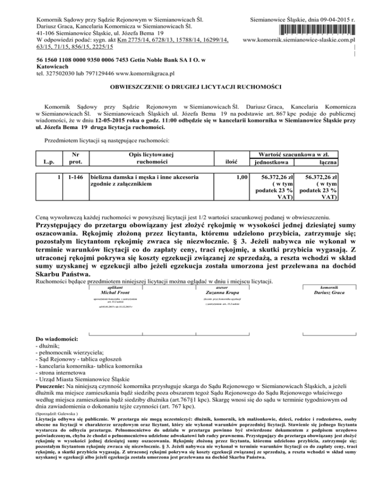 Siemianowice Śląskie, dnia 09-04-2015 r. Komornik Sądowy przy Sądzie Rejonowym w Siemianowicach Śl. Dariusz Graca, Kancelaria Komornicza w Siemianowicach Śl. 41-106 Siemianowice Śląskie, ul. Józefa Bema 19 W odpowiedzi podać: sygn. akt Km 2775/14, 6728/13, 15788/14, 16299/14, 63/15, 71/15, 856/15, 2225/15 *6015040902358* www.komornik.siemianowice-slaskie.com.pl | | 56 1560 1108 0000 9350 0006 7453 Getin Noble Bank SA I O. w Katowicach tel. 327502030 lub 797129446 www.komornikgraca.pl OBWIESZCZENIE O DRUGIEJ LICYTACJI RUCHOMOŚCI Komornik Sądowy przy Sądzie Rejonowym w Siemianowicach Śl. Dariusz Graca, Kancelaria Komornicza w Siemianowicach Śl. w Siemianowicach Śląskich ul. Józefa Bema 19 na podstawie art. 867 kpc podaje do publicznej wiadomości, że w dniu 12-05-2015 roku o godz. 11:00 odbędzie się w kancelarii komornika w Siemianowice Śląskie przy ul. Józefa Bema 19 druga licytacja ruchomości. Przedmiotem licytacji są następujące ruchomości: Nr prot. L.p. 1 1-146 Opis licytowanej ruchomości ilość bielizna damska i męska i inne akcesoria zgodnie z załącznikiem 1,00 Wartość szacunkowa w zł. jednostkowa łączna 56.372,26 zł ( w tym podatek 23 % VAT) 56.372,26 zł ( w tym podatek 23 % VAT) Ceną wywoławczą każdej ruchomości w powyższej licytacji jest 1/2 wartości szacunkowej podanej w obwieszczeniu. Przystępujący do przetargu obowiązany jest złożyć rękojmię w wysokości jednej dziesiątej sumy oszacowania. Rękojmię złożoną przez licytanta, któremu udzielono przybicia, zatrzymuje się; pozostałym licytantom rękojmię zwraca się niezwłocznie. § 3. Jeżeli nabywca nie wykonał w terminie warunków licytacji co do zapłaty ceny, traci rękojmię, a skutki przybicia wygasają. Z utraconej rękojmi pokrywa się koszty egzekucji związanej ze sprzedażą, a reszta wchodzi w skład sumy uzyskanej w egzekucji albo jeżeli egzekucja została umorzona jest przelewana na dochód Skarbu Państwa. Ruchomości będące przedmiotem niniejszej licytacji można oglądać w dniu i miejscu licytacji. aplikant asesor komornik Michał Front Zuzanna Krupa Dariusz Graca upoważnienie komornika z zastrzeżeniem art. 33.2 uoksie zlecenie przez komornika egzekucji z zastrzeżeniem art.. 33.2 uoksie od 01.01.2015 r do 31.12.2015 r Do wiadomości: - dłużnik; - pełnomocnik wierzyciela; - Sąd Rejonowy - tablica ogłoszeń - kancelaria komornika- tablica komornika - strona internetowa - Urząd Miasta Siemianowice Śląskie Pouczenie: Na niniejszą czynność komornika przysługuje skarga do Sądu Rejonowego w Siemianowicach Śląskich, a jeżeli dłużnik ma miejsce zamieszkania bądź siedzibę poza obszarem tegoż Sądu Rejonowego do Sądu Rejonowego właściwego według miejsca zamieszkania bądź siedziby dłużnika (art.767§1 kpc). Skargę wnosi się do sądu w terminie tygodniowym od dnia zawiadomienia o dokonaniu tejże czynności (art. 767 kpc). (Sporządził: Galewska ) Licytacja odbywa się publicznie. W przetargu nie mogą uczestniczyć: dłużnik, komornik, ich małżonkowie, dzieci, rodzice i rodzeństwo, osoby obecne na licytacji w charakterze urzędowym oraz licytant, który nie wykonał warunków poprzedniej licytacji. Stawienie się jednego licytanta wystarcza do odbycia przetargu. Pełnomocnictwo do udziału w przetargu powinno być stwierdzone dokumentem z podpisem urzędowo poświadczonym, chyba że chodzi o pełnomocnictwo udzielone adwokatowi lub radcy prawnemu. Przystępujący do przetargu obowiązany jest złożyć rękojmię w wysokości jednej dziesiątej sumy oszacowania. Rękojmię złożoną przez licytanta, któremu udzielono przybicia, zatrzymuje się; pozostałym licytantom rękojmię zwraca się niezwłocznie. § 3. Jeżeli nabywca nie wykonał w terminie warunków licytacji co do zapłaty ceny, traci rękojmię, a skutki przybicia wygasają. Z utraconej rękojmi pokrywa się koszty egzekucji związanej ze sprzedażą, a reszta wchodzi w skład sumy uzyskanej w egzekucji albo jeżeli egzekucja została umorzona jest przelewana na dochód Skarbu Państwa.