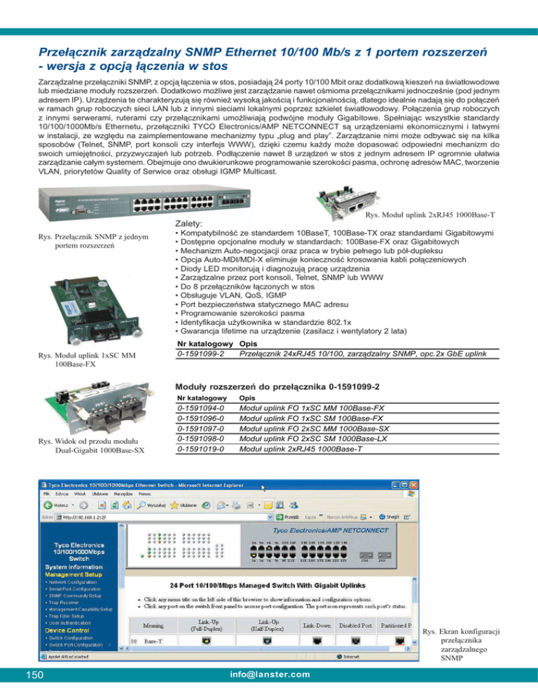 Prze³¹cznik zarz¹dzalny SNMP Ethernet 10/100 Mb/s z 1 portem rozszerzeñ - wersja z opcj¹ ³¹czenia w stos Zarz¹dzalne prze³¹czniki SNMP, z opcj¹ ³¹czenia w stos, posiadaj¹ 24 porty 10/100 Mbit oraz dodatkow¹ kieszeñ na œwiat³owodowe lub miedziane modu³y rozszerzeñ. Dodatkowo mo¿liwe jest zarz¹dzanie nawet oœmioma prze³¹cznikami jednoczeœnie (pod jednym adresem IP). Urz¹dzenia te charakteryzuj¹ siê równie¿ wysok¹ jakoœci¹ i funkcjonalnoœci¹, dlatego idealnie nadaj¹ siê do po³¹czeñ w ramach grup roboczych sieci LAN lub z innymi sieciami lokalnymi poprzez szkielet œwiat³owodowy. Po³¹czenia grup roboczych z innymi serwerami, ruterami czy prze³¹cznikami umo¿liwiaj¹ podwójne modu³y Gigabitowe. Spe³niaj¹c wszystkie standardy 10/100/1000Mb/s Ethernetu, prze³¹czniki TYCO Electronics/AMP NETCONNECT s¹ urz¹dzeniami ekonomicznymi i ³atwymi w instalacji, ze wzglêdu na zaimplementowane mechanizmy typu „plug and play”. Zarz¹dzanie nimi mo¿e odbywaæ siê na kilka sposobów (Telnet, SNMP, port konsoli czy interfejs WWW), dziêki czemu ka¿dy mo¿e dopasowaæ odpowiedni mechanizm do swoich umiejêtnoœci, przyzwyczajeñ lub potrzeb. Pod³¹czenie nawet 8 urz¹dzeñ w stos z jednym adresem IP ogromnie u³atwia zarz¹dzanie ca³ym systemem. Obejmuje ono dwukierunkowe programowanie szerokoœci pasma, ochronê adresów MAC, tworzenie VLAN, priorytetów Quality of Serwice oraz obs³ugi IGMP Multicast. Rys. Prze³¹cznik SNMP z jednym portem rozszerzeñ Rys. Modu³ uplink 1xSC MM 100Base-FX Rys. Modu³ uplink 2xRJ45 1000Base-T Zalety: • Kompatybilnoœæ ze standardem 10BaseT, 100Base-TX oraz standardami Gigabitowymi • Dostêpne opcjonalne modu³y w standardach: 100Base-FX oraz Gigabitowych • Mechanizm Auto-negocjacji oraz praca w trybie pe³nego lub pó³-dupleksu • Opcja Auto-MDI/MDI-X eliminuje koniecznoœæ krosowania kabli po³¹czeniowych • Diody LED monitoruj¹ i diagnozuj¹ pracê urz¹dzenia • Zarz¹dzalne przez port konsoli, Telnet, SNMP lub WWW • Do 8 prze³¹czników ³¹czonych w stos • Obs³uguje VLAN, QoS, IGMP • Port bezpieczeñstwa statycznego MAC adresu • Programowanie szerokoœci pasma • Identyfikacja u¿ytkownika w standardzie 802.1x • Gwarancja lifetime na urz¹dzenie (zasilacz i wentylatory 2 lata) Nr katalogowy Opis 0-1591099-2 Przełącznik 24xRJ45 10/100, zarządzalny SNMP, opc.2x GbE uplink Modu³y rozszerzeñ do prze³¹cznika 0-1591099-2 Nr katalogowy Rys. Widok od przodu modu³u Dual-Gigabit 1000Base-SX 150 0-1591094-0 0-1591096-0 0-1591097-0 0-1591098-0 0-1591019-0 Opis Moduł uplink FO 1xSC MM 100Base-FX Moduł uplink FO 1xSC SM 100Base-FX Moduł uplink FO 2xSC MM 1000Base-SX Moduł uplink FO 2xSC SM 1000Base-LX Moduł uplink 2xRJ45 1000Base-T Rys. Ekran konfiguracji prze³¹cznika zarz¹dzalnego SNMP [email protected] Prze³¹czniki zarz¹dzalne Ethernet 10/100 Mb/s wersja SMART II Seria SMART II to ekonomiczne i bardzo ³atwe w instalacji prze³¹czniki posiadaj¹ce 16 lub 24 porty 10/100 Mbit oraz dodatkowy port rozszerzeñ na modu³y 100BaseFX lub podwójne modu³y gigabitowe. Dziêki temu jeœli zachodzi taka potrzeba urz¹dzenia te mo¿na wykorzystaæ do po³¹czeñ (standard Fast Ethernet lub Gigabit Ethernet) ró¿nych grup roboczych sieci LAN z innymi sieciami lokalnymi poprzez szkielet œwiat³owodowy lub miedziany. Wszelkich zmian w konfiguracji mo¿na dokonywaæ po pod³¹czeniu siê do prze³¹cznika przez lokalny port konsoli. Dodatkowe funkcje jak mo¿liwoœæ tworzenia VLAN, nadawania priorytetów czy programowania pojedynczych portów pozwalaj¹ na szerokie wykorzystanie tych prze³¹czników od prostego pod³¹czenia u¿ytkowników do sieci a¿ do tworzenia bezpiecznych systemów opartych o zarz¹dzanie sieciami lokalnymi. Spe³niaj¹c wszystkie istotne standardy 10/100/1000Mb/s Ethernetu s¹ urz¹dzeniami ³atwymi w uruchomieniu, dziêki zaimplementowanym mechanizmom typu „plug and play”. Opcjonalne modu³y œwiat³owodowe 100BaseFX (Fast Ethernet) dostêpne s¹ z interfejsem SC (wersja wielomodowa lub jednomodowa), zaœ po³¹czenia gigabitowe mo¿na realizowaæ nie tylko œwiat³owodowymi modu³ami podwójnymi w standardach 1000Base-SX lub 1000Base-LX, ale tak¿e przez podwójny (2xRJ45) modu³ miedziany 1000BaseT. Obs³uga QoS jest programowana przez ka¿dy port, za pomoc¹ standardu IPTOS/DiffServ lub 802.1p. Dwustopniowy system priorytetów pozwala na obs³u¿enie w razie przeci¹¿enia systemu VoIP przed transmisj¹ o ni¿szym priorytecie. Prze³¹cznik wystêpuje w wersji wolnostoj¹cej, ale mo¿na go zamontowaæ w stela¿u 19”, posiada wewnêtrzny zasilacz AC, który dodatkowo stabilizuje pracê systemu. Metalowa obudowa zwiêksza zewnêtrzn¹ ochronê oraz dzia³a jak dodatkowy ekran. Urz¹dzenie jest objête gwarancj¹ typu lifetime (z wyj¹tkiem zasilacza i wentylatorów, które maj¹ gwarancjê 2-letni¹). Przełącznik SMART II 24 port Numer katalogowy Ilość portów RJ45 10/100 MoŜliwe rozszerzenia Zarządzanie Pasmo przenoszenia magistrali danych Ilość sieci VLAN 0-1591093-2 16 Pojedynczy moduł 100FX wielomodowy SC lub jednomodowy SC lub podwójny moduł Gigabit LX, SX oraz 1000BaseT przez port lokalny (port konsoli) 8.8Gb/s Non-blocking 26 (opartych o porty) tak QoS Rozmiar tablicy 8K MAC adresów Gabaryty (D x S x W) Auto-Negocjacja Metoda przekazywania Kontrola przepływu Zasilanie Sterowanie pasmem 440mm x 160mm x 44mm N-Way Store and Forward Back Pressure and Flow Control 100-240V, 20W Max Ingress and Egress Rys. Modu³ uplink 1xSC MM 100Base-FX Modu³y rozszerzeñ do prze³¹czników SMART II Nr katalogowy 0-1591094-0 0-1591096-0 0-1591097-0 0-1591098-0 0-1591019-0 Opis Moduł uplink FO 1xSC MM 100Base-FX Moduł uplink FO 1xSC SM 100Base-FX Moduł uplink FO 2xSC MM 1000Base-SX Moduł uplink FO 2xSC SM 1000Base-LX Moduł uplink 2xRJ45 1000Base-T Rys. Widok od przodu modu³u Dual-Gigabit 1000Base-SX Prze³¹czniki SMART 8x RJ45 10/100 ze zintegro