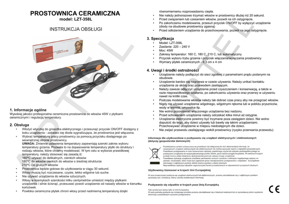 PROSTOWNICA CERAMICZNA model: LZT-358L • • • INSTRUKCJA OBSŁUGI • równomiernemu rozprowadzeniu ciepła. Nie należy jednorazowo trzymać włosów w prostownicy dłużej niż 20 sekund. Przed związaniem lub czesaniem włosów, pozwól na ich ostygnięcie. Po zakończeniu modelowania, przesuń przycisk ON/OFF by wyłączyć urządzenie (diody na obudowie prostownicy zgasną) Przed odłożeniem urządzenia do przechowywania, pozwól na jego ostygnięcie. 3. Specyfikacja • • • • • • Model: LZT-358L Zasilanie: 220 – 240 V Moc: 45W Zakresy temperatur: 160 C, 180 C, 210 C, lub automatyczny Przycisk wyboru trybu grzania i przycisk włączania/wyłączania prostownicy Wymiary płytek ceramicznych - 9,3 cm x 4 cm 4. Uwagi i środki ostrożności • • • • • 1. Informacje ogólne Wysokiej jakości profesjonalna ceramiczna prostownica do włosów 45W z płytkami ceramicznymi i regulacją temperatury. • • • 2. Obsługa • • • • • • • Włożyć wtyczkę do gniazdka elektrycznego i przesunąć przycisk ON/OFF dostępny z boku urządzenia - zaświeci się dioda sygnalizująca, że prostownica jest włączona. Wybrać temperaturę pracy prostownicy za pomocą przycisku dostępnego po wewnętrznej stronie prostownicy. UWAGA: Zmienne ustawienia temperatury zapewniają szeroki zakres wyboru temperatury grzania. Pozwala to na dopasowanie temperatury płytki do struktury i rodzaju włosów, które chcemy modelować. W tym celu w wyborze prawidłowej temperatury, należy stosować się zasadą iż: 160ºC używać do delikatnych, cienkich włosów 180ºC do włosów cienkich do włosów o średniej strukturze 210ºC Do grubych włosów Prostownica będzie gotowa do użytkowania w ciągu 30 sekund. Włosy muszą być rozczesane, czyste, lekko wilgotne lub suche. Nie używać urządzenia do włosów sztucznych. Włosy w kosmykach szerokości kilku centymetrów umieścić między płytkami urządzenia i silnie ścisnąć, przesuwać powoli urządzenie od nasady włosów w kierunku końcówek. Powłoka ceramiczna płytek chroni włosy przed nadmierną temperaturą dzięki • Urządzenie należy podłączyć do sieci zgodnej z parametrami prądu podanymi na obudowie. Urządzenie bardzo się nagrzewa w czasie używania. Należy unikać kontaktu urządzenia ze skórą oraz przewodem zasilającym. Należy zawsze odłączyć urządzenie przed czyszczeniem i konserwacją, a także w razie nieprawidłowego działania, po zakończeniu używania oraz przerwy w używaniu nawet na krótki czas. Podczas modelowania włosów należy tak dobrać czas pracy aby nie przegrzać włosów. Nigdy nie używać urządzenia wilgotnego, wilgotnymi rękoma lub w pobliżu pryszniców, wody w wannie, umywalce itp. Nie wolno pozostawiać włączonego urządzenia bez nadzoru. Przed schowaniem urządzenia należy odczekać kilka minut aż ostygnie. Urządzenia elektryczne powinny być trzymane poza zasięgiem dzieci. Nie wolno dopuścić do tego, aby dzieci używały lub bawiły się takimi urządzeniami. Przechowywać urządzenie w miejscu niedostępnym dla dzieci. Nie zwijać przewodu zasilającego wokół prostownicy (ryzyko przerwania przewodu).