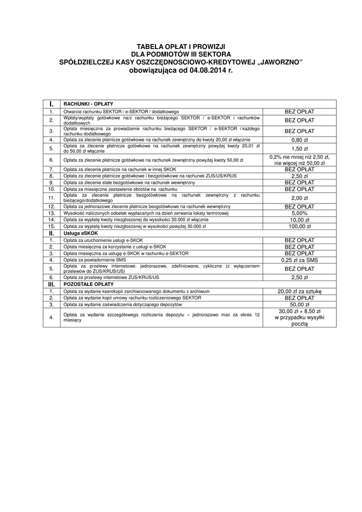 TABELA OPŁAT I PROWIZJI DLA PODMIOTÓW III SEKTORA SPÓŁDZIELCZEJ KASY OSZCZĘDNOSCIOWO-KREDYTOWEJ „JAWORZNO” obowiązująca od 04.08.2014 r. I. RACHUNKI - OPŁATY 1. 5. Otwarcie rachunku SEKTOR / e-SEKTOR / dodatkowego Wpłaty/wypłaty gotówkowe na/z rachunku bieżącego SEKTOR / e-SEKTOR i rachunków dodatkowych Opłata miesięczna za prowadzenie rachunku bieżącego SEKTOR / e-SEKTOR i każdego rachunku dodatkowego Opłata za zlecenie płatnicze gotówkowe na rachunek zewnętrzny do kwoty 20,00 zł włącznie Opłata za zlecenie płatnicze gotówkowe na rachunek zewnętrzny powyżej kwoty 20,01 zł do 50,00 zł włącznie 6. Opłata za zlecenie płatnicze gotówkowe na rachunek zewnętrzny powyżej kwoty 50,00 zł 2. 3. 4. 7. 8. 9. 10. 12. 13. 14. 15. Opłata za zlecenie płatnicze na rachunek w innej SKOK Opłata za zlecenie płatnicze gotówkowe i bezgotówkowe na rachunek ZUS/US/KRUS Opłata za zlecenie stałe bezgotówkowe na rachunek wewnętrzny Opłata za miesięczne zestawienie obrotów na rachunku Opłata za zlecenie płatnicze bezgotówkowe na rachunek zewnętrzny z rachunku bieżącego/dodatkowego Opłata za jednorazowe zlecenie płatnicze bezgotówkowe na rachunek wewnętrzny Wysokość naliczonych odsetek wypłacanych na dzień zerwania lokaty terminowej Opłata za wypłatę kwoty niezgłoszonej do wysokości 30.000 zł włącznie Opłata za wypłatę kwoty niezgłoszonej w wysokości powyżej 30.000 zł II. Usługa eSKOK 1. 2. 3. 4. 6. Opłata za uruchomienie usługi e-SKOK Opłata miesięczna za korzystanie z usługi e-SKOK Opłata miesięczna za usługę e-SKOK w rachunku e-SEKTOR Opłata za powiadomienie SMS Opłata za przelewy internetowe: jednorazowe, zdefiniowane, cykliczne (z wyłączeniem przelewów do ZUS/KRUS/US) Opłata za przelewy internetowe ZUS/KRUS/US III. POZOSTAŁE OPŁATY 1. 2. 3. Opłata za wydanie kserokopii zarchiwizowanego dokumentu z archiwum Opłata za wydanie kopii umowy rachunku rozliczeniowego SEKTOR Opłata za wydanie zaświadczenia dotyczącego depozytów 4. Opłata za wydanie szczegółowego rozliczenia depozytu – jednorazowo max za okres 12 miesięcy 11. 5. BEZ OPŁAT BEZ OPŁAT BEZ OPŁAT 0,80 zł 1,50 zł 0,2% nie mniej niż 2,50 zł, nie więcej niż 50,00 zł BEZ OPŁAT 2,50 zł BEZ OPŁAT BEZ OPŁAT 2,00 zł BEZ OPŁAT 5,00% 10,00 zł 100,00 zł BEZ OPŁAT BEZ OPŁAT BEZ OPŁAT 0,25 zł za SMS BEZ OPŁAT 2,50 zł 20,00 zł za sztukę BEZ OPŁAT 50,00 zł 30,00 zł + 8,50 zł w przypadku wysyłki pocztą