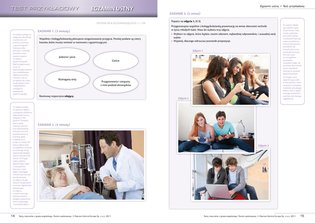 TEST PRZYKŁADOWY EGZAMIN USTNY ZESTAW DLA EGZAMINUJĄCEGO >> 120 To zadanie polega na odegraniu określonej w poleceniu roli podczas rozmowy z egzaminującym. Pamiętaj, żeby poruszyć i rozwinąć wszystkie cztery kwestie zawarte w zadaniu egzaminacyjnym. Bądź przygotowany na to, że egzaminujący poprosi cię o dokładniejsze objaśnienie jednej z kwestii, oraz że nie zgodzi się z tobą co do jednej z nich, i odpowiednio zareaguj na wypowiedzi egzaminującego. To zadanie polega na opisaniu zdjęcia, a następnie udzieleniu odpowiedzi na trzy związane z nim pytania. Pamiętaj, aby w opisie ilustracji zawrzeć trzy najważniejsze elementy: kto jest przedstawiony na ilustracji, gdzie znajdują się te osoby i co robią. Nie opisuj zdjęcia zbyt szczegółowo, postaraj się rozwinąć swoją wypowiedź dodając własne odczucia lub opinie. W drugiej części zadania, egzaminujący zada ci trzy pytania. Pierwsze z nich będzie wymagało interpretacji sytuacji przedstawionej na zdjęciu, drugie dotyczy twojej opinii na temat zagadnienia pokazanego na zdjęciu, a trzecie wymaga zrelacjonowania jakiegoś wydarzenia, luźno związanego z tematyką zdjęcia. 14 Zadanie 1. (3 minuty) Wspólnie z kolegą/koleżanką planujecie zorganizowanie przyjęcia. Poniżej podane są cztery kwestie, które musisz omówić w rozmowie z egzaminującym. Egzamin ustny • Test przykładowy Zadanie 3. (5 minut) Popatrz na zdjęcia 1, 2 i 3. Przygotowujesz wspólnie z kolegą/koleżanką prezentację na temat obecności techniki w życiu młodych ludzi. Masz do wyboru trzy zdjęcia. • Wybierz to zdjęcie, które będzie, twoim zdaniem, najbardziej odpowiednie, i uzasadnij swój wybór. • Wyjaśnij, dlaczego odrzucasz pozostałe propozycje. Zdjęcie 1 Jedzenie i picie Goście Wymagany strój W drugiej części egzaminujący zada ci dwa pytania, luźno związane z tematyką materiału wizualnego. Jedno z nich z reguły wymaga omówienia wad lub zalet danego zagadnienia. Przygotowania i związany z nimi podział obowiązków Rozmowę rozpoczyna zdający. To zadanie składa się z dwóch części. W pierwszej z nich, twoim zadaniem jest wybór jednej z podanych ilustracji i jego uzasadnienie oraz przedstawienie powodów, dla których odrzucasz pozostałe ilustracje. Nie trać czasu na szczegółowe opisywanie wszystkich zdjęć, ale pamiętaj, aby odnieść się do wszystkich ilustracji w zestawie egzaminacyjnym. Zdjęcie 2 Zadanie 2. (4 minuty) Testy maturalne z języka angielskiego. Poziom podstawowy. © Pearson Central Europe Sp. z o.o. 2011 Zdjęcie 2 Zdjęcie 3 Testy maturalne z języka angielskiego. Poziom podstawowy. © Pearson Central Europe Sp. z o.o. 2011 15