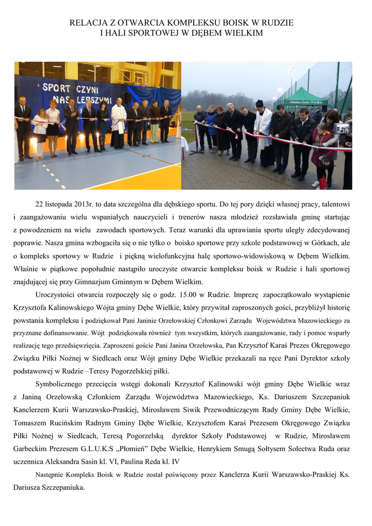 RELACJA Z OTWARCIA KOMPLEKSU BOISK W RUDZIE I HALI SPORTOWEJ W DĘBEM WIELKIM 22 listopada 2013r. to data szczególna dla dębskiego sportu. Do tej pory dzięki własnej pracy, talentowi i zaangaŜowaniu wielu wspaniałych nauczycieli i trenerów nasza młodzieŜ rozsławiała gminę startując z powodzeniem na wielu zawodach sportowych. Teraz warunki dla uprawiania sportu uległy zdecydowanej poprawie. Nasza gmina wzbogaciła się o nie tylko o boisko sportowe przy szkole podstawowej w Górkach, ale o kompleks sportowy w Rudzie i piękną wielofunkcyjna halę sportowo-widowiskową w Dębem Wielkim. Właśnie w piątkowe popołudnie nastąpiło uroczyste otwarcie kompleksu boisk w Rudzie i hali sportowej znajdującej się przy Gimnazjum Gminnym w Dębem Wielkim. Uroczystości otwarcia rozpoczęły się o godz. 15.00 w Rudzie. Imprezę zapoczątkowało wystąpienie Krzysztofa Kalinowskiego Wójta gminy Dębe Wielkie, który przywitał zaproszonych gości, przybliŜył historię powstania kompleksu i podziękował Pani Janinie Orzełowskiej Członkowi Zarządu Województwa Mazowieckiego za przyznane dofinansowanie. Wójt podziękowała równieŜ tym wszystkim, których zaangaŜowanie, rady i pomoc wsparły realizację tego przedsięwzięcia. Zaproszeni goście Pani Janina Orzełowska, Pan Krzysztof Karaś Prezes Okręgowego Związku Piłki NoŜnej w Siedlcach oraz Wójt gminy Dębe Wielkie przekazali na ręce Pani Dyrektor szkoły podstawowej w Rudzie –Teresy Pogorzelskiej piłki. Symbolicznego przecięcia wstęgi dokonali Krzysztof Kalinowski wójt gminy Dębe Wielkie wraz z Janiną Orzełowską Członkiem Zarządu Województwa Mazowieckiego, Ks. Dariuszem Szczepaniuk Kanclerzem Kurii Warszawsko-Praskiej, Mirosławem Siwik Przewodniczącym Rady Gminy Dębe Wielkie, Tomaszem Rucińskim Radnym Gminy Dębe Wielkie, Krzysztofem Karaś Prezesem Okręgowego Związku Piłki NoŜnej w Siedlcach, Teresą Pogorzelską dyrektor Szkoły Podstawowej w Rudzie, Mirosławem Garbeckim Prezesem G.L.U.K.S „Płomień” Dębe Wielkie, Henrykiem Smugą Sołtysem Sołectwa Ruda oraz uczennica Aleksandra Sasin kl. VI, Paulina Reda kl. IV Następnie Kompleks Boisk w Rudzie został poświęcony przez Kanclerza Kurii Warszawsko-Praskiej Ks. Dariusza Szczepaniuka. Dalsza część programu otwarcia kompleksów sportowych w gminie Dębe Wielkie. odbyła się juŜ w budynku hali sportowej w Dębem Wielkim. Na uroczyste otwarcie infrastruktur sportowej przybyło wielu szacownych Gości. Wśród nich byli: Pan Czesław Mroczek, Sekretarz Stanu w Ministerstwie Obrony Narodowej, poseł na sejm Rzeczypospolitej Polskiej; Ksiądz doktor Dariusz Szczepaniuk Kanclerz Kurii Warszawsko-Praskiej; Pani Janina Orzełowska, Członek Zarządu Województwa Mazowieckiego; Pan Antoni Jan Tarczyński, Starosta Powiatu Mińskiego; Pan Bogusław Rózga prezes firmy ZIB, która wybudowała obiekt; Wójtowie i burmistrzowie z ościennych gmin, Radni Powiatu Mińskiego i Radni Gminy Dębe Wielkie, księŜa z okolicznych parafii. Na uroczystość przybyli takŜe licznie mieszkańcy gminy. Urocz ystość rozpoczęli prowadzący: Pani Marta Smonder oraz Pan Mariusz Kujawski – nauczyciele Zespołu Szkół w Dębem Wielkim. Następnie wprowadzono poczty sztandarowe ze wszystkich szkół i odegrano hymn państwowy. Jako pierwszy głos zabrał Wójt Gminy Dębe Wielkie, który przywitał przybyłych gości i wygłosił przemówienie na temat powstania obiektów sportowych na terenie gminy Dębe Wielkie. Wójt podziękował za dofinasowanie otrzymane w ramach Programu Rozwoju Bazy Sportowej Województwa Mazowieckiego na 2012 rok z Funduszu Rozwoju Kultury Fizycznej środków Ministerstwa Sportu i Turystyki w łącznej kwocie dofinansowania 1 200 000,00 zł, a takŜe wyraził przekonanie, iŜ nowy obiekt sportowy słuŜył będzie zarówno mieszkańcom jak i gościom odwiedzającym naszą gminę, przyczyniając się do ich rozwoju fizycznego. Będzie to miejsce aktywnego wypoczynku zachowanego w duchu zdrowe, sportowej rywalizacji . Punktem kulminacyjnym otwarcia obiektu, było niewątpliwie przecięcie wstęgi. Dokonało tego wielu znakomitych gości: Sekretarz Stanu w Ministerstwie Obrony Narodowej, poseł na sejm RP Czesław Mroczek, kanclerz kurii Warszawsko – praskiej ks. Dariusz Szczepaniuk, Członek Zarządu Województwa mazowieckiego Janina Orzełowska, Starosta Miński Antonii Jan Tarczyński, Wójt gminy Dębe Wielkie Krzysztof Kalinowski, Dyrektor Zespołu Szkół w Dębem Wielkim Krzysztof Rek, Przewodniczący rady Gminy Dębe Wielkie Mirosław Siwik, Marek Piotrowski – wielokrotny zawodowy Mistrz Świata w kick boxingu mieszkaniec gminy Dębe Wielkie, Bogusław RóŜga Prezes Przedsiębiorstwa Budowlano- Produkcyjnego Spółdzielnia „ZIB’, przedstawicielki Samorządów Uczniowskich Zespołu Szkół w Dębem Wielkim uczennice: Matylda Tkaczyk i Marta Nowicka. By ustrzec uczniów ćwiczących w tej hali od kontuzji oraz aby zapewnić im i całemu gronu pedagogicznemu przychylność losu, Kanclerz kurii Warszawsko – praskiej ks. Dariusz Szczepaniuk poświęcił obiekt oraz krzyŜe, które zawisną w nowych salach lekcyjnych i hali. Po czym nadszedł czas na przemówienia zaproszonych gości. W swoich przemówieniach wszyscy gratulowali władzom gminnym wytrwałości, zaangaŜowania. Zaproszeni gości m.in. Sekretarz Stanu Pan Czesław Mroczek, Członek Zarządu województwa mazowieckiego Janina Orzełowska, Starosta miński Antoni Jan Tarczyński, Wójt gminy Mińsk Mazowiecki przekazali na ręce dyrektora Zespoły Szkół Krzysztofa Rek prezenty w postaci piłek. Część oficjalna zakończyła się wręczeniem pamiątkowych ryngrafów dostojnym gościom za udział w otwarciu Kompleksu Boisk w Rudzie i Hali Sportowej w Dębem Wielkim. Podziękowania otrzymali: Sekretarz Stanu w Ministerstwie Obrony Narodowej, poseł na sejm RP Czesław Mroczek, Janina Orzełowska Członek Zarządu Województwa Mazowieckiego, Antonii Jan Tar