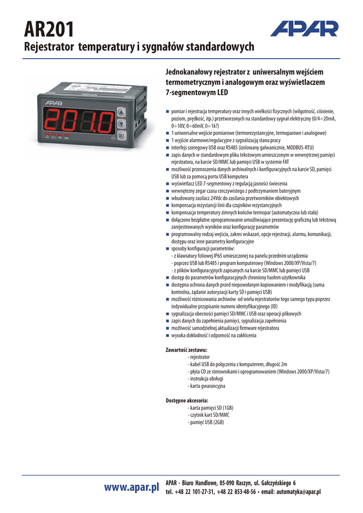 AR201 Rejestrator temperatury i sygnałów standardowych Jednokanałowy rejestrator z uniwersalnym wejściem termometrycznym i analogowym oraz wyświetlaczem 7-segmentowym LED n pomiar i rejestracja temperatury oraz innych wielkości fizycznych (wilgotność, ciśnienie, poziom, prędkość, itp.) przetworzonych na standardowy sygnał elektryczny (0/4÷20mA, 0÷10V, 0÷60mV, 0÷1k?) n 1 uniwersalne wejście pomiarowe (termorezystancyjne, termoparowe i analogowe) n 1 wyjście alarmowe/regulacyjne z sygnalizacją stanu pracy n interfejs szeregowy USB oraz RS485 (izolowany galwanicznie, MODBUS-RTU) n zapis danych w standardowym pliku tekstowym umieszczonym w wewnętrznej pamięci rejestratora, na karcie SD/MMC lub pamięci USB w systemie FAT n możliwość przenoszenia danych archiwalnych i konfiguracyjnych na karcie SD, pamięci USB lub za pomocą portu USB komputera n wyświetlacz LED 7-segmentowy z regulacją jasności świecenia n wewnętrzny zegar czasu rzeczywistego z podtrzymaniem bateryjnym n wbudowany zasilacz 24Vdc do zasilania przetworników obiektowych n kompensacja rezystancji linii dla czujników rezystancyjnych n kompensacja temperatury zimnych końców termopar (automatyczna lub stała) n dołączone bezpłatne oprogramowanie umożliwiające prezentację graficzną lub tekstową zarejestrowanych wyników oraz konfigurację parametrów n programowalny rodzaj wejścia, zakres wskazań, opcje rejestracji, alarmu, komunikacji, dostępu oraz inne parametry konfiguracyjne n sposoby konfiguracji parametrów: - z klawiatury foliowej IP65 umieszczonej na panelu przednim urządzenia - poprzez USB lub RS485 i program komputerowy (Windows 2000/XP/Vista/7) - z plików konfiguracyjnych zapisanych na karcie SD/MMC lub pamięci USB n dostęp do parametrów konfiguracyjnych chroniony hasłem użytkownika n dostępna ochrona danych przed niepowołanym kopiowaniem i modyfikacją (suma kontrolna, żądanie autoryzacji karty SD i pamięci USB) n możliwość różnicowania archiwów od wielu rejestratorów tego samego typu poprzez indywidualne przypisanie numeru identyfikacyjnego (ID) n sygnalizacja obecności pamięci SD/MMC i USB oraz operacji plikowych n zapis danych do zapełnienia pamięci, sygnalizacja zapełnienia n możliwość samodzielnej aktualizacji firmware rejestratora n wysoka dokładność i odporność na zakłócenia Zawartość zestawu: - rejestrator - kabel USB do połączenia z komputerem, długość 2m - płyta CD ze sterownikami i oprogramowaniem (Windows 2000/XP/Vista/7) - instrukcja obsługi - karta gwarancyjna Dostępne akcesoria: - karta pamięci SD (1GB) - czytnik kart SD/MMC - pamięć USB (2GB) www.apar.pl APAR - Biuro Handlowe, 05-090 Raszyn, ul. Gałczyńskiego 6 tel. +48 22 101-27-31, +48 22 853-48-56 • email: [email protected] Dane Techniczne Dane Montażowe Uniwersalne wejście (programowalne): zakres pomiarowy Tablicowa 96x48 Incabox XT L57 - Pt100 (RTD, 3- lub 2-przewodowe) -200 ÷ 850 °C Materiał samogasnący NORYL 94V-0, poliwęglan - Ni100 (RTD, 3- lub 2-przewodowe) -50 ÷ 170 °C Wymiary obudowy 96 x 48 x 79 mm - termopara J (TC, Fe-CuNi) -40 ÷ 800 °C Okno tablicy 92 x 46 mm - termopara K (TC, NiCr-NiAl) -40 ÷ 1200 °C Mocowanie uchwytami z boku obudowy - termopara S (TC, PtRh 10-Pt) -40 ÷ 1600 °C Masa ~195g - termopara B (TC, PtRh30PtRh6) 300 ÷ 1800 °C - termopara R (TC, PtRh13-Pt) -40 ÷ 1600 °C - termopara T (TC, Cu-CuNi) -25 ÷ 350 °C - termopara E (TC, NiCr-CuNi) -25 ÷ 680 °C - termopara N (TC, NiCrSi-NiSi) -35 ÷ 1300 °C - prądowe (Rwe = 110 Ω) 0/4 ÷ 20 mA - napięciowe (Rwe = 250 kΩ ) 0 ÷ 10 V - napięciowe (Rwe > 2 M Ω) 0 ÷ 60 mV - rezystancyjne (3- lub 2-przewodowe) 0 ÷ 1000 Ω Ilość wejść pomiarowych 1 Czas odpowiedzi (10÷90%) 1 ÷ 10 s (programowalny) Rezystancja doprowadzeń (RTD, Ω) Rd < 25 Ω (dla każdej linii) Prąd wejścia rezystancyjnego (RTD, Ω) ~480 μA 7 poliwęglan 0,1 % zakresu pomiarowego ±1 cyfra 0,2 % zakresu pomiarowego ±1 cyfra <2 °C (temperatura zimnych końców) 0,1 °C Pt100 (2-p) zwora - tryb podrzędny sterowniki kompatybilne z systemem Windows XP/Vista/7 - tryb nadrzędny obsługa pamięci USB (pendrive) KARTA SD + (maks. 2GB) _ mA RS485 _ V RS- Pt100 (3-p) Interfejsy komunikacyjne - USB 24Vdc + Rozdzielczość mierzonej temperatury (maks. 4GB) + < 0,005 % zakresu wejścia /°C USB TC_ RS+ - dodatkowy od zmian temp. otoczenia 45 Listwa zaciskowa i gniazda + - dodatkowy dla termopar NORYL _ dla RTD, mA, V,mV, Ω dla termopar 17 WIDOK OD STRONY UCHWYTU MOCUJĄCEGO Błędy przetwarzania (w temperaturze otoczenia 25°C): - podstawowy 72 1 2 3 4 5 6 7 8 Uzas P1 9 10 11 12 13 _ + SSR1 - RS485 (protokół MODBUS-RTU, SLAVE) szybkość 2,4 ÷ 115,2 kb/s, separowany galwanicznie Okres zapisu danych programowalny od 1s do 2 godz. 45 min (1) Pamięć danych (nieulotna, zapis do 19 mln. pomiarów dla pamięci 1GB): - wewnętrzna (typu FLASH) 4MB, system plików FAT12, zapis do 95 tys. pomiarów - zewnętrzna karta SD/MMC (złącze z wyrzutnikiem) FAT16, FAT32, maksymalny rozmiar 2GB, zalecany ≤1GB i FAT16 - zewnętrzna pamięć USB (pendrive, złącze typu A4) FAT16, FAT32, maksymalny rozmiar 4GB, zalecany ≤1GB i FAT16 Zegar czasu rzeczywistego (kwarcowy RTC) uwzględnia lata przestępne, podtrzymanie bateria CR1220 - przekaźnikowe Wyjście alarmowee - SSR (tranzystorowe NPN OC, opcja) 5A / 250V~ (dla obciążeń rezyst.), SPST-NO Wyświetlacz 7-segmentowy LED 4 cyfry, czerwony, wysokość 20mm, z regulacją jasności Zasilanie 11V, rezystancja wewnętrzna 440 Ω - 230Vac 85 ÷ 260 Vac/ 4VA - 24Vac/dc (opcja) 20 ÷ 50 Vac/ 4VA, 20 ÷ 72 Vdc/ 4W Zasilacz przetworników obiektowych 24Vdc / 30mA Znamionowe warunki użytkowania 0 ÷ 50°C, <100 %RH (bez kondensacji) Środowisko pracy powietrze i gazy neutralne Stopień ochrony IP65 od czoła, IP20 od strony złącz - odporność Kompatybilność elektromagnetyczna (EMC) - emisyjność wg normy PN-EN 61000-6-2:2002(U) Sposób Zamawiania AR201 / o /o