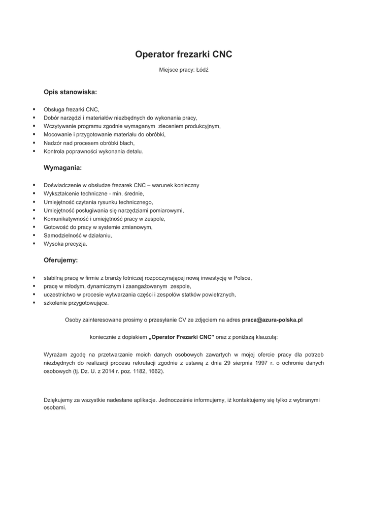 Operator frezarki CNC Miejsce pracy: Łódź Opis stanowiska: Obsługa frezarki CNC, Dobór narzędzi i materiałów niezbędnych do wykonania pracy, Wczytywanie programu zgodnie wymaganym zleceniem produkcyjnym, Mocowanie i przygotowanie materiału do obróbki, Nadzór nad procesem obróbki blach, Kontrola poprawności wykonania detalu. Wymagania: Doświadczenie w obsłudze frezarek CNC – warunek konieczny Wykształcenie techniczne - min. średnie, Umiejętność czytania rysunku technicznego, Umiejętność posługiwania się narzędziami pomiarowymi, Komunikatywność i umiejętność pracy w zespole, Gotowość do pracy w systemie zmianowym, Samodzielność w działaniu, Wysoka precyzja. Oferujemy: stabilną pracę w firmie z branży lotniczej rozpoczynającej nową inwestycję w Polsce, pracę w młodym, dynamicznym i zaangażowanym zespole, uczestnictwo w procesie wytwarzania części i zespołów statków powietrznych, szkolenie przygotowujące. Osoby zainteresowane prosimy o przesyłanie CV ze zdjęciem na adres [email protected] koniecznie z dopiskiem „Operator Frezarki CNC” oraz z poniższą klauzulą: Wyrażam zgodę na przetwarzanie moich danych osobowych zawartych w mojej ofercie pracy dla potrzeb niezbędnych do realizacji procesu rekrutacji zgodnie z ustawą z dnia 29 sierpnia 1997 r. o ochronie danych osobowych (tj. Dz. U. z 2014 r. poz. 1182, 1662). Dziękujemy za wszystkie nadesłane aplikacje. Jednocześnie informujemy, iż kontaktujemy się tylko z wybranymi osobami.