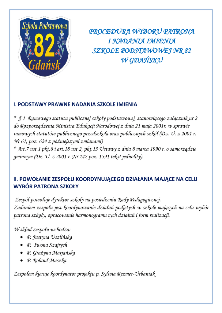PROCEDURA WYBORU PATRONA I NADANIA IMIENIA SZKOLE PODSTAWOWEJ NR 82 W GDAŃSKU I. PODSTAWY PRAWNE NADANIA SZKOLE IMIENIA * § 1 Ramowego statutu publicznej szkoły podstawowej, stanowiącego załącznik nr 2 do Rozporządzenia Ministra Edukacji Narodowej z dnia 21 maja 2001r. w sprawie ramowych statutów publicznego przedszkola oraz publicznych szkół (Dz. U. z 2001 r. Nr 61, poz. 624 z późniejszymi zmianami) * Art.7 ust.1 pkt.8 i art.18 ust 2, pkt.15 Ustawy z dnia 8 marca 1990 r. o samorządzie gminnym (Dz. U. z 2001 r. Nr 142 poz. 1591 tekst jednolity). II. POWOŁANIE ZESPOŁU KOORDYNUJĄCEGO DZIAŁANIA MAJĄCE NA CELU WYBÓR PATRONA SZKOŁY Zespół powołuje dyrektor szkoły na posiedzeniu Rady Pedagogicznej. Zadaniem zespołu jest koordynowanie działań podjętych w szkole mających na celu wybór patrona szkoły, opracowanie harmonogramu tych działań i form realizacji. W skład zespołu wchodzą: P. Justyna Uszlińska P. Iwona Szajrych P. Grażyna Marjańska P. Roland Maszka Zespołem kieruje koordynator projektu p. Sylwia Rezmer-Urbaniak III. REGULAMIN WYBORU PATRONA SZKOŁY ZASADY: 1. W wyborach bierze udział cała społeczność szkolna. 2. Wybory patrona szkoły przeprowadzone są według ustalonych procedur. 3. Dyrektor szkoły wyznacza osoby odpowiedzialne za realizację zadań szczegółowych. 4. Terminy realizacji poszczególnych etapów ustala powołany zespół przy udziale dyrektora szkoły. 5. Informacje o wyborze patrona szkoły oraz wyniki poszczególnych etapów zostaną umieszczone na szkolnej tablicy informacyjnej i stronie internetowej szkoły. 6. Protokół z realizacji projektu wraz z wnioskiem o nadanie szkole imienia zostanie przekazany do Wydziału Rozwoju Społecznego Urzędu Miejskiego w Gdańsku. 7. Szkoła oczekuje na akceptację władz miasta. IV. PROCEDURA WYBORU PATRONA W SZKOLE PODSTAWOWEJ NR 82 W GDAŃSKU 1. W procesie wyboru patrona szkoły uczestniczą uczniowie klas 0-6, rodzice, nauczyciele i pracownicy szkoły. 2. Każda społeczność przedstawia swojego kandydata. 3. Nad przebiegiem wyboru patrona przez rodziców czuwa przewodniczący Rady Rodziców. 4. Nad przebiegiem wyboru patrona przez uczniów szkoły czuwają wychowawcy klas i Samorząd Uczniowski wraz z opiekunem p. Rolandem Maszka. 5. Nad przebiegiem wyboru patrona przez nauczycieli i pracowników szkoły czuwa wyznaczony członek zespołu koordynującego - p. Iwona Szajrych. 6. Nad przebiegiem wyboru patrona w klasach 0-3 czuwa wyznaczony członek zespołu koordynującego – p. Grażyna Marjańska, która zbiera protokoły z wyborów w tych klasach i przekazuje informację o wybranych kandydatach (wraz z prezentacjami wybranych kandydatów) Samorządowi Uczniowskiemu. 7. Nad przebiegiem wyboru patrona w klasach 4-6 czuwa wyznaczony członek zespołu koordynującego – p. Justyna Uszlińska, która zbiera protokoły z wyborów w tych klasach i przekazuje informację o wybranych kandydatach (wraz z prezentacjami wybranych kandydatów) Samorządowi Uczniowskiemu. Wybory są trzyetapowe: ETAP I (23 X 2014 – 20 XI 2014) 1. Wybór kandydata na patrona przez uczniów: Wychowawcy klas przeprowadzają lekcje wychowawcze związane z wyborem kandydata na patrona szkoły. Uczniowie wyszukują kandydatów i prezentują ich całej klasie. W drodze tajnego głosowania klasa wybiera jednego kandydata (największą liczbą głosów). Gospodarz klasy (wychowawca w klasach 0-3) sporządza protokół z głosowania i przekazuje go przewodniczącemu SU wraz z prezentacją wybranego kandydata na patrona. Samorząd Uczniowski przygotowuje gazetkę ścienną prezentującą sylwetki kandydatów z materiałów przekazanych przez poszczególne klasy. Samorząd Uczniowski przeprowadza tajne głosowanie, w wyniku którego wyłoniony zostaje jeden kandydat na patrona szkoły (największą liczbą głosów), z przebiegu głosowania sporządza protokół. 2. Wybór kandydata na patrona przez nauczycieli i pracowników szkoły. Nauczyciele i pracownicy szkoły zgłaszają swoich kandydatów członkowi zespołu koordynującego – p. Iwonie Szajrych. Spośród zgłoszonych propozycji nauczyciele i pracownicy szkoły, poprzez tajne głosowanie, wybierają jednego kandydata (z największą liczbą głosów). Pani Iwona Szajrych sporządza protokół z wyborów. 3. Wybór kandydata na patrona przez rodziców. Dyrektor szkoły informuje rodziców o realizacji projektu. Rodzice przekazują swoje propozycje przewodniczącemu Rady Rodziców ( kartki ze zgłaszanymi kandydaturami należy wkładać do urny znajdującej się w sekretariacie). 19 listopada 2014 r. Rada Rodziców przeprowadza głosowanie – spośród kandydatów wybiera jednego, z największą liczbą głosów. Sporządza protokół i przekazuje go p. Sylwii Rezmer- Urbaniak. ETAP II (20 XI 2014 – 20 XII 2014) 1. Prezentacja kandydatów. Zespół koordynujący wraz z Samorządem Uczniowskim przygotowuje prezentację trzech kandydatów wybranych przez uczniów ( 1), rodziców (1) , nauczycieli i pracowników szkoły (1) np. w formie wystawy, apelu. 2. Wybory ogólnoszkolne 18 grudnia 2014 r. odbędą się tajne wybory patrona szkoły. a) W godzinach lekcyjnych na jednego z trzech kandydatów głosują uczniowie, nauczyciele i pracownicy szkoły. b) W godzinach popołudniowych głosują rodzice . Każda osoba jest uprawniona do oddania jednego głosu. 3. Na przebiegiem głosowania czuwa komisja w składzie: - Dyrektor - przedstawiciel Rady Pedagogicznej – koordynator projektu lub osoba wskazana przez dyrektora szkoły, - przedstawiciel Rady Rodziców – przewodniczący lub zastępca, - przedstawiciel Samorządu Uczniowskiego – przewodniczący lub zastępca. 4. Po ustaleniu wyników wyborów zespół koordynujący sporządza protokół z głosowania. ETAP III (20 XII 2014 – 30 I 2015) 1. Podjęcie uchwały przez Radę Pedagogiczną o nadaniu szkole imienia wybranego patrona. 2. Przygotowanie wniosku o nadanie szkole imienia do Urzędu Miejskiego.