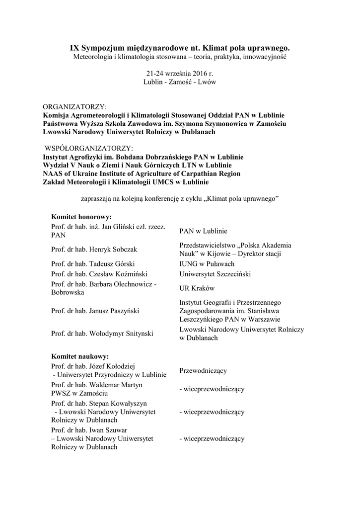 IX Sympozjum międzynarodowe nt. Klimat pola uprawnego. Meteorologia i klimatologia stosowana – teoria, praktyka, innowacyjność 21-24 września 2016 r. Lublin - Zamość - Lwów ORGANIZATORZY: Komisja Agrometeorologii i Klimatologii Stosowanej Oddział PAN w Lublinie Państwowa Wyższa Szkoła Zawodowa im. Szymona Szymonowica w Zamościu Lwowski Narodowy Uniwersytet Rolniczy w Dublanach WSPÓŁORGANIZATORZY: Instytut Agrofizyki im. Bohdana Dobrzańskiego PAN w Lublinie Wydział V Nauk o Ziemi i Nauk Górniczych LTN w Lublinie NAAS of Ukraine Institute of Agriculture of Carpathian Region Zakład Meteorologii i Klimatologii UMCS w Lublinie zapraszają na kolejną konferencję z cyklu „Klimat pola uprawnego” Komitet honorowy: Prof. dr hab. inż. Jan Gliński czł. rzecz. PAN Prof. dr hab. Henryk Sobczak Prof. dr hab. Tadeusz Górski Prof. dr hab. Czesław Koźmiński Prof. dr hab. Barbara Olechnowicz Bobrowska Prof. dr hab. Janusz Paszyński Prof. dr hab. Wołodymyr Snitynski Komitet naukowy: Prof. dr hab. Józef Kołodziej - Uniwersytet Przyrodniczy w Lublinie Prof. dr hab. Waldemar Martyn PWSZ w Zamościu Prof. dr hab. Stepan Kowałyszyn - Lwowski Narodowy Uniwersytet Rolniczy w Dublanach Prof. dr hab. Iwan Szuwar – Lwowski Narodowy Uniwersytet Rolniczy w Dublanach PAN w Lublinie Przedstawicielstwo „Polska Akademia Nauk” w Kijowie – Dyrektor stacji IUNG w Puławach Uniwersytet Szczeciński UR Kraków Instytut Geografii i Przestrzennego Zagospodarowania im. Stanisława Leszczyńkiego PAN w Warszawie Lwowski Narodowy Uniwersytet Rolniczy w Dublanach Przewodniczący - wiceprzewodniczący - wiceprzewodniczący - wiceprzewodniczący Członkowie: Prof. dr hab. Małgorzata Czarnecka Prof. dr hab. Andrzej Doroszewski Prof. dr hab. Jan Grabowski Prof. dr hab. Krystyna Grabowska Prof. dr hab. Cezary Sławiński Prof. dr hab. Kazimierz Kłysik Prof. dr hab. Stepan Miahkota Prof. dr hab. Bożena Michalska Prof. dr hab. Janusz Miczyński Prof. dr hab. Tadeusz Niedźwiedź Prof. dr hab. Janusz Olejnik Prof. dr hab. Marian Rojek Dr hab. Andrzej Samborski prof. nadzw. Prof. dr hab. Grigory Sedilo Prof. dr hab. Zbigniew Szwejkowski Dr hab. inż. Joanna Bac-Bronowicz Dr hab. Agnieszka Ziernicka-Wojtaszek Prof. dr hab. Jacek Żarski Prof. dr hab. Elwira Żmudzka Prof. dr hab. Andrzej Żyromski Komitet organizacyjny: Prof. dr hab. Józef Kołodziej – UP w Lublinie Prof. dr hab. Waldemar Martyn – PWSZ w Zamościu Prof. dr hab. Iwan Szuwar – LNUR w Dublanach Prof. dr hab. Michał Kaszewski UMCS w Lublinie Dr hab. Andrzej Samborski – PWSZ w Zamościu Członkowie: Dr inż. Bożena Niemczuk Dr Marek Wiśniewski Dr Alexis Burnayev Dr Antin Szuwar Mgr Vasyl Smiczok Mgr inż. Zbigniew Mazur ZUT w Szczecinie IUNG w Puławach UWM w Olsztynie UWM w Olsztynie Instytut Agrofizyki PAN w Lublinie UŁ w Łodzi Lwowski Narodowy Uniwersytet Rolniczy w Dublanach ZUT w Szczecinie UR w Krakowie UŚ w Katowicach UP w Poznaniu UP we Wrocławiu PWSZ w Zamościu National Academy of Agrarian Sciences of Ukraine Institute of Agriculture of Carpathian Region UWM w Olsztynie PWr we Wrocławiu UR w Krakowie UTP w Bydgoszczy UW w Warszawie UP we Wrocławiu Przewodniczący - wiceprzewodniczący - wiceprzewodniczący - członek honorowy Sekretarz: Ramowy program IX Konferencji: 21 września 2016 r. (przed południem) powitanie uczestników konferencji w siedzibie Instytutu Agrofizyki im. prof. Bohdana Dobrzańskiego PAN w Lublinie, zebranie ogólne Komisji Agrometeorologii i Klimatologii Stosowanej Oddziału PAN w Lublinie, zapoznanie się z laboratoriami agrofizycznymi Instytutu i przejazd do Zamościa, 21 września 2016 r. (po południu) - sesja plenarna w obiektach PWSZ im. Szymona Szymonowica w Zamościu, 22 i 23 września 2016 r.: godziny przedpołudniowe - sesje plenarne we Lwowie, godziny popołudniowe - zwiedzanie Lwowa, sesja terenowa w Jaworowskim Parku Narodowym, 24 września 2016 r. powrót do Zamościa i zakończenie konferencji. Adres Komitetu organizacyjnego Państwowa Wyższa Szkoła Zawodowa im. Szymona Szymonowica w Zamościu Ul. Pereca 2, 22-400 Zamość Harmonogram przygotowań: Zgłoszenie udziału do dnia 31.05.2016 Wniesienie opłaty konferencyjnej do dnia 30.06.2016 Przesłanie komunikatu nr 3 – potwierdzenie uczestnictwa i szczegółowy program konferencji do dnia 31.07.2016 Koszt uczestnictwa w Sympozjum wynosi 350 zł i obejmuje: - druk streszczeń i materiałów konferencyjnych, - wyżywienie i noclegi, - przejazd na trasie Zamość – Lwów – Zamość. Wpłaty należy dokonać na konto nr 63 1240 2005 1111 0010 6777 4121 Państwowa Wyższa Szkoła Zawodowa im. Szymona Szymonowica w Zamościu Z dopiskiem: Klimat pola uprawnego 2016. Szczegółowe informacje dotyczące publikacji – przewidujemy druk w Acta Agrophysica (14 pkt.), Annales UMCS sec. E (9 pkt.), Facta Simonidis (8 pkt.) – opłata we własnym zakresie. Serdecznie pozdrawiam: Andrzej Samborski