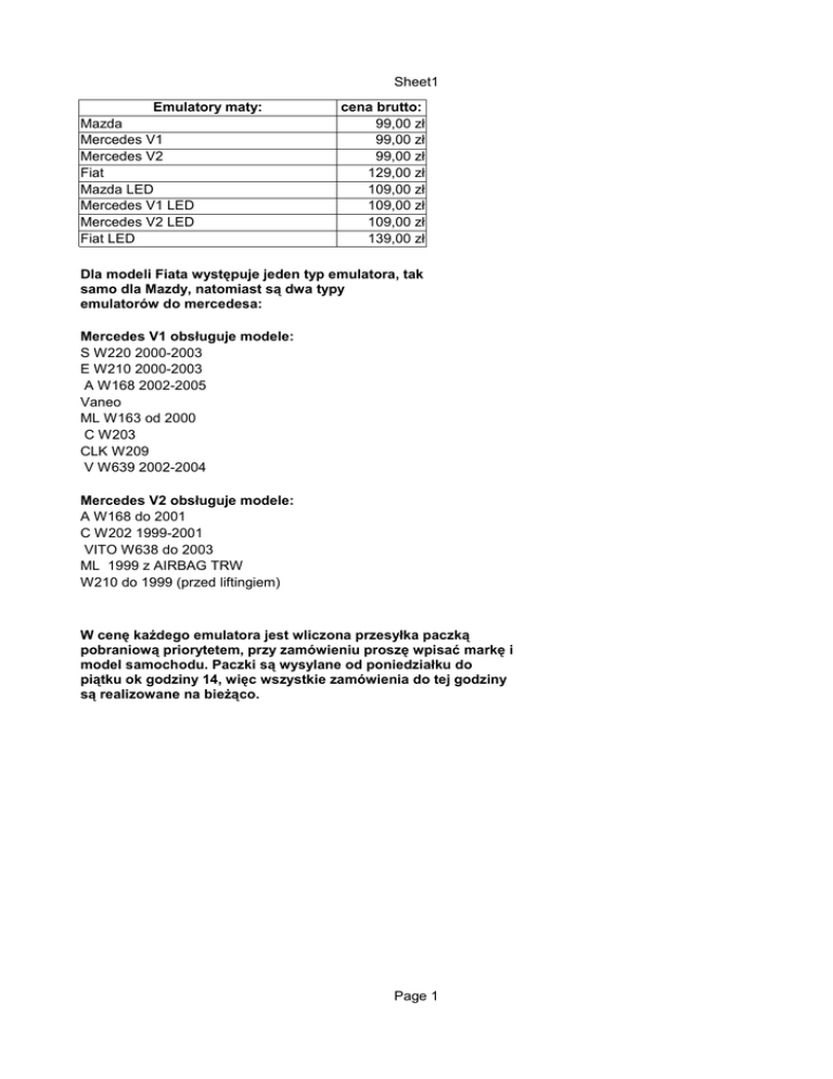 Sheet1 Emulatory maty: Mazda Mercedes V1 Mercedes V2 Fiat Mazda LED Mercedes V1 LED Mercedes V2 LED Fiat LED cena brutto: 99,00 zł 99,00 zł 99,00 zł 129,00 zł 109,00 zł 109,00 zł 109,00 zł 139,00 zł Dla modeli Fiata występuje jeden typ emulatora, tak samo dla Mazdy, natomiast są dwa typy emulatorów do mercedesa: Mercedes V1 obsługuje modele: S W220 2000-2003 E W210 2000-2003 A W168 2002-2005 Vaneo ML W163 od 2000 C W203 CLK W209 V W639 2002-2004 Mercedes V2 obsługuje modele: A W168 do 2001 C W202 1999-2001 VITO W638 do 2003 ML 1999 z AIRBAG TRW W210 do 1999 (przed liftingiem) W cenę każdego emulatora jest wliczona przesyłka paczką pobraniową priorytetem, przy zamówieniu proszę wpisać markę i model samochodu. Paczki są wysylane od poniedziałku do piątku ok godziny 14, więc wszystkie zamówienia do tej godziny są realizowane na bieżąco. Page 1