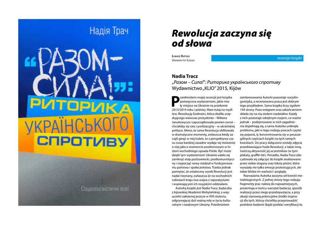 Rewolucja zaczyna się od słowa Łukasz Kutyło Uniwersytet Łódzki recenzja książki Nadia Tracz „Разом – Сила!”: Риторика українського спротиву Wydawnictwo „KLIO” 2015, Kijów P rzedmiotem mojej recenzji jest książka poświęcona wydarzeniom, jakie miały miejsce na Ukrainie na przełomie 2013/2014 roku i później. Mam tutaj na myśli tzw. Rewolucję Godności, która obaliła urzędującego wówczas prezydenta – Wiktora Janukowycza i zapoczątkowała pewien zwrot – chciałoby się rzec cywilizacyjny – w ukraińskiej polityce. Mimo, że sama Rewolucja obfitowała w dramatyczne momenty, zwłaszcza kiedy zaczęli ginąć w niej ludzie, to z perspektywy czasu coraz bardziej zasadne wydaje się mówienie o niej jako o momencie przełomowym w historii wschodniego sąsiada Polski. Być może dzięki tym wydarzeniom Ukrainie udało się zamknąć etap postsowiecki, postkomunistyczny i rozpocząć nowy rozdział w funkcjonowaniu państwa i społeczeństwa. Trzeba jednak pamiętać, że ostateczny wynik Rewolucji jest nadal nieznany, zwłaszcza że na wschodnich rubieżach kraju twa wojna z separatystami i wspierającymi ich rosyjskimi oddziałami. Autorką książki jest Nadia Tracz, badaczka z kijowskiej Akademii Mohylańskiej, a więc uczelni założonej jeszcze w XVII stuleciu, odgrywającej dziś ważną rolę w życiu kulturalnym i naukowym Ukrainy. Przedmiotem zainteresowania Autorki pozostaje socjolingwistyka, a recenzowana praca jest dobrym tego przykładem. Sama książka liczy ogółem 144 strony. Poza wstępem oraz zakończeniem składa się na nią siedem rozdziałów. Każdy z nich pozostaje odrębnym esejem, co ważne jednak – podejmowane w nich zagadnienia dopełniają się, a sama Autorka uniknęła problemu, jaki w tego rodzaju pracach często się pojawia, tj. koncentrowania się w poszczególnych częściach książki na tych samych kwestiach. Do pracy dołączone zostały zdjęcia przedstawiające hasła Rewolucji, a także inną, twórczą aktywność jej uczestników (w tym: plakaty, graffiti itd.). Ponadto, Nadia Tracz zdecydowała się załączyć do książki analizowane przez siebie slogany oraz teksty pieśni, które wyrażały nie tylko emocje protestujących, ale także bliskie im wartości i poglądy. Rozważania Autorka zaczyna od kwestii metodologicznych. Z jednej strony tego rodzaju fragmenty prac należą do najważniejszych, prezentują w końcu warsztat badacza, sposób realizacji przez niego przedsięwzięcia, a przy okazji stanowią potencjalne źródło inspiracji dla tych, którzy chcieliby przeprowadzić podobne badanie (bądź poddać weryfikacji te, Recenzja książki „«Разом - Сила!»: Риторика українського спротиву” które w danej pracy jest omawiane). Z drugiej jednak rozważania w tym względzie nierzadko są trudne do zrozumienia, zwłaszcza dla osoby, która nie jest obeznana z teoretycznymi i metodologicznymi aspektami podejścia wybranego przez autora, a zdarza się też, że tego rodzaju refleksje są po prostu nudne. Biorąc pod uwagę te zastrzeżenia można stwierdzić, że Nadia Tracz dobrze poradziła sobie z tym problemem. Nie ignoruje skądinąd ważnych założeń metodologicznych, ale zarazem też nie zanudza Czytelnika, nie wchodzi w szczegóły, które byłyby właściwsze dla artykułu naukowego, wprost przeznaczonego dla specjalistów w danej dziedzinie. Autorka informuje, że przedmiotem jej badania były slogany, jakie pojawiły się podczas Rewolucji Godności, a także w okresie po niej następującym, kiedy doszło do aneksji Krymu przez Rosję oraz do wojny w Donbasie. Nadii Tracz udało się przeanalizować ogółem ponad 800 zebranych przez nią haseł. Tutaj należy podkreślić, że Autorka nie ukrywa swojego udziału w Rewolucji i zaangażowania na rzecz sprawy, którą wydarzenia na Majdanie Niezależności zapoczątkowały. Uczciwie informuje o tym Czytelnika, a zarazem wskazuje, że przemyślenia i wnioski do jakich dochodzi nie są obiektywne i takie być nie mogą. I dobrze, że tak jest. Trudno sobie wyobrazić zimny, akademicki wykład toczący się wokół wydarzeń tak istotnych dla własnego kraju, tak dramatycznych w swym przebiegu i konsekwencjach. Punktem wyjścia dla swej analizy Autorka uczyniła teorię dyskursu opracowaną przez Theo van Dijka. Jej celem stało się prześledzenie tego, w jaki sposób ludzie zgromadzeni na kijowskim Majdanie konstruowali wiedzę na swój temat oraz na temat przeciwnika – obozu rządowego, a także jaką rolę w tym procesie odegrał język. Z punktu widzenia socjologicznego jest to ciekawy przykład transformacji quasi-grupy, a więc zbiorowości, której nie łączy jeszcze wspólnota celów i wartości, a jedynie niepewna, emocjonalna zazwyczaj reakcja na pewne wydarzenie czy okoliczności, w grupę interesu, a więc zbiorowość ludzi świadomych swego położenia i mających jasno zdefiniowane oczekiwania. Innymi słowy, Autorka uczyniła przedmiotem swojego zainteresowania to, jak język wpływał na zachowania protestujących i odwrotnie, jak ludzie uczestniczący w walkach przeciwko rządowi używali języka do wyrażenia swych interesów, do ekspresji swych emocji. Mimo, że celem Nadii Tracz nie było prześledzenie kolejnych etapów tego procesu, uchwycenie dynamiki opisywanego przez nią konfliktu społecznego, a jedynie zobrazowanie zależności istniejących między językiem a działaniem (w myśl kognitywnych założeń wybranego przez nią podejścia), to i tak Czytelnik uzyskuje pewien obraz zmian, jakie następowały w toku wydarzeń. Z punktu widzenia polskiego odbiorcy ważne wydaje się to, że Autorka umieszcza swe refleksje w określonym kontekście społecznym i historycznym. Zyskuje na tym recenzowana praca, mającą w związku z tym interdyscyplinarny charakter. Ze względu na to, że moim celem nie jest szczegółowe zreferowanie omawianej