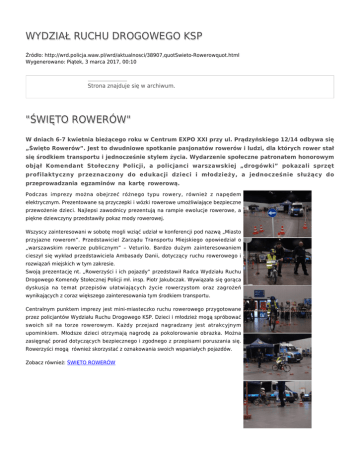WYDZIAŁ RUCHU DROGOWEGO KSP Źródło: http://wrd.policja.waw.pl/wrd/aktualnosci/38907,quotSwieto-Rowerowquot.html Wygenerowano: Piątek, 3 marca 2017, 00:10 Strona znajduje się w archiwum. "ŚWIĘTO ROWERÓW" W dniach 6-7 kwietnia bieżącego roku w Centrum EXPO XXI przy ul. Prądzyńskiego 12/14 odbywa się „Święto Rowerów”. Jest to dwudniowe spotkanie pasjonatów rowerów i ludzi, dla których rower stał się środkiem transportu i jednocześnie stylem życia. Wydarzenie społeczne patronatem honorowym objął Komendant Stołeczny Policji, a policjanci warszawskiej „drogówki” pokazali sprzęt profilaktyczny przeznaczony do edukacji dzieci i młodzieży, a jednocześnie służący do przeprowadzania egzaminów na kartę rowerową. Podczas imprezy można obejrzeć różnego typu rowery, również z napędem elektrycznym. Prezentowane są przyczepki i wózki rowerowe umożliwiające bezpieczne przewożenie dzieci. Najlepsi zawodnicy prezentują na rampie ewolucje rowerowe, a piękne dziewczyny przedstawiły pokaz mody rowerowej. Wszyscy zainteresowani w sobotę mogli wziąć udział w konferencji pod nazwą „Miasto przyjazne rowerom”. Przedstawiciel Zarządu Transportu Miejskiego opowiedział o „warszawskim rowerze publicznym” – Veturilo. Bardzo dużym zainteresowaniem cieszył się wykład przedstawiciela Ambasady Danii, dotyczący ruchu rowerowego i rozwiązań miejskich w tym zakresie. Swoją prezentację nt. „Rowerzyści i ich pojazdy” przedstawił Radca Wydziału Ruchu Drogowego Komendy Stołecznej Policji mł. insp. Piotr Jakubczak. Wywiązała się gorąca dyskusja na temat przepisów ułatwiających życie rowerzystom oraz zagrożeń wynikających z coraz większego zainteresowania tym środkiem transportu. Centralnym punktem imprezy jest mini-miasteczko ruchu rowerowego przygotowane przez policjantów Wydziału Ruchu Drogowego KSP. Dzieci i młodzież mogą spróbować swoich sił na torze rowerowym. Każdy przejazd nagradzany jest atrakcyjnym upominkiem. Młodsze dzieci otrzymają nagrodę za pokolorowanie obrazka. Można zasięgnąć porad dotyczących bezpiecznego i zgodnego z przepisami poruszania się. Rowerzyści mogą również skorzystać z oznakowania swoich wspaniałych pojazdów. Zobacz również: ŚWIĘTO ROWERÓW Ocena: 0/5 (0) Tweetnij