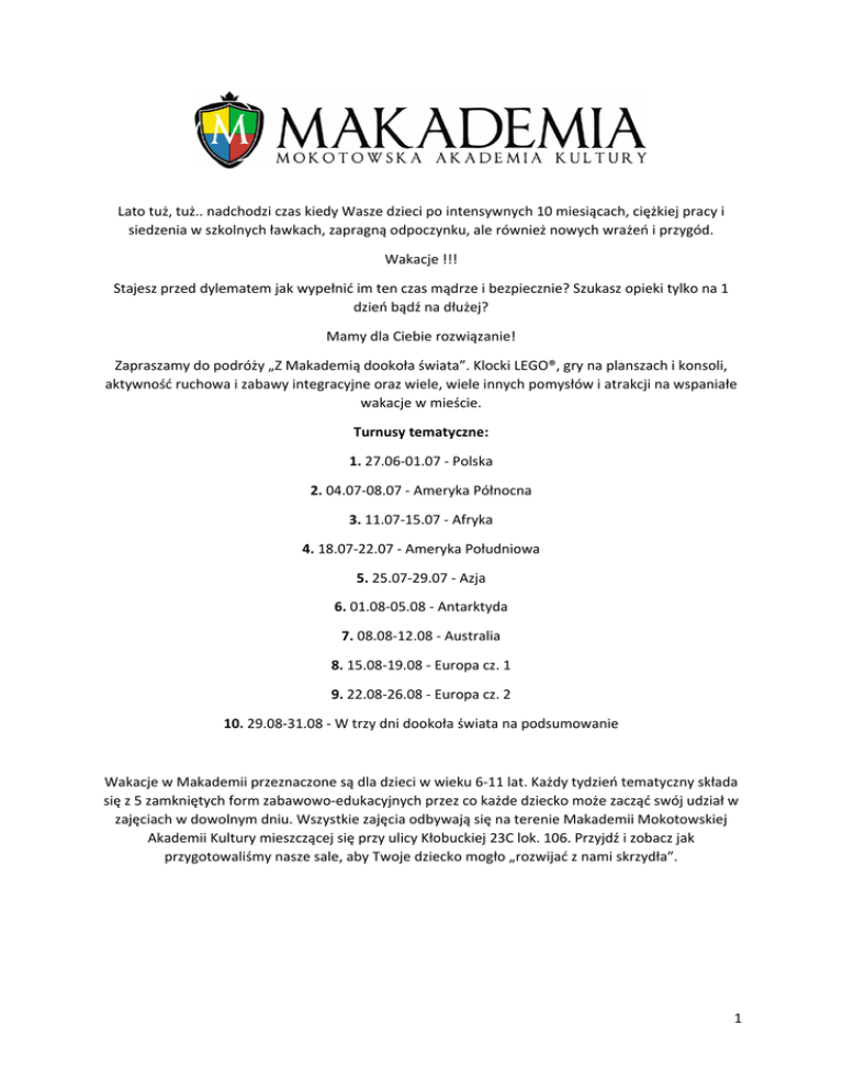 Lato tuż, tuż.. nadchodzi czas kiedy Wasze dzieci po intensywnych 10 miesiącach, ciężkiej pracy i siedzenia w szkolnych ławkach, zapragną odpoczynku, ale również nowych wrażeń i przygód. Wakacje !!! Stajesz przed dylematem jak wypełnić im ten czas mądrze i bezpiecznie? Szukasz opieki tylko na 1 dzień bądź na dłużej? Mamy dla Ciebie rozwiązanie! Zapraszamy do podróży „Z Makademią dookoła świata”. Klocki LEGO®, gry na planszach i konsoli, aktywność ruchowa i zabawy integracyjne oraz wiele, wiele innych pomysłów i atrakcji na wspaniałe wakacje w mieście. Turnusy tematyczne: 1. 27.06‐01.07 ‐ Polska 2. 04.07‐08.07 ‐ Ameryka Północna 3. 11.07‐15.07 ‐ Afryka 4. 18.07‐22.07 ‐ Ameryka Południowa 5. 25.07‐29.07 ‐ Azja 6. 01.08‐05.08 ‐ Antarktyda 7. 08.08‐12.08 ‐ Australia 8. 15.08‐19.08 ‐ Europa cz. 1 9. 22.08‐26.08 ‐ Europa cz. 2 10. 29.08‐31.08 ‐ W trzy dni dookoła świata na podsumowanie Wakacje w Makademii przeznaczone są dla dzieci w wieku 6‐11 lat. Każdy tydzień tematyczny składa się z 5 zamkniętych form zabawowo‐edukacyjnych przez co każde dziecko może zacząć swój udział w zajęciach w dowolnym dniu. Wszystkie zajęcia odbywają się na terenie Makademii Mokotowskiej Akademii Kultury mieszczącej się przy ulicy Kłobuckiej 23C lok. 106. Przyjdź i zobacz jak przygotowaliśmy nasze sale, aby Twoje dziecko mogło „rozwijać z nami skrzydła”. 1 Ramowy rozkład dnia zajęć wakacyjnych w Makademii: 8.00 – 8.30 schodzenie się uczestników półkolonii, zabawy integracyjne 8.30 ‐ 9.30 aktywności poznawcze – wprowadzenie w temat tygodnia/dnia (m.in. pokazy slajdów, ciekawostki, zagadki, quizy, zabawy z mapą i globusem, mind mapping, „burza mózgów”) 9.30 – 10.00 II śniadanie przyniesione przez uczestników; 10.00 – 11.30 budujemy z klockami LEGO – zgodnie z tematyką dnia 11.30 – 12.00 aktywności ruchowe (ćwiczymy, gramy, tańczymy na naszej Sali ruchowej) 12.00 – 12.30 obiad – catering 12.30 – 12.45 relaks poobiedni przy książce 12.45 – 14.00 tworzymy (aktywności plastyczne) 14.00 – 15.00 czas na gry zespołowe, gry planszowe, gry na konsoli i wiele, wiele innych zabaw integrujących grupę, a wszystko w tematyce LEGO; 15.00 – 16.00 układanie przez uczestników ulubionych zestawów z LEGO dostępnych w Sali Zabaw z LEGO Education. „Z Makademią dookoła świata” Zadajecie sobie pytanie co będziemy robić podczas każdego z turnusów? Już odpowiadamy :) Polska (27.06‐01.07) Naszą podróż zaczniemy od najpiękniejszego kraju na świecie. Podczas naszej podróży poznamy ciekawe legendy. Dziewczynki zamienią się w Syrenkę obrończynie Warszawy, a chłopcy w strasznego Smoka Wawelskiego, wsiądziemy do bryczki i zwiedzimy uliczki Krakowa, wsłuchamy się w hejnał mariacki i poszukamy Lajkonika, dowiemy się dlaczego na jednym z dachów w Polsce od lat trykają się koziołki i w którym mieście w Polsce można na ulicach spotkać krasnoludki, kto wie może nawet poszukamy na plaży bursztynów? Spróbujemy swoich sił w wycinankach łowickich. Pełni energii zatańczymy krakowiaka, oberka i kujawiaka. Zbudujemy Pałac Kultury z LEGO. Ameryka Północna (04.07‐08.07) Staniemy się odkrywcami, przemierzymy Ocean Atlantycki i jak Kolumb odkryjemy nowy ląd. Zbudujemy tipi, totem, zrobimy maski i będziemy bawić się w Indian. Poszukamy złota, poznamy kulturę majów. Potańczymy do muzyki z filmu Grease. Założymy kapelusze, zrobimy odznaki szeryfa i krokiem country złapiemy na lasso mustanga. Zrobimy własny Manhattan, sprawdzimy jak wysoka jest Statua Wolności i czego jest symbolem. Zbudujemy z LEGO wymarzony park rozrywki. Dowiemy się gdzie znajduje się największa niezamieszkana wyspa na Ziemi. Afryka (11.07‐15.07) Wyruszymy jak bociany z Europy na zimę do Afryki. Poznamy jak bardzo ląd Afryki jest tajemniczy i dziki. Wytropimy na sawannie zebrę czujną i lwa co ma grzywę bujną. Dowiemy się co trzeba zabrać na safari. Będziemy się wspinać na Kilimandżaro. Poszukamy wiosek w buszu, gdzie plemiona mieszkają i jak szamani przywołamy deszcz. Pobawimy się do piosenki „Simamaka” i sprawdzimy swój refleks. 2 Będziemy pisać hieroglify i zbudujemy piramidę z LEGO. Przejdziemy labirynty, spotkamy mumie i na koniec znajdziemy skarb Faraona. Dowiemy się co to jest otjikayiva i kto je nosi. Ameryka Południowa (18.07‐22.07) Będziemy jak Robinson Crusoe i zbudujemy tratwę. Poznamy zwierząt bez liku barwne papugi, kolibry, centkowane jaguary, oceloty i kopibary. Będziemy tańczyć jak w karnawale… sambę, cza‐czę czyli stworzymy własny brazylijski szał. Poczujemy się jak piłkarze i rozegramy mecz. Dowiemy się co to jest pismo węzełkowe i kto się nim posługiwał. Zrobimy rondador, czyli narodowy instrument Ekwadorczyków. Zbudujemy z LEGO domy na palach. Azja (25.07‐29.07) Sprawdzimy co najbardziej się złoci w Azji i czy jest to właśnie Tadż Mahal. Dziewczyny założą sari a chłopcy turbany. Poczujemy się jak w herbacianym raju i nauczymy się parzyć herbatę. Poruszamy się w tańcu Jasminy. Będziemy skradać się jak ninja. Dowiemy się jaki owoc ma najbardziej odrażający zapach, a jednocześnie jest jednym z najpyszniejszych owoców oraz co to za święta Hina Matsuri i Tango no Sekku. Namalujemy pandę wielką. Zbudujemy z LEGO Wieże Żółtego Żurawia z Chin. Antarktyda (01.08‐05.08) Na Antarktydzie będziemy nadawać sygnałem znaków Morse’a. Stworzymy z LEGO stację badawczą na biegunie południowym. Wyruszymy na wyprawę badawczą. Sprawdzimy jak duże są pingwiny cesarskie i spróbujemy je namalować stopami. Zbudujemy igloo. Zrobimy własny wulkan Erebus. Dowiemy się gdzie jest najzimniejsze miejsce na ziemi i co tam się znajduje. Australia (08.08‐12.08) Migiem pobiegniemy do Australii jak prawdziwe strusie. Nauczymy się utrzymywać równowagę, która jest potrzebna 